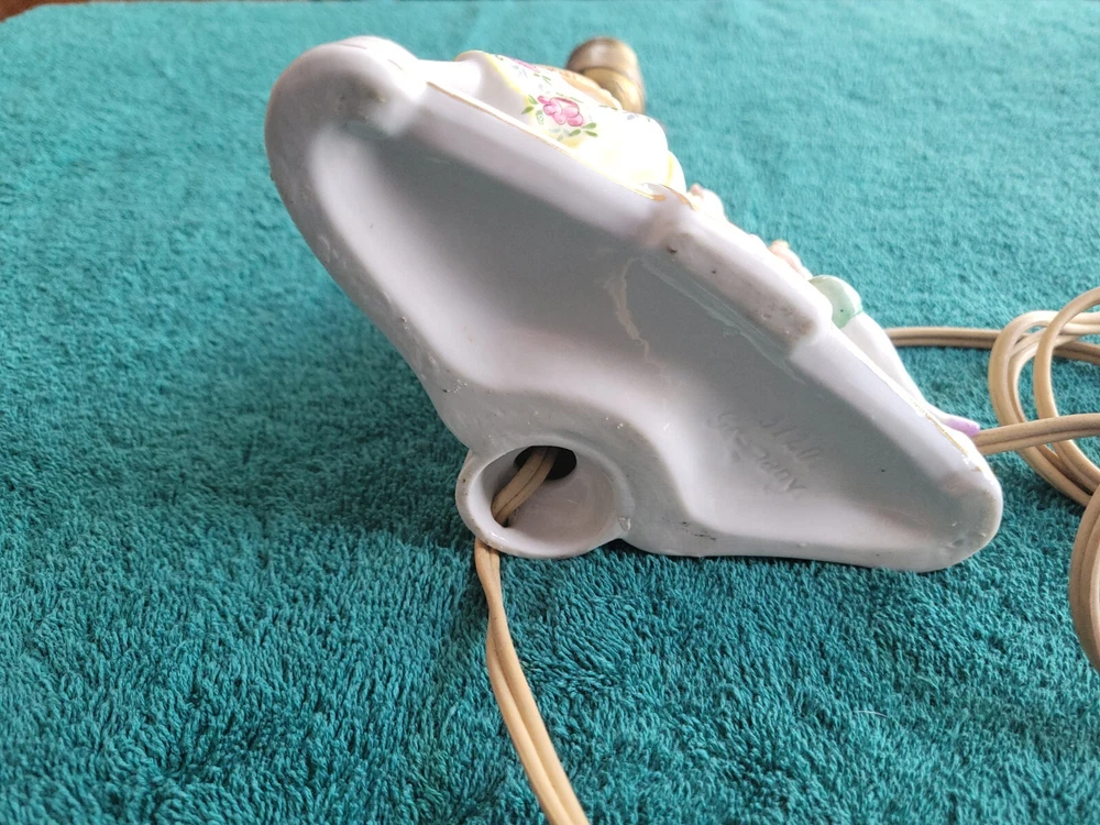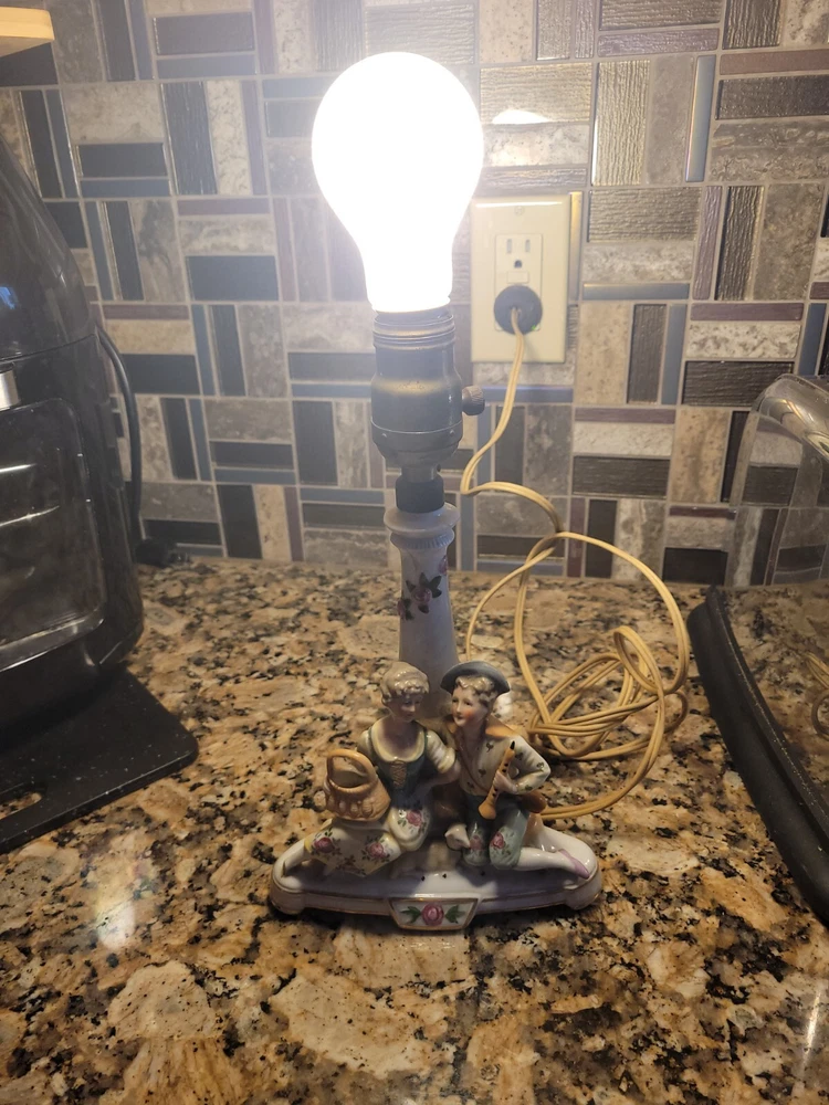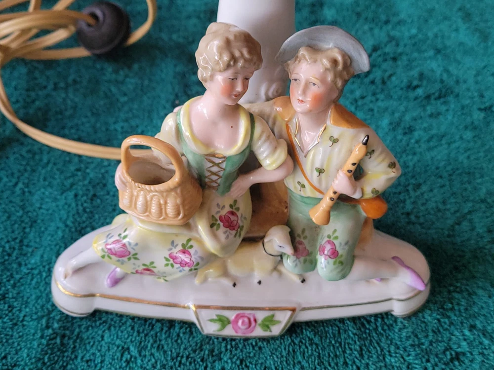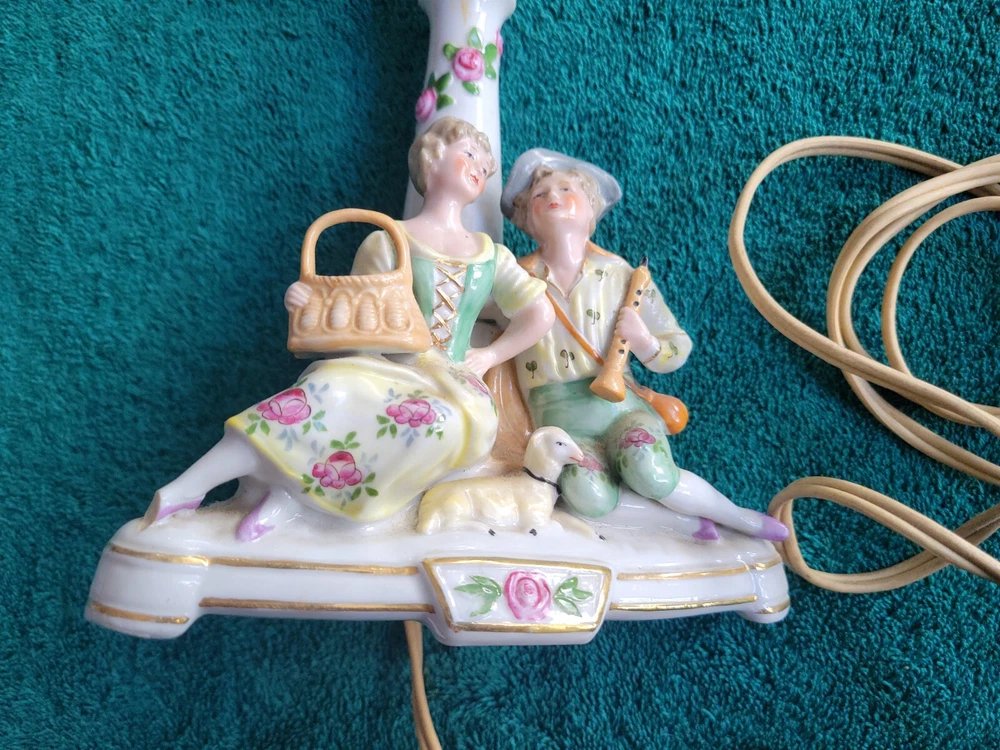 Antique/vintage victorian porcelain boudoir lamp with shade. In original condition, featuring a young couple with a lamb. The lamp is handpainted with a Germany 3120 backstamp. There is also an H at the rear of the lamp. The light has been tested and works. Does not include the light bulb. The lamp without the shade measures 11"H. The lamp base is 6" x 3.5". There is yellowing on the porcelain at the top and where the socket meets the lamp and a small crack. The end of the young girl's foot is missin. See photos. The clamp-on shade is drum style with frills. Measures 7.75"H x 5.75 across. Both the lamp and shade could use cleaning. This is an antique/vintage item and sold as is. Refer to the photos and enlarge for condition. Requests for additional information or photos may be emailed.