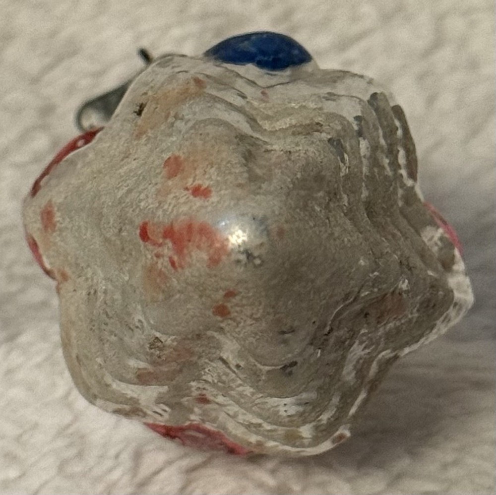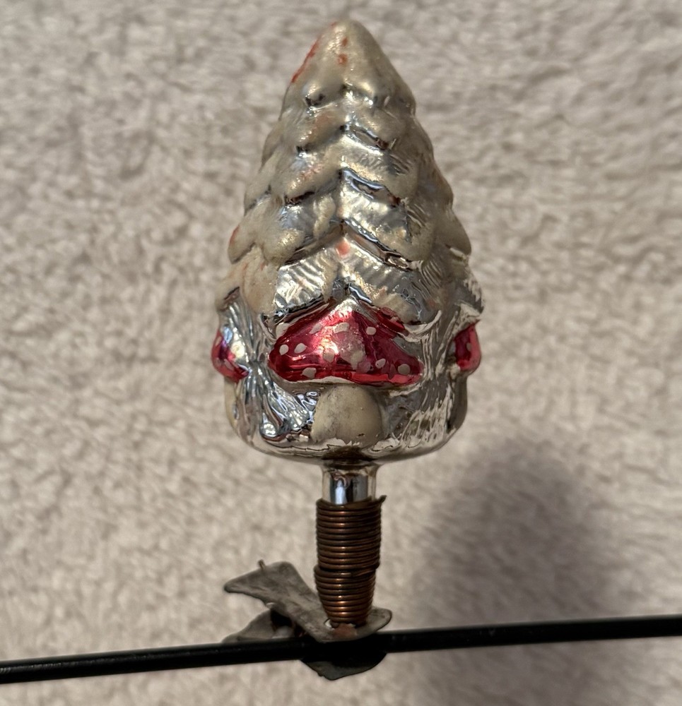 Antique early 1900s silver,blue,red&white multicolor hand painted mica mercury glass gnome&mushrooms on a tree clip on German Christmas tree ornament 4” old production Will combine shipping, check out other offers!