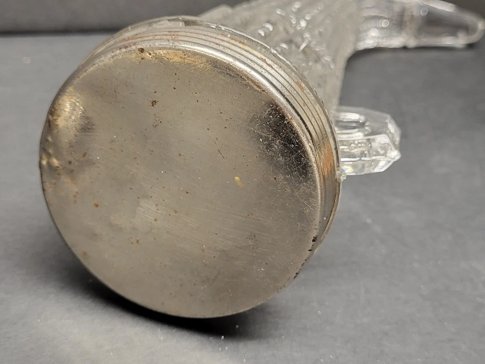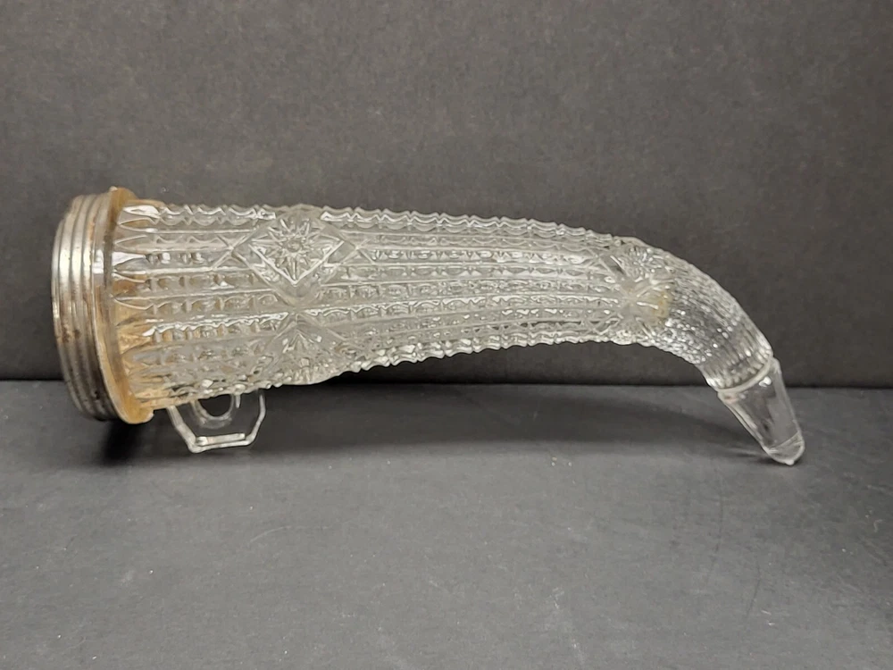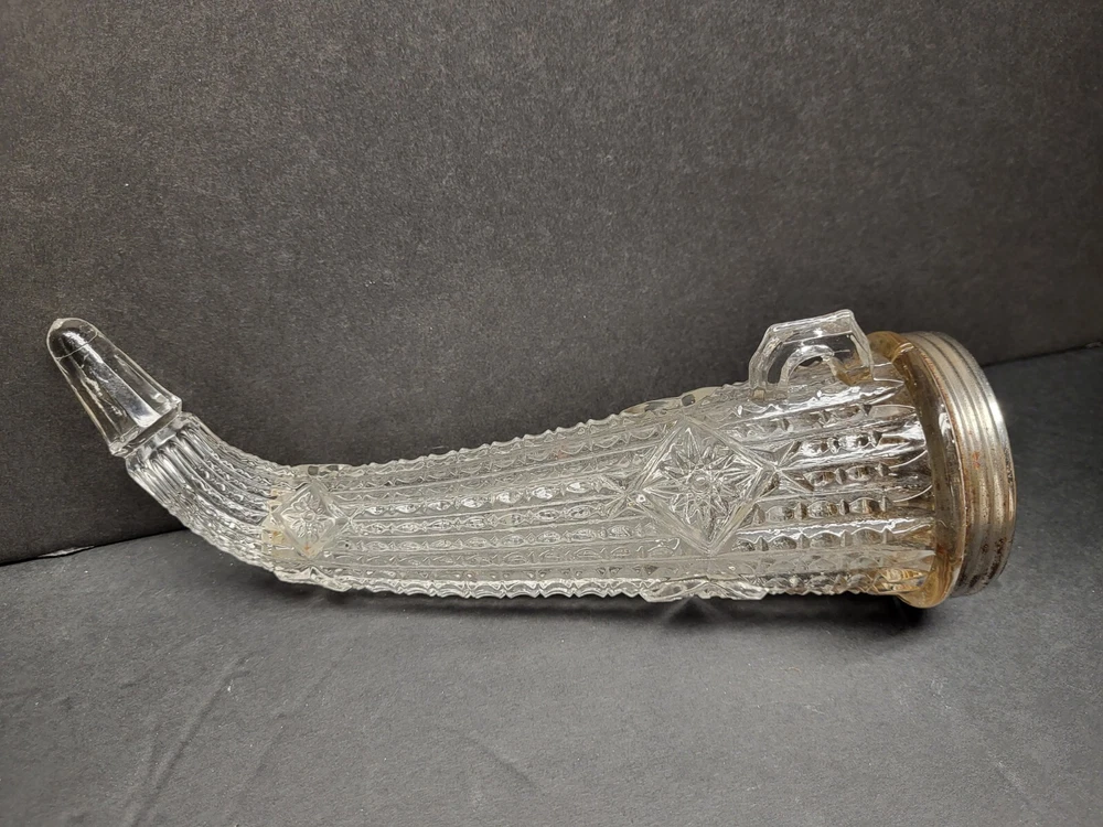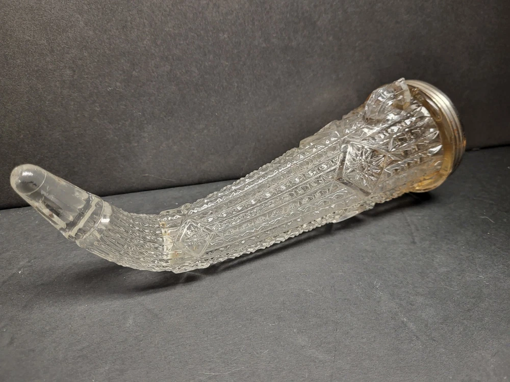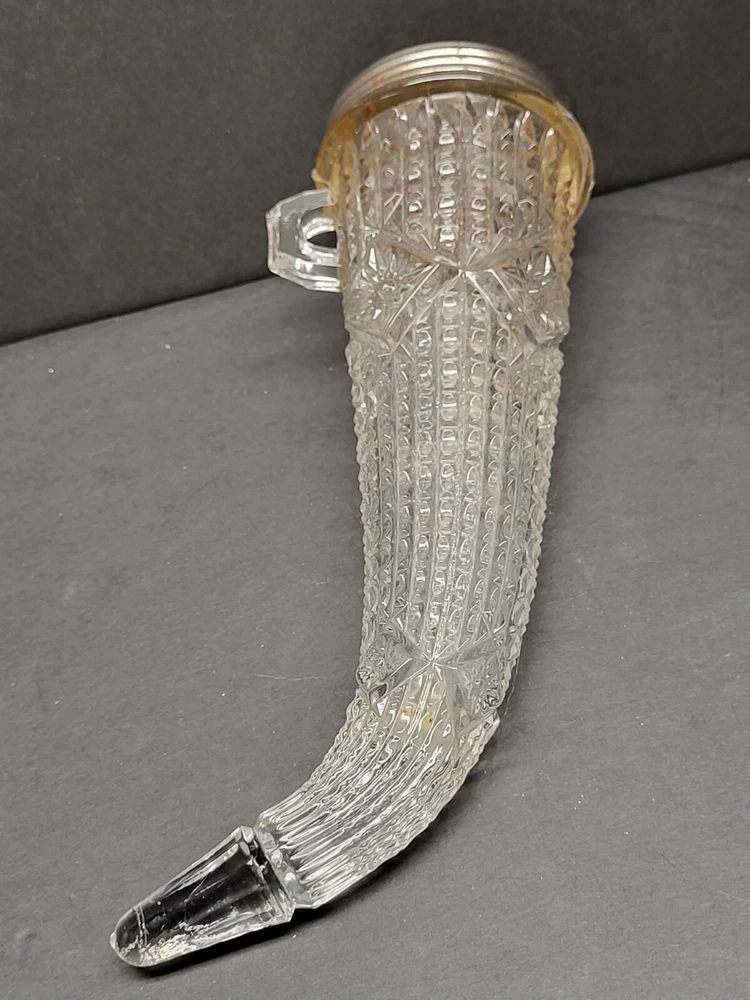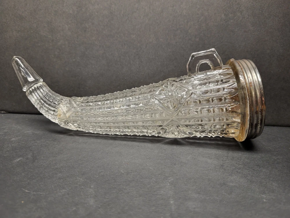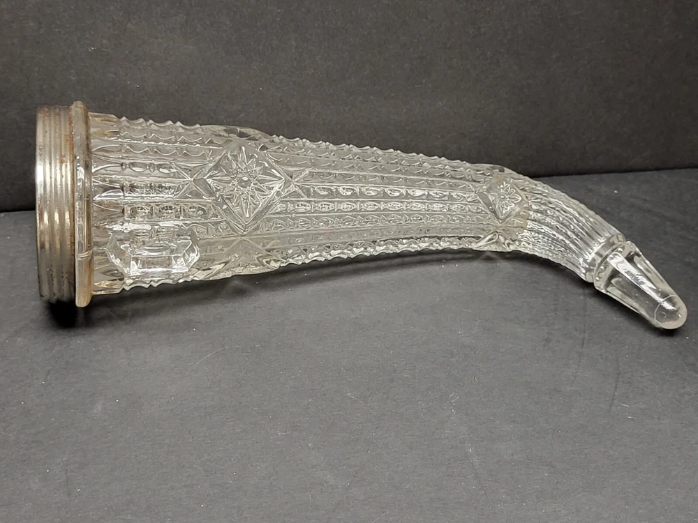 Antique Glass Horn Candy Container EAPG Victory Glass Company. The Victory Glass Company was founded in Jeannette Pennsylvania in 1919. The company was known for their glass toys containing candies and nuts. The company fell victim to the Great Depression and reorganized in 1937. The company came back strong, continuing the production of their candy containers and widening their offerings with household goods. One of their container designers is this glass horn. The shape emulates a Viking drinking horn that would originally be carved from animal bone and worn around a Viking's neck by a strand of sinew. C'mon, kiddies, let's play the drunken Vikings drinking game! This piece features hob stars among symmetrically intricate rows of raised glass. I believe there are pieces of label inside the horn. However, I am unable to open it. The item shows no signs of chips or cracks and is a beautiful piece of antique glass (EAPG). 9"L x 3"W