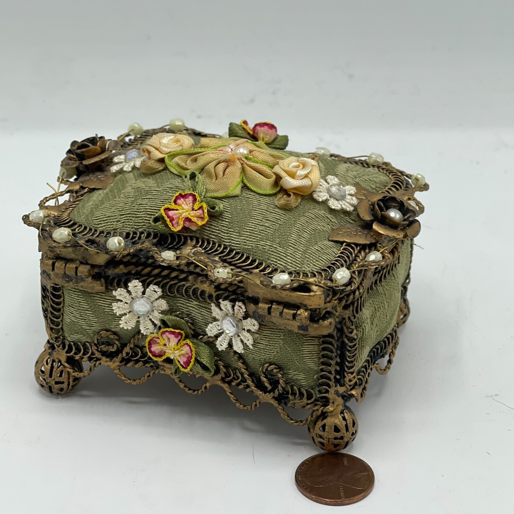 Antique charming piece Measures 3" x 2.5" x 2" Metal scrollwork with fabric flowers throughout. Please use pictures as an inclusive part of the description. Colors can vary on monitors. Happy to combine shipping with other items currently listed. We happily ship internationally. We are celebrating 22+ years on eBay & are happy to offer many varied items for collectors & consumers alike. New items listed daily.