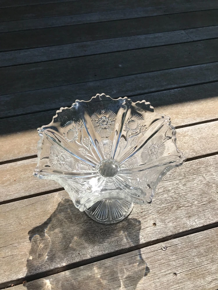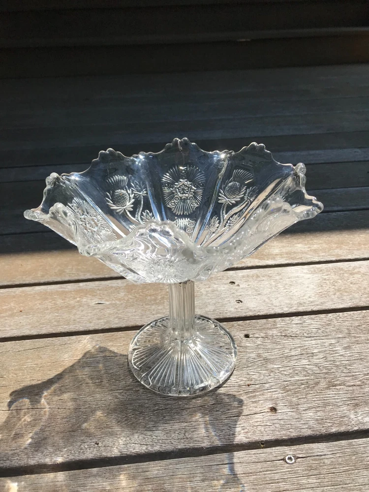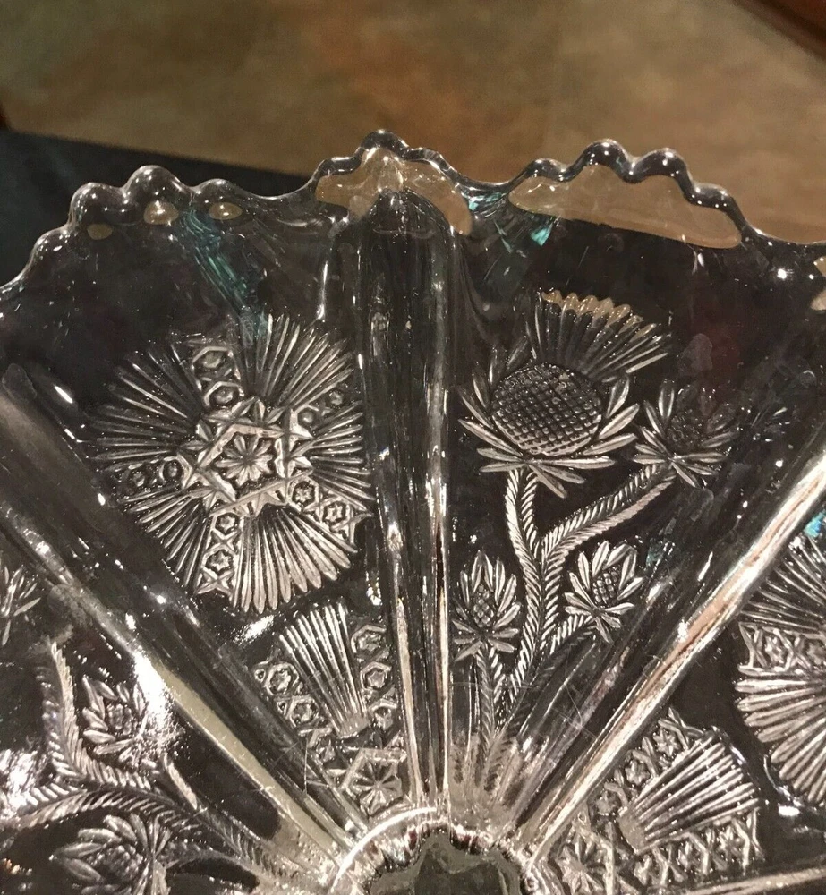 Glowing Gorgeous Antique Paneled Thistle/Delta HIGBEE Eight Paneled Pedestal Bowl. 7 1/" tall, rim 7 1/4" diameter, base 3 3/4". Unmarked. The base and the sawtooth scalloped rim glow, as well as the thick panel separators. There is, what seems to be a production flaw on 1 of the thick panel separators. It does not take away the beauty of this piece. Please refer to my photos. Panels extend to the base.
