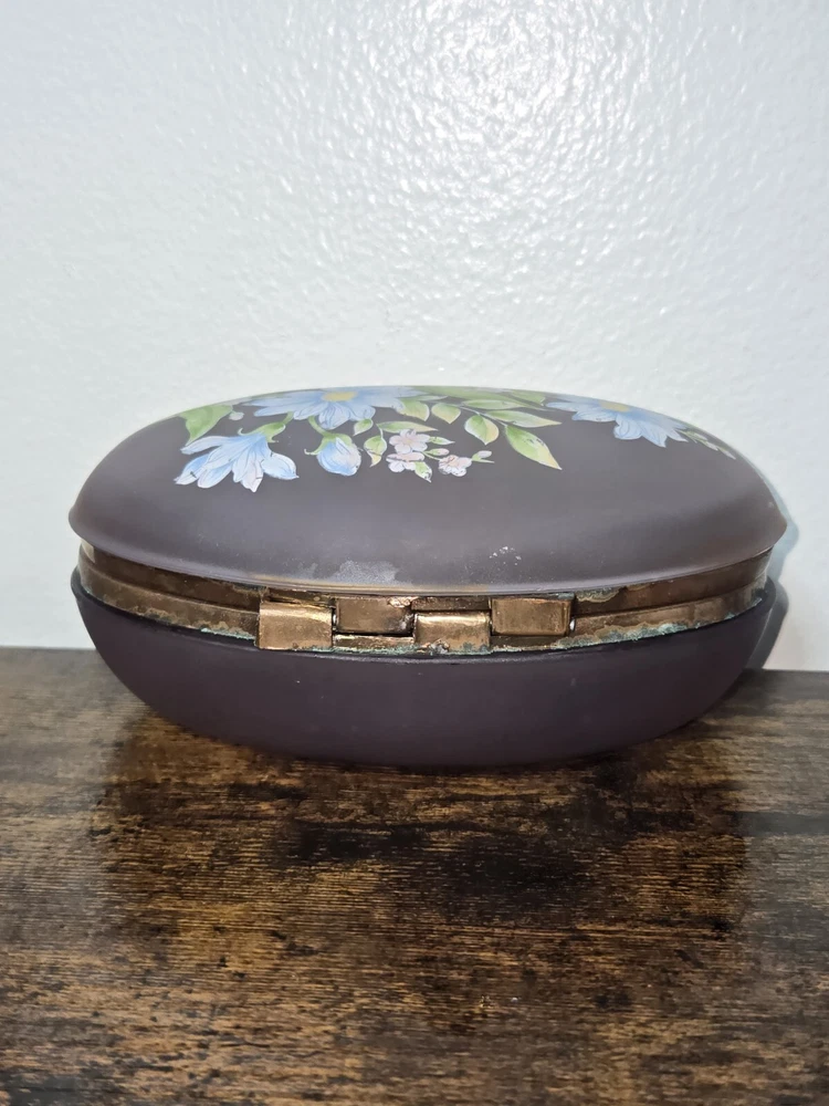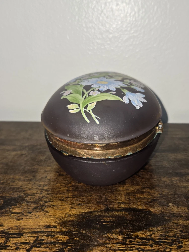 This exquisite trinket box is a must-have for collectors and admirers of Victorian style. The oval, hand-painted box is made of enamel, glass, and metal, with a beautiful floral pattern that exudes an antique charm. It is perfect for storing your precious jewels and keepsakes, and can be placed in any room to add a touch of elegance. The box is in excellent condition, with no signs of wear and tear. It is an original piece from the early 20th century, and comes with care instructions for cleaning with a damp cloth. This unique and rare item is a one-of-a-kind addition to any collection, and will surely catch the eye of anyone who sees it.