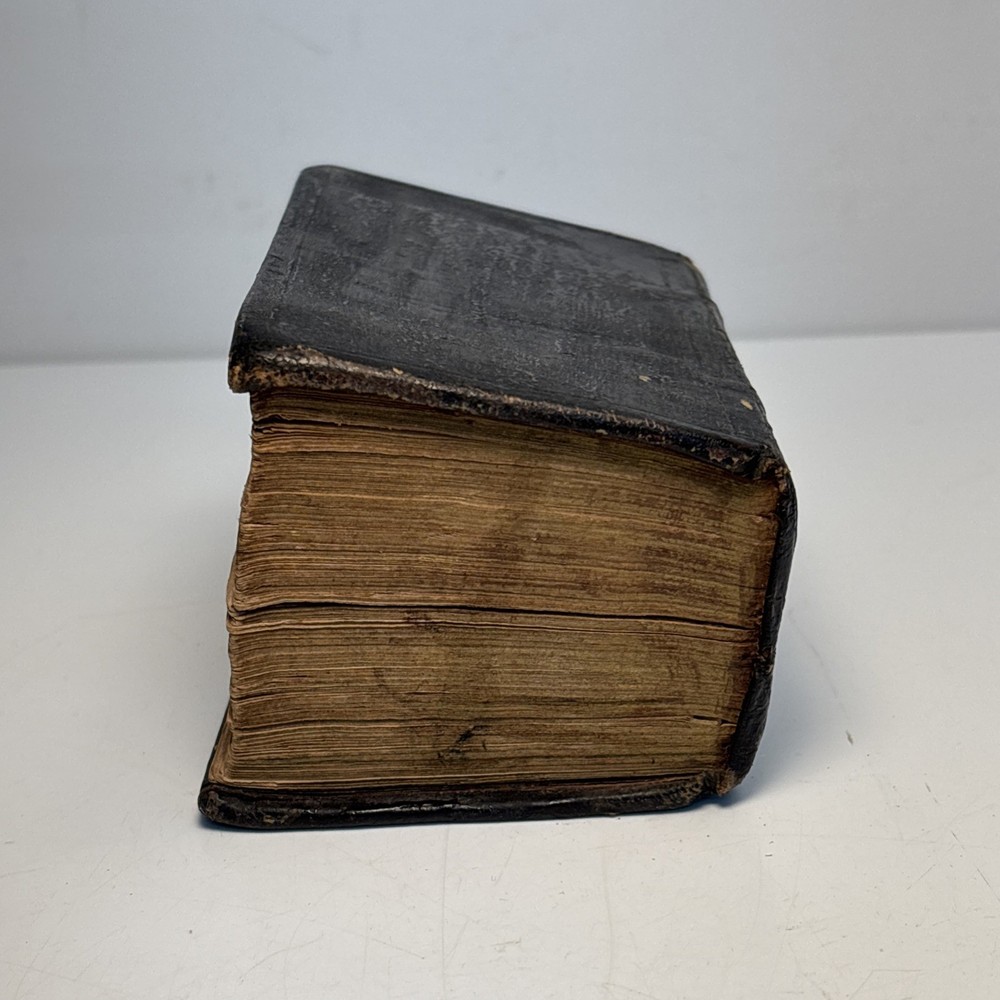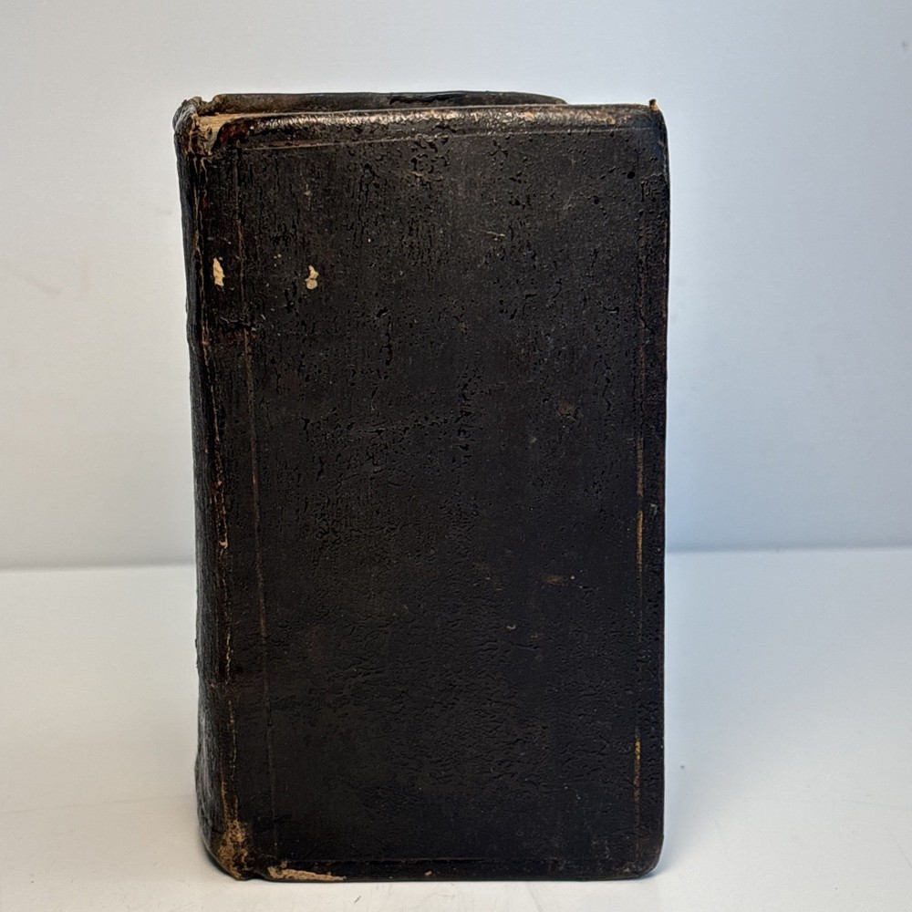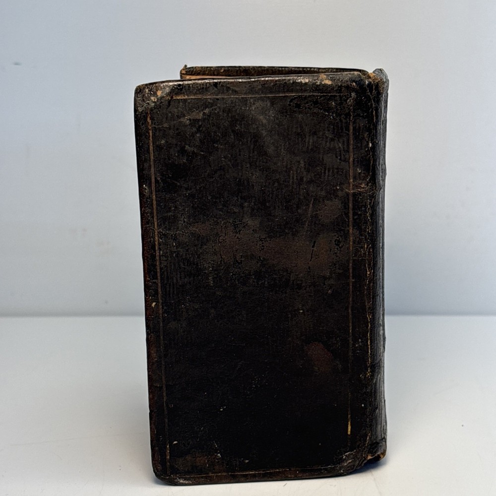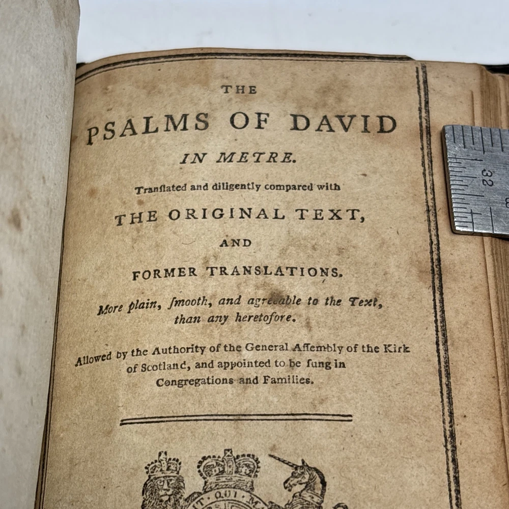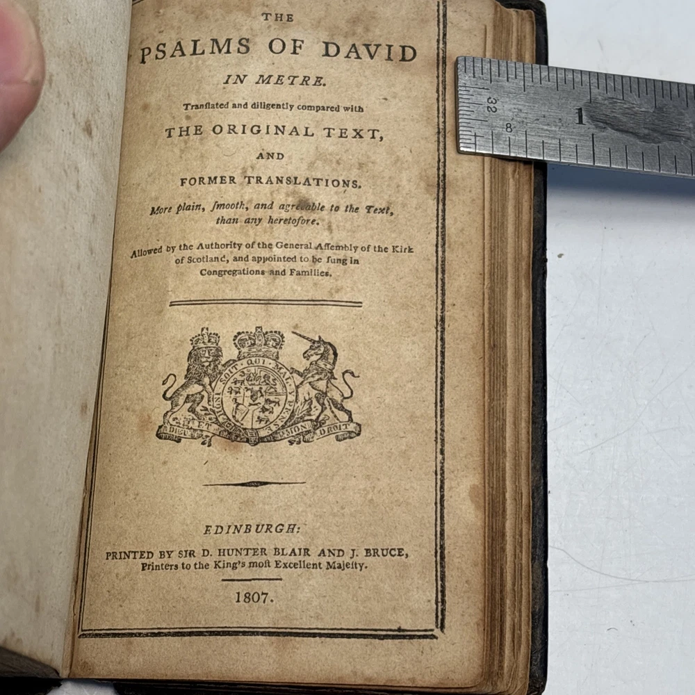Antique King James Bible in worn leather binding. Includes “Psalms of David in Metre” section printed in Edinburgh by Sir D. Hunter Blair & J. Bruce dated 1807. Main title page is not present. Handwritten ownership inscription dated July 16, 1810 signed inside (appears L.C. Alexander). Features laid paper with visible chain lines and early typography including long “s.” Measures approximately 6” x 3 1/2” x 2”. See photos for complete details. Condition: Antique condition with heavy wear to leather binding, edge wear, scuffing, and surface loss. Pages show toning, staining, and handling wear. Title page missing. Binding intact but worn. Writing present. See photos for complete details.