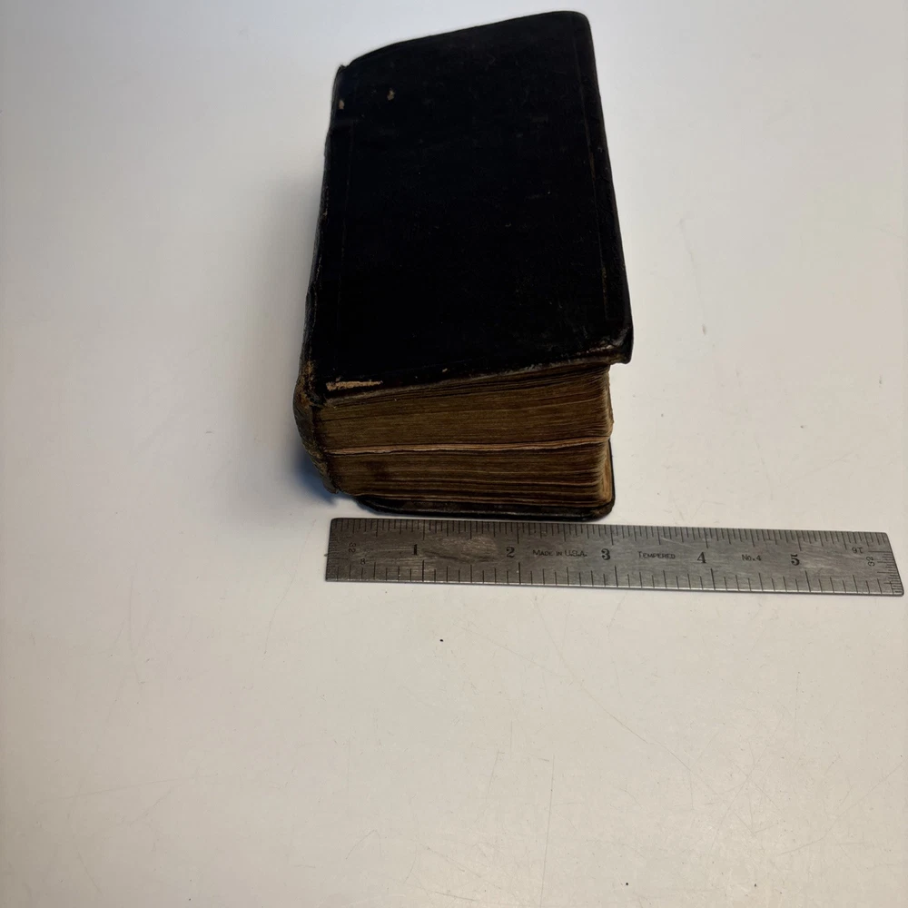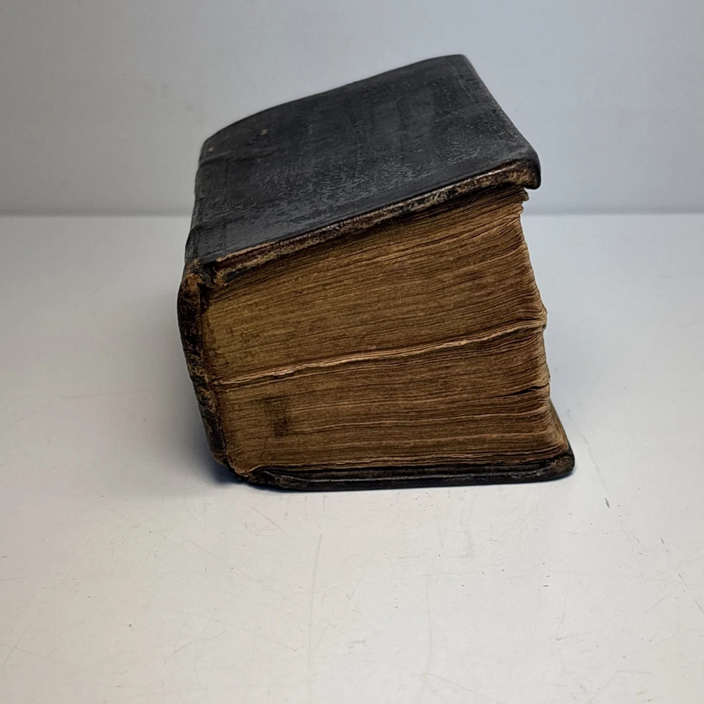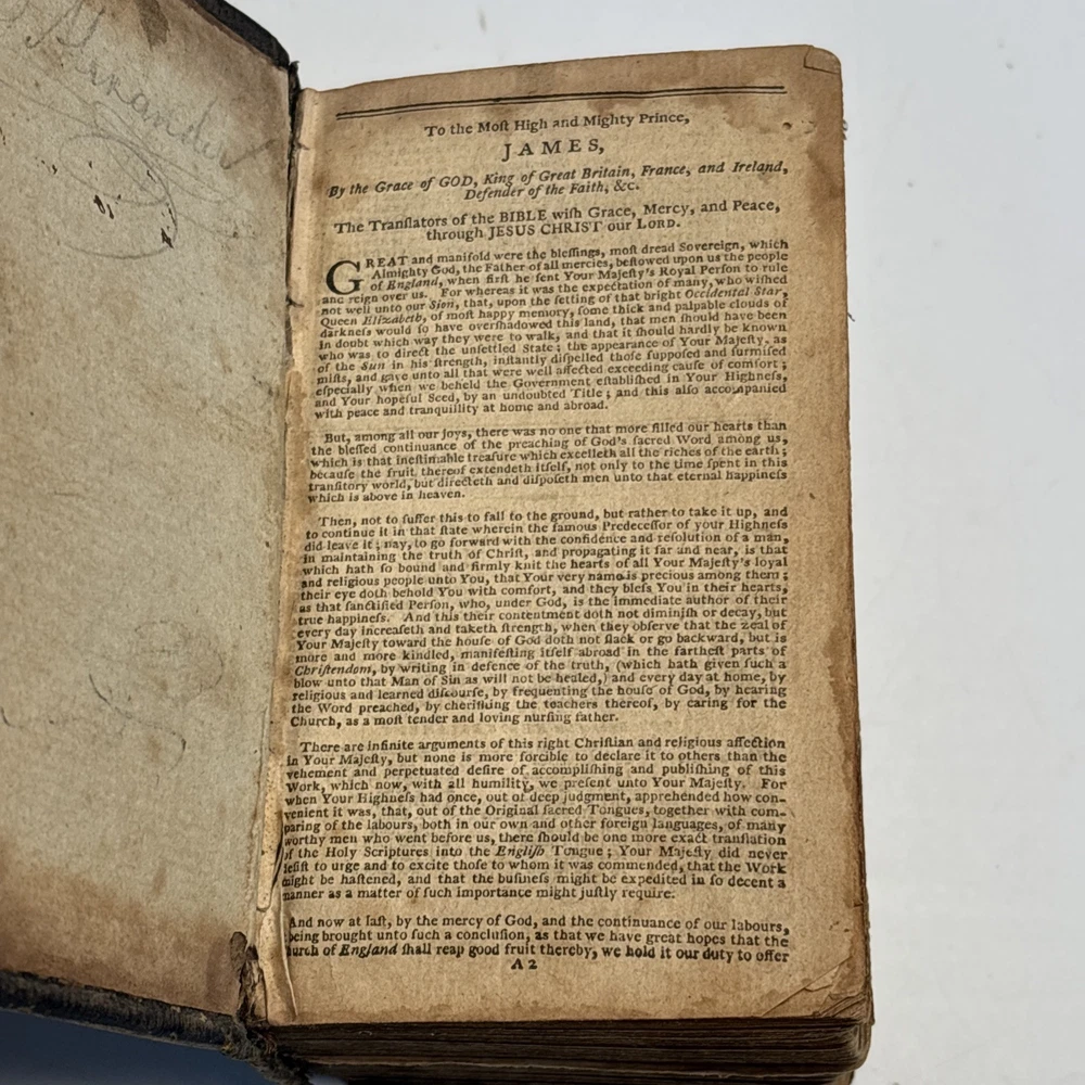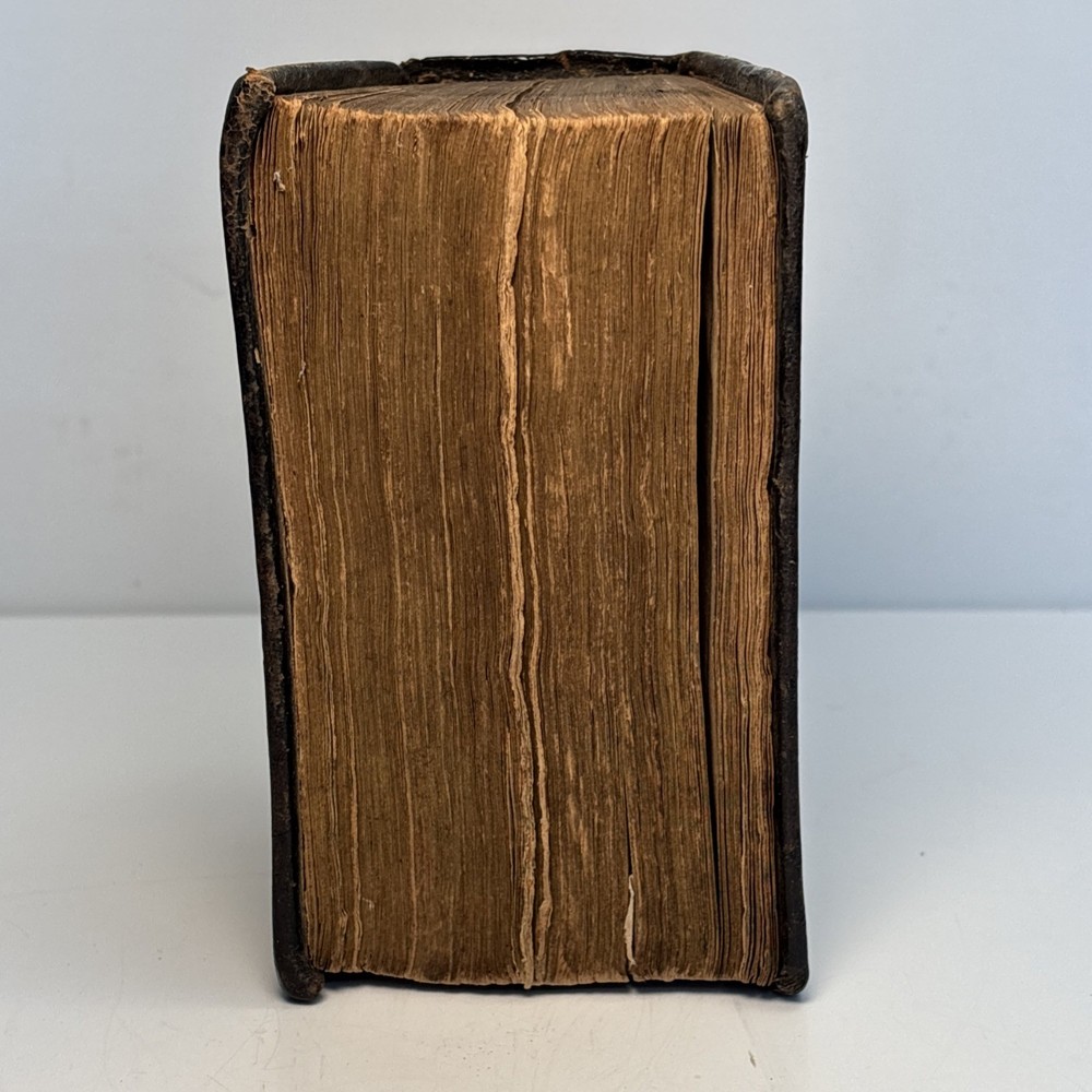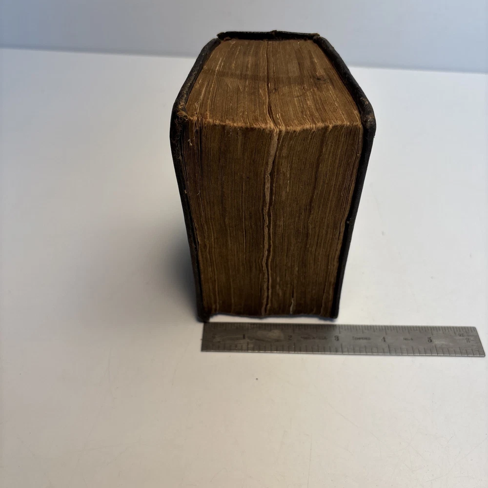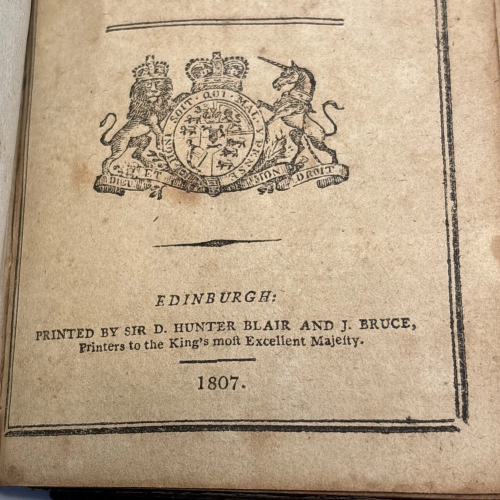 Antique King James Bible in worn leather binding. Includes “Psalms of David in Metre” section printed in Edinburgh by Sir D. Hunter Blair & J. Bruce dated 1807. Main title page is not present. Handwritten ownership inscription dated July 16, 1810 signed inside (appears L.C. Alexander). Features laid paper with visible chain lines and early typography including long “s.” Measures approximately 6” x 3 1/2” x 2”. See photos for complete details. Condition: Antique condition with heavy wear to leather binding, edge wear, scuffing, and surface loss. Pages show toning, staining, and handling wear. Title page missing. Binding intact but worn. Writing present. See photos for complete details.