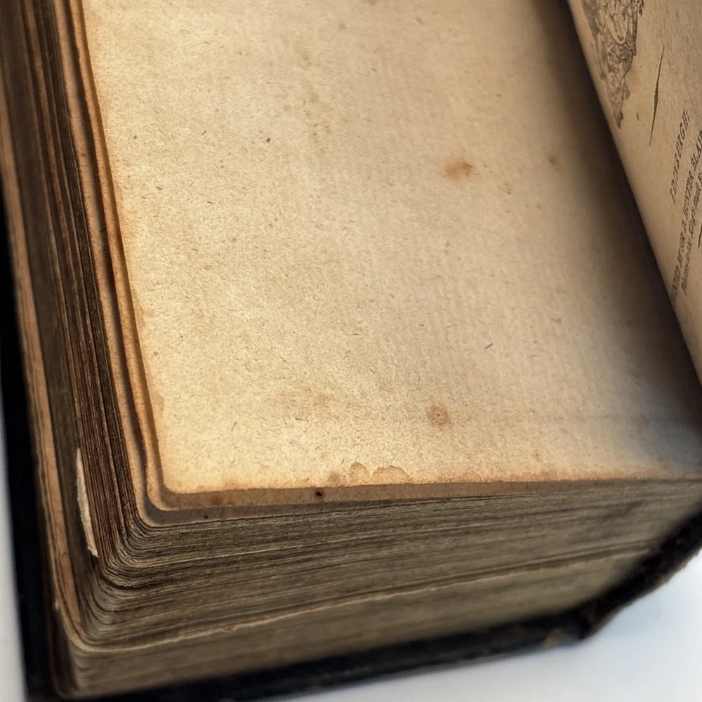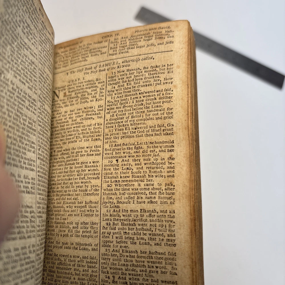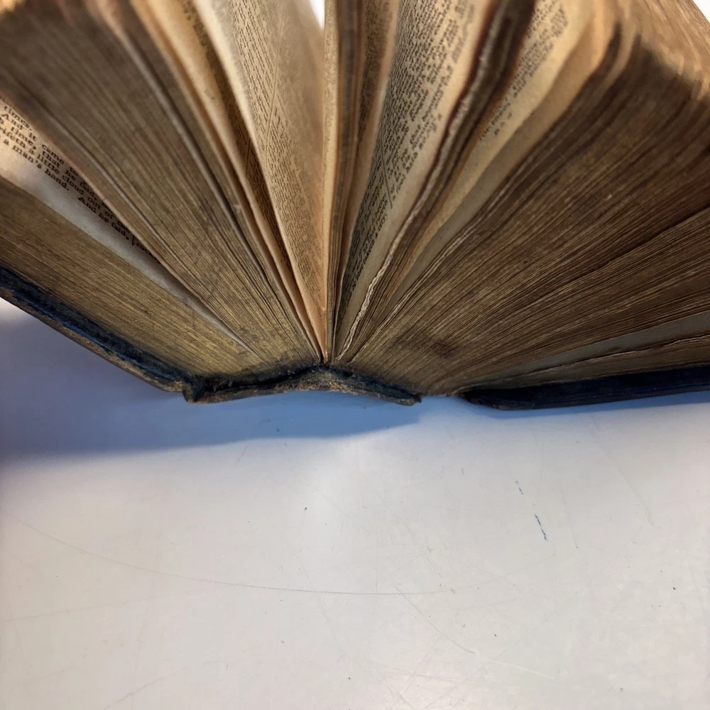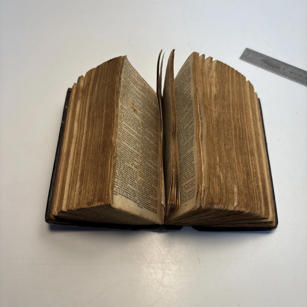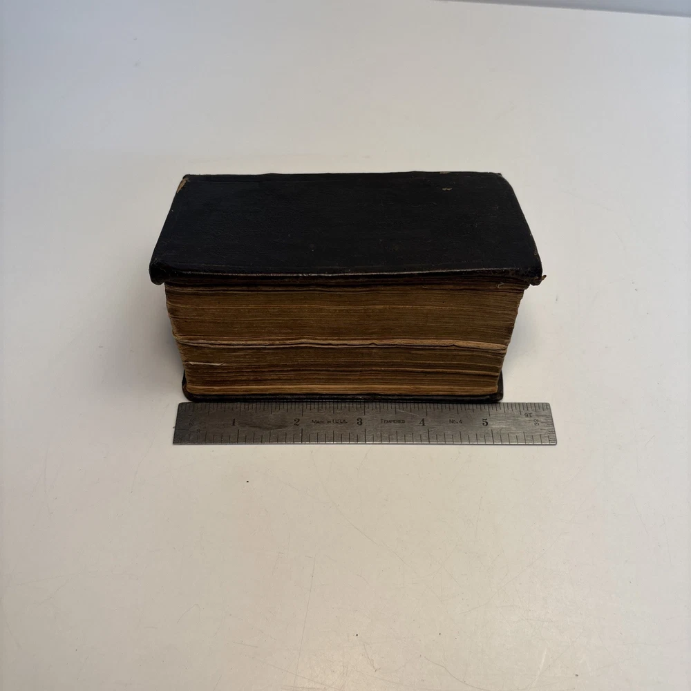 Antique King James Bible in worn leather binding. Includes “Psalms of David in Metre” section printed in Edinburgh by Sir D. Hunter Blair & J. Bruce dated 1807. Main title page is not present. Handwritten ownership inscription dated July 16, 1810 signed inside (appears L.C. Alexander). Features laid paper with visible chain lines and early typography including long “s.” Measures approximately 6” x 3 1/2” x 2”. See photos for complete details. Condition: Antique condition with heavy wear to leather binding, edge wear, scuffing, and surface loss. Pages show toning, staining, and handling wear. Title page missing. Binding intact but worn. Writing present. See photos for complete details.