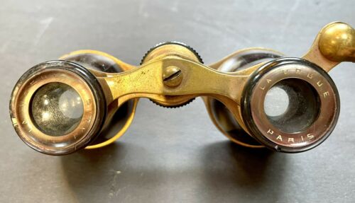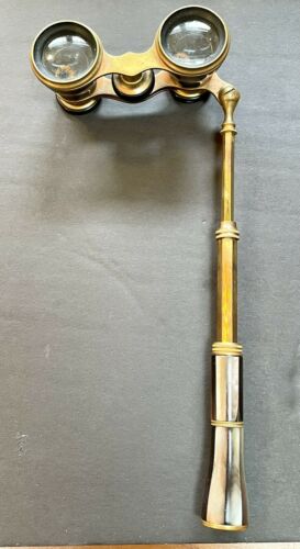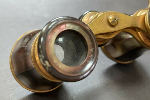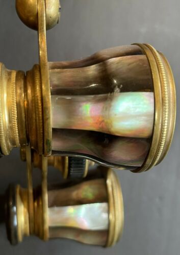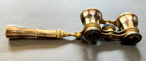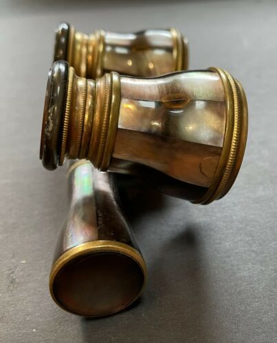 Beautiful pair of mother of pearl telescoping opera glasses with handle, made by La Vouge Paris. These are really pretty with a dark purple/black hew to them. The handle comes apart, and internal metal rod comes out and can be screwed and reconfigured to telescope--does take a few attempts if you are not familiar with them. These would make a great statement piece to your collection. Lens dials to zoom turn smoothly. Measures: Handle fully extended with telescope 8.5" With Handle not extended 4.5" Binoculars are 4" across. Excellent estate found condition. Glasses do have an area on the handle where the mother of pearl has cracked but is still present. Small area on one of the monocle mother of pearl where it is cracked but still present. I did not see any areas of pearl loss. One of the side of the lens frame was dropped at some point in its history and has a very small area that is missing the frame and is white surface staining-- please see photos very minor imperfection but still present. There is some sticker residue on one of the monocles mother of pearl ares--could easily be removed by new owner I am selling as is. They are marked La Vouge Paris on lens frame. As a general disclaimer, all items are sold as is where is. They are vintage estate found and all items run the risk of having the following defects which are, but not limited to: age spots dark or light, scratches, paint loss, fading, signs of age, signs of use, signs of general wear and tear, signs of storage. These defects are assumed to be present in all items--but as stated above I try to describe all items in complete accuracy. Additionally, seller is not responsible for any color deviations-- each users computer/smart phone displays colors differently based on user preferences, these preferences may make colors appear brighter/darker/muted/lighter ect. Buyer accepts this upon purchase of item. If you require additional photos to double check colors please let me know, I am happy to provide any needed. If you have a question, are unsure, or require additional photos please do so prior to purchase, as I do not accept returns. I am happy to answer any questions, and provide additional photos as needed. In the rare occasion a return is accepted by this seller, buyer agrees to all return shipping charges and upon purchase of this item further agrees to a 35% restocking fee being deducted from their refund.