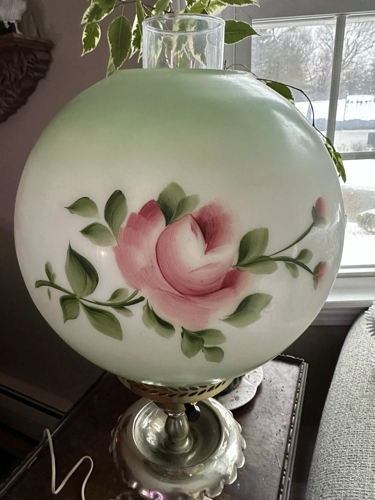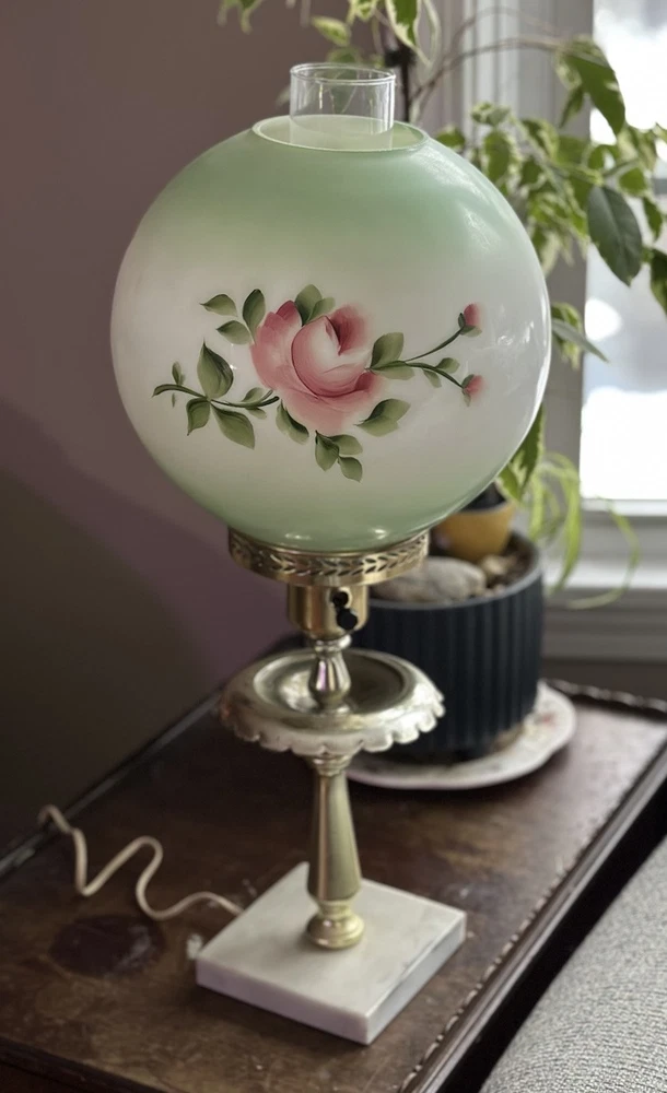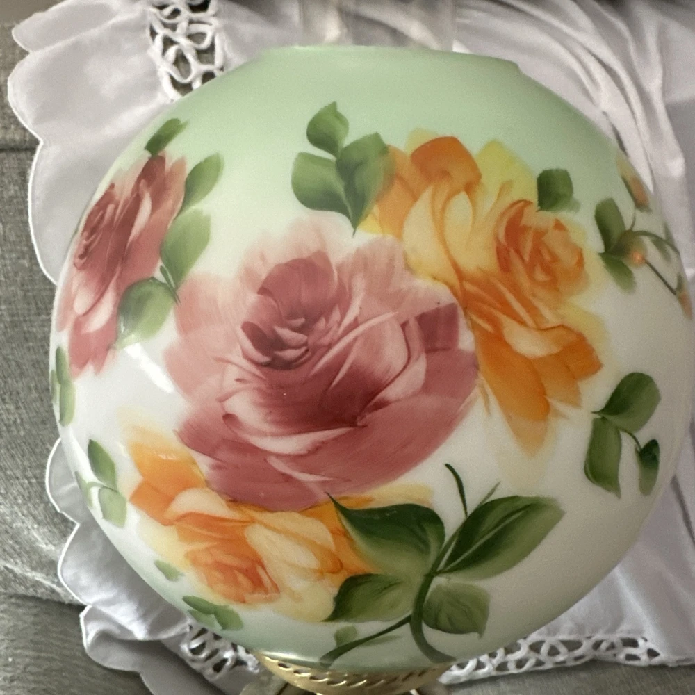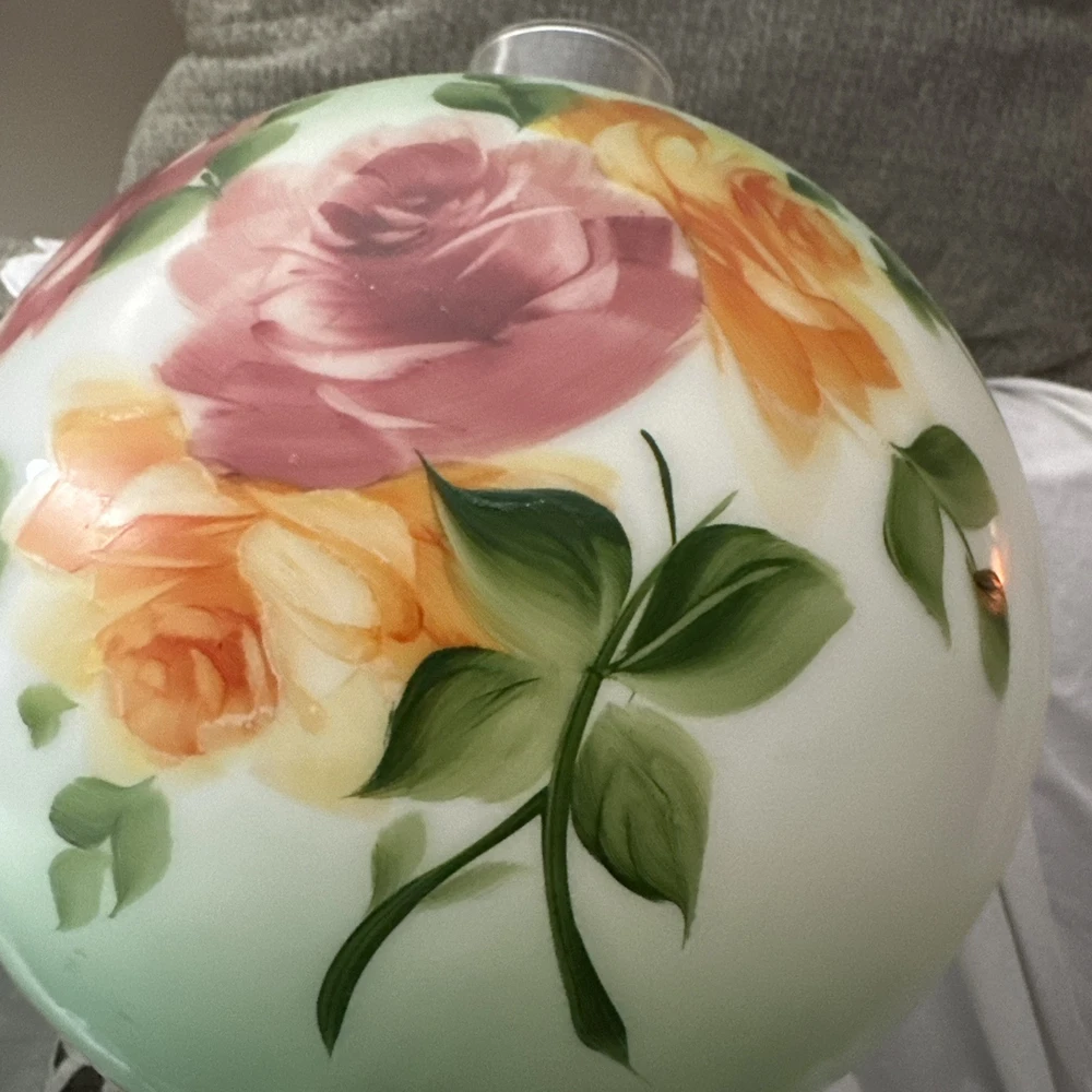 This lamp is absolutely stunning. Hand painted globe adorned with pink and peach roses slightly tinted a minty green. Comes from a smoke free home