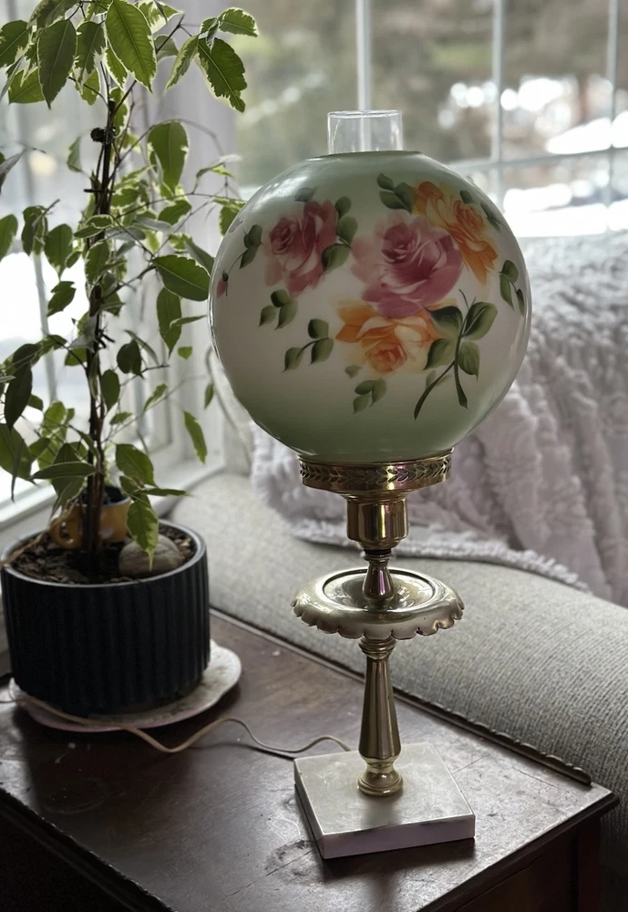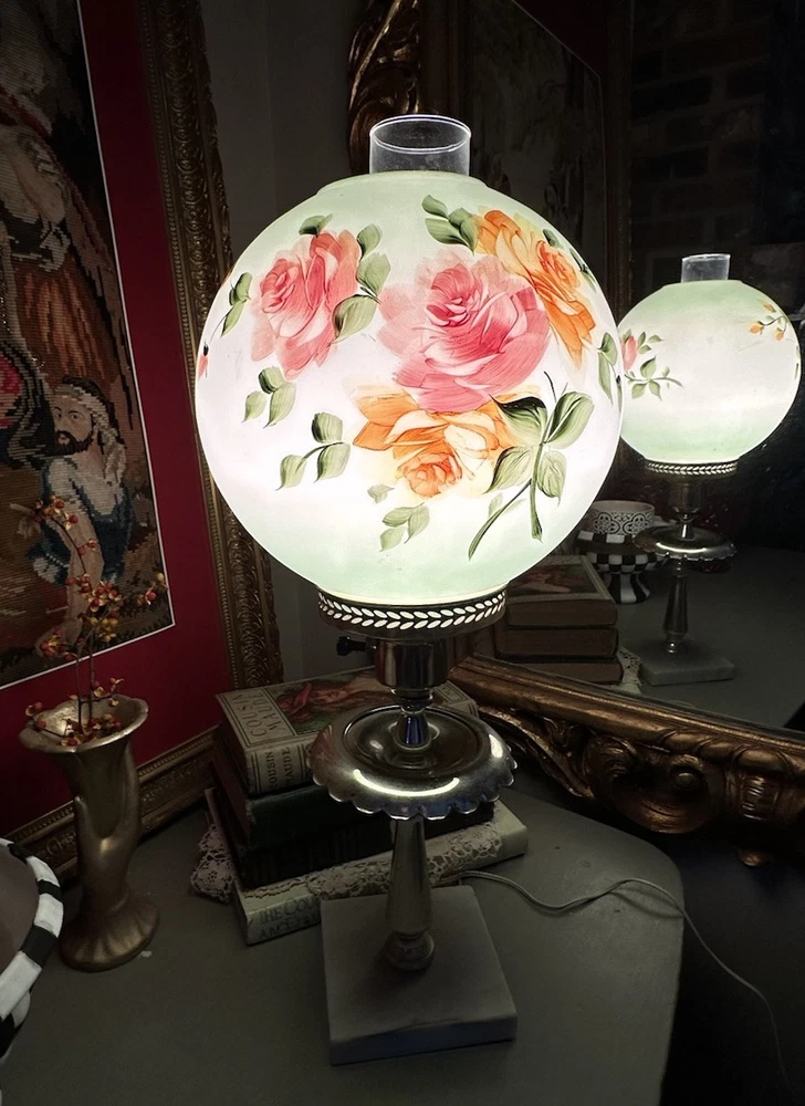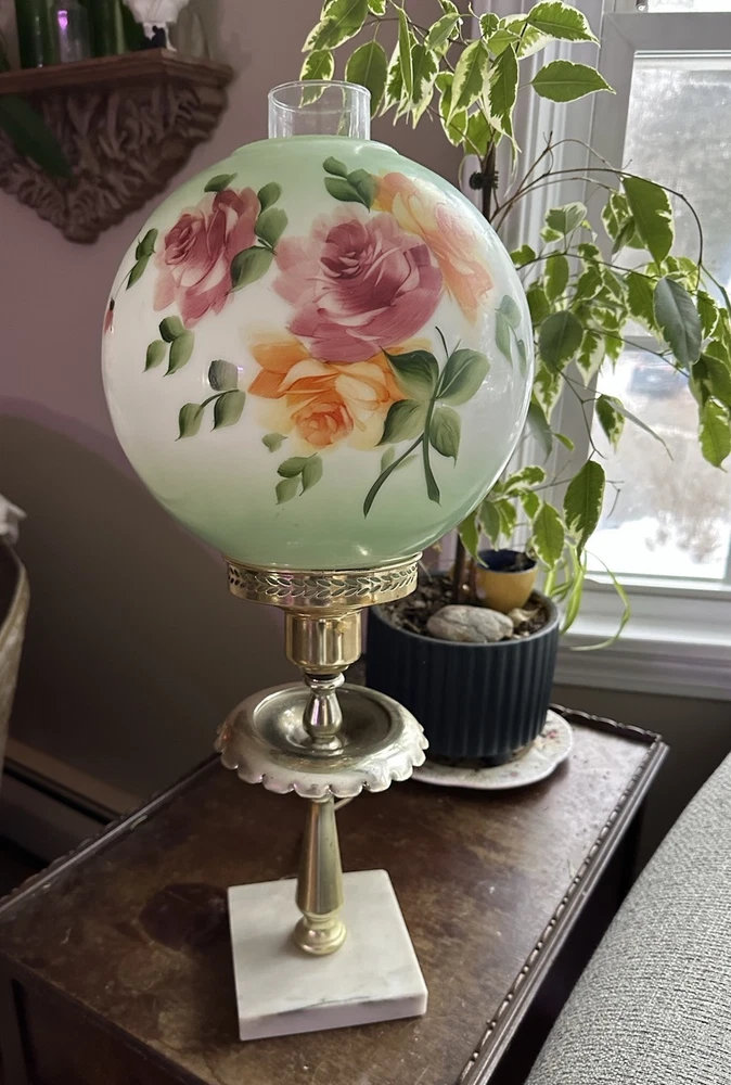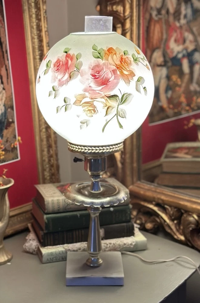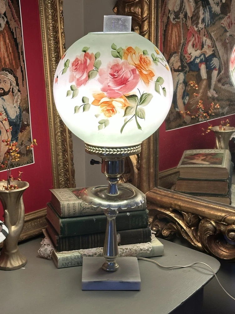 This lamp is absolutely stunning. Hand painted globe adorned with pink and peach roses slightly tinted a minty green. Comes from a smoke free home
