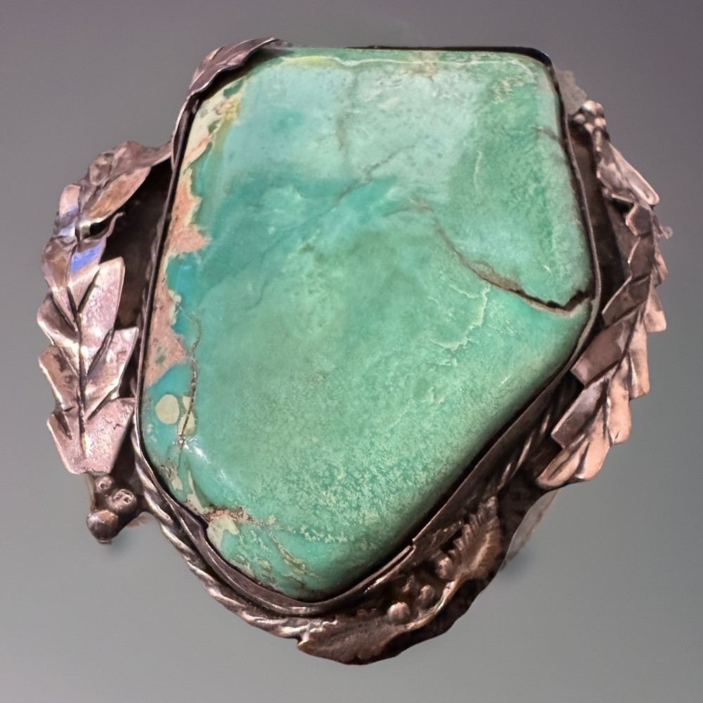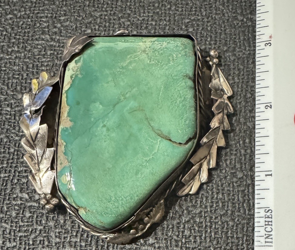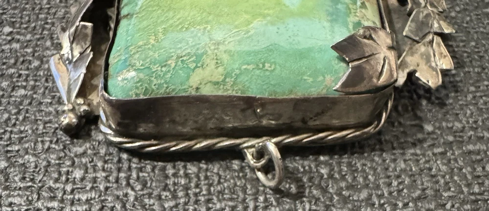 Antique Large Navajo Sterling Silver Turquoise Pendant Solid Mount 3” O Ring Solid with hallmark/stamp. OOAK Weight- 99 grams/3.2 oz Color grade-Blue Green O ring on top of setting. Laurel Leaf/Feather/Roping surround on setting. Backing of mount is closed with sterling Silver with Hallmark
