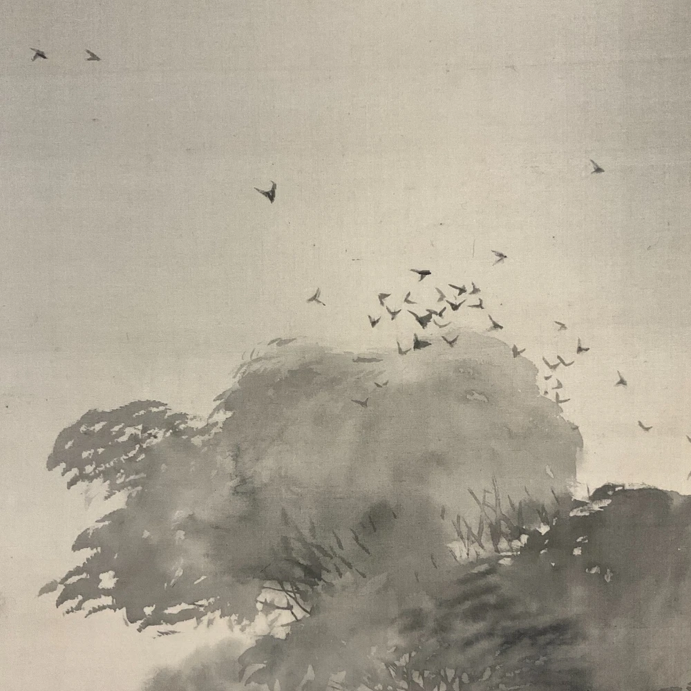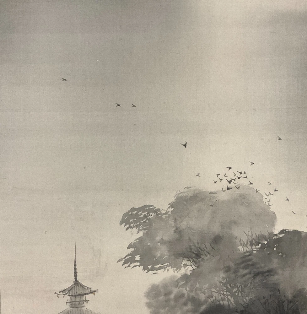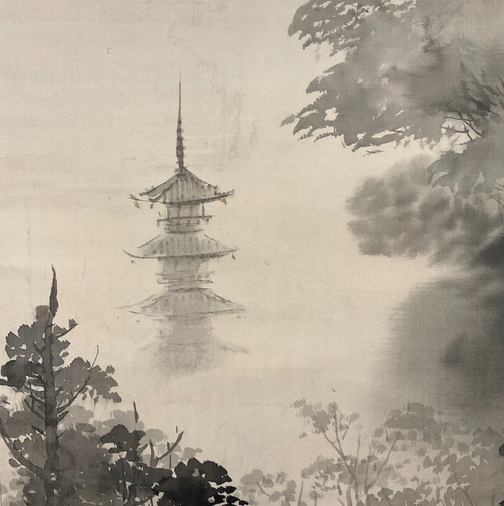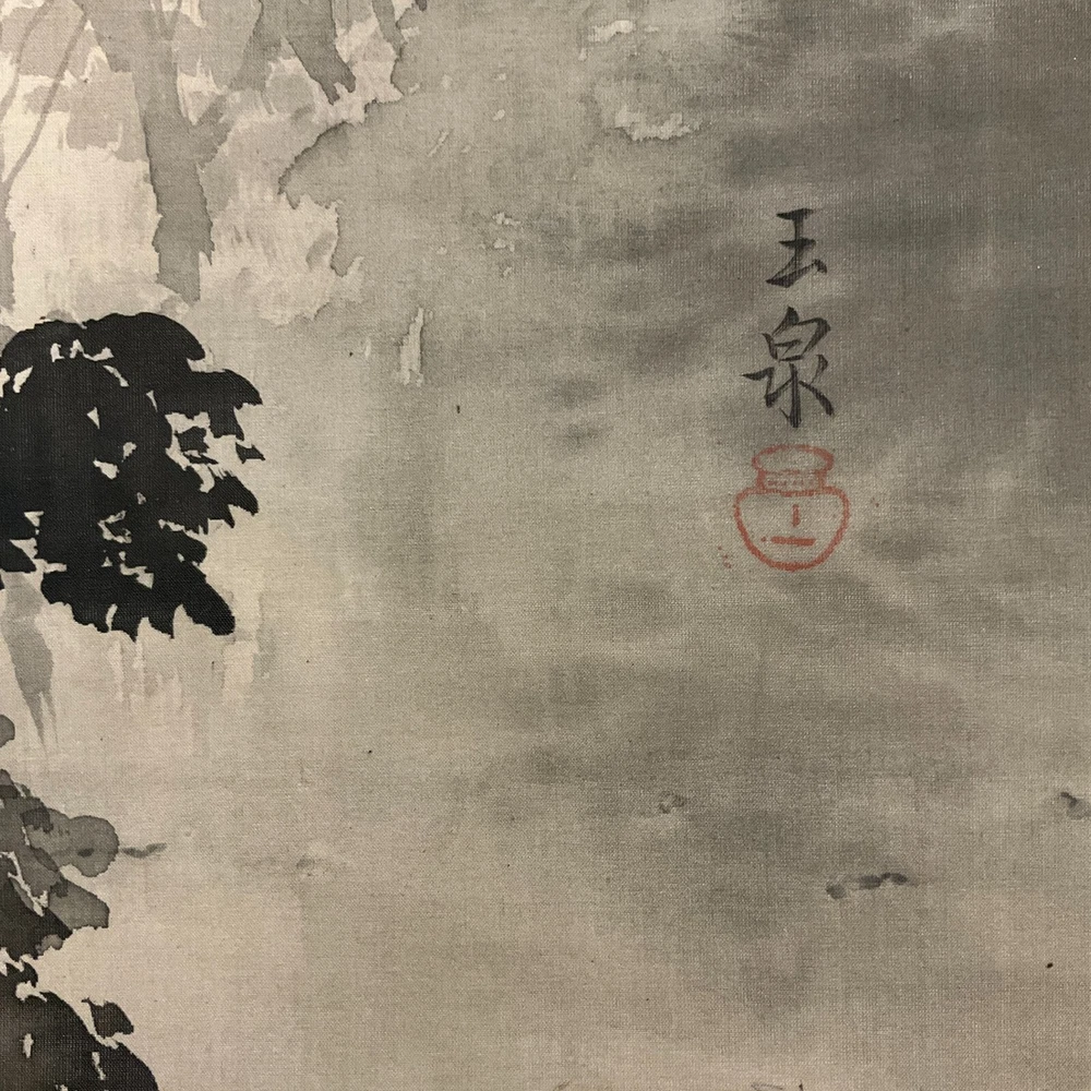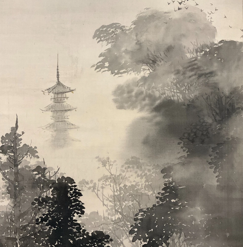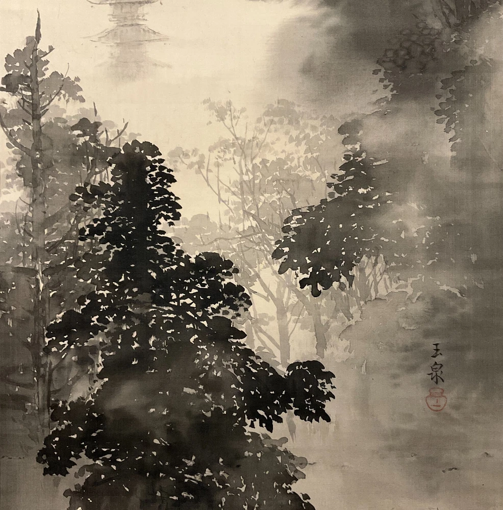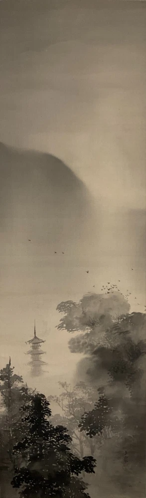 The Antique Late 19th Century Meiji Period Japanese Original Ink on Silk Landscape Scroll Painting "Forest Mountain After Rain" , Signed By Artist Mochizuki Gyokusen ( Japanese, 1834-1913 ) with Seal in Lower Right. The Painting Depicts the Extremely Poetic Scenery of the Forest Mountain in the Early Morning After the Rain. The Dense Forests and Temple Tower in the Misty Clouds, and the Birds Soar Freely in the Sky. The Mountains are Stacked, From Dark to Light, Gradually Moving Away. Large Areas of Pine Forests are Painted with Heavy Ink to Support the Painting, which is Both Real and Lively. The Ink Color of the Painting Blended, Emphasizing the Dark and Wet Layers of Blur, and the Brush and Ink are Free Between Romance and Reality to Seek Change. In A Natural and Gentle Painting Method, It Creates A Harmonious and Peaceful Atmosphere and A Bright and Fresh Mood. The Painting Shows Minor Toning, Crease, and Wear on the Scroll Mat Consistent with Age, In Good Condition. About Artist: "Mochizuki Gyokusen (望月玉泉) (1834-1913) was a Japanese painter and active from the Meiji to Taishō eras of Japan as well as the fourth generation principal of Mochizuki school. He studied the painting technique under his father, Mochizuki Gyokusen (望月玉川). In 1845, while serving to Kikutei family at the age of 13, he roamed around outside provinces including Ise Province and Suruga Province. While he had a great regard for sketching, he assimilated the painting styles of Maruyama school and Shijō school so that he became well-known with his paintings of landscapes and flowers & birds in the Kyoto painting world. In 1852 he succeeded the principal position of the school at the age of 18. The Mochizuki family was serving to the Imperial Palace from generation to generation. For example, it drew fusuma-e (images drawn or painted on fusuma door) when the Kyoto Imperial Palace was built newly in 1855, and then devoted the works such as folding screens at the occasion of the enthronement of the Emperor Meiji. He exhibited “Fugakuzu (Figure of Mt. Fuji)” and awarded the Bronze prize with the piece of work at Paris Exposition in 1889. And, he received the honor of the purchase by Ministry of Agriculture and Commerce at World’s Columbian Exposition in 1893. He was active in national industrial exhibitions in japan as well. In addition, he established Kyoto Prefectural School of Painting with Kōno Bairei to contribute to foster the younger generations. In 1904, he was appointed to be an Imperial Household Artist. He dedicated his life in his last years to focus on painting of flowers & birds. Kawai Gyokudō was a disciple studied under him and Mochizuki Gyokukei (望月玉渓) was a son of him." Title: "Forest Mountain After Rain" Artist: Mochizuki Gyokusen ( Japanese, 1834-1913 ) Time Period: Late 19th Century Medium: Ink on Silk Condition: Good Condition Scroll Size: 74" By 16-1/2" Painting Size: 41-1/2" By 12-1/2" Available For Domestic Shipping and International Shipping. Thanks!