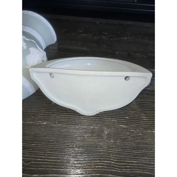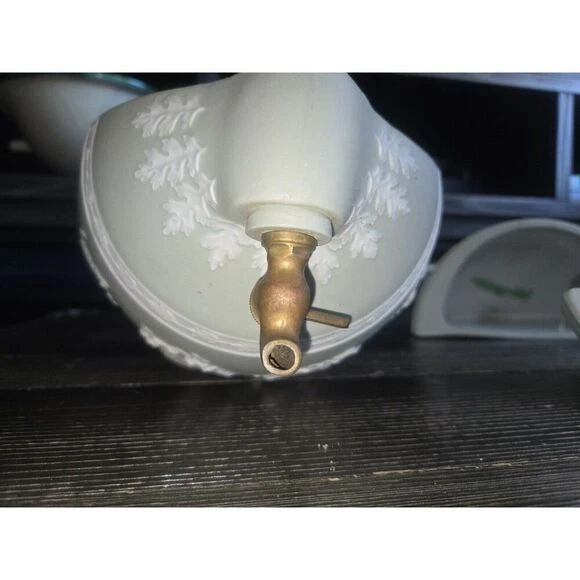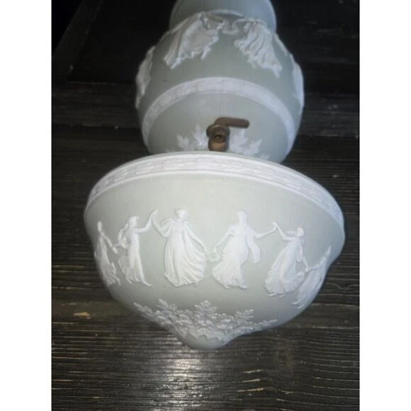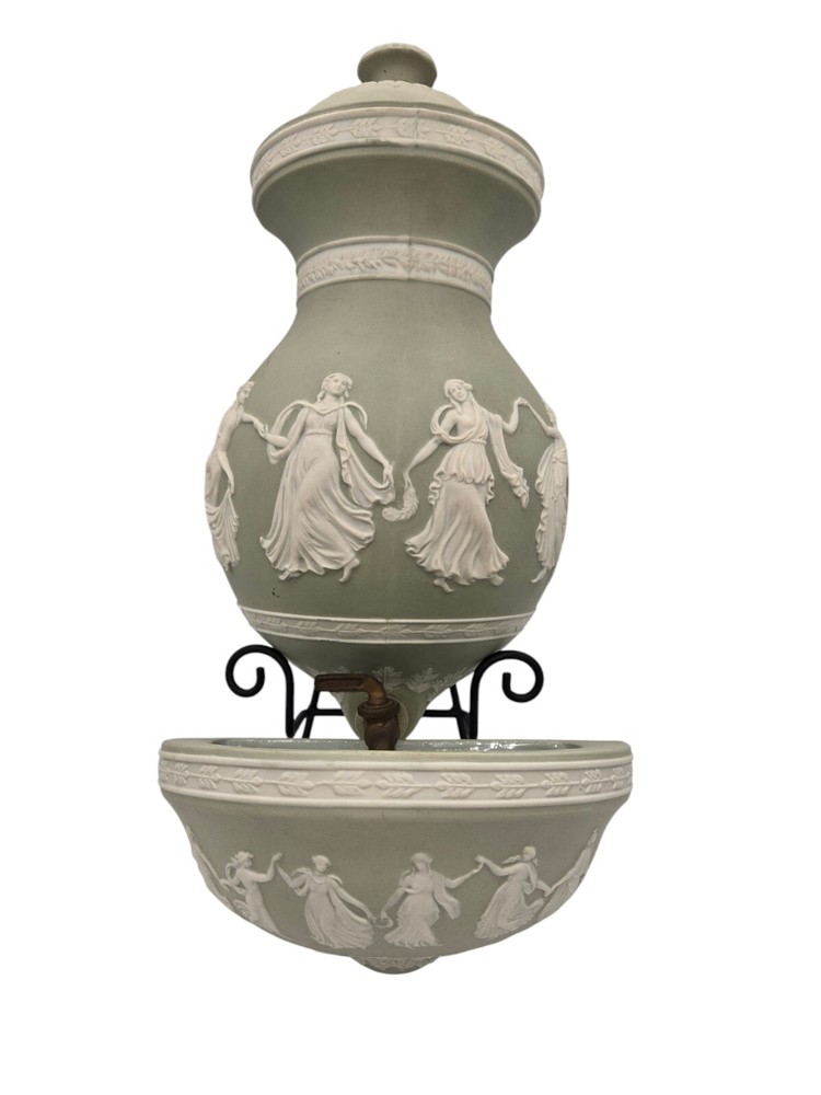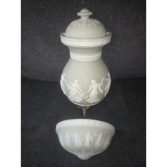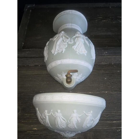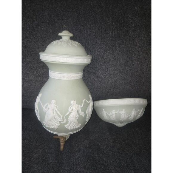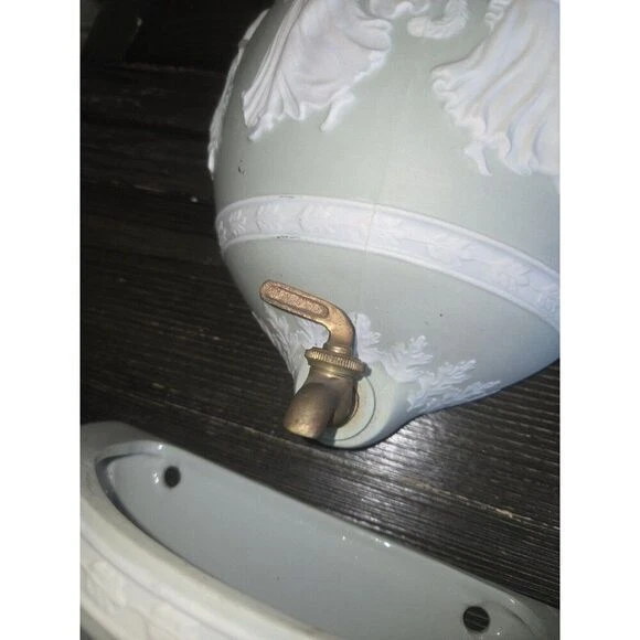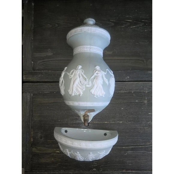 Elegant antique water dispenser and basin set featuring exquisite relief work depicting classical dancing figures in white against a soft sage background. Perfect for creating a sophisticated focal point in a powder room, garden room, or covered patio. The decorative wall-mounted design adds both functionality and artistic charm, ideal for entertaining spaces or creating an old-world European ambiance. Repair shown in photos on lid. Keywords: vintage water dispenser, ceramic wall fountain, neoclassical decor, wall mounted basin, grecian relief art, antique bathroom accessories, decorative water vessel, classical wall decor, vintage bathroom fixture, sage green ceramic
