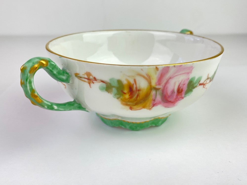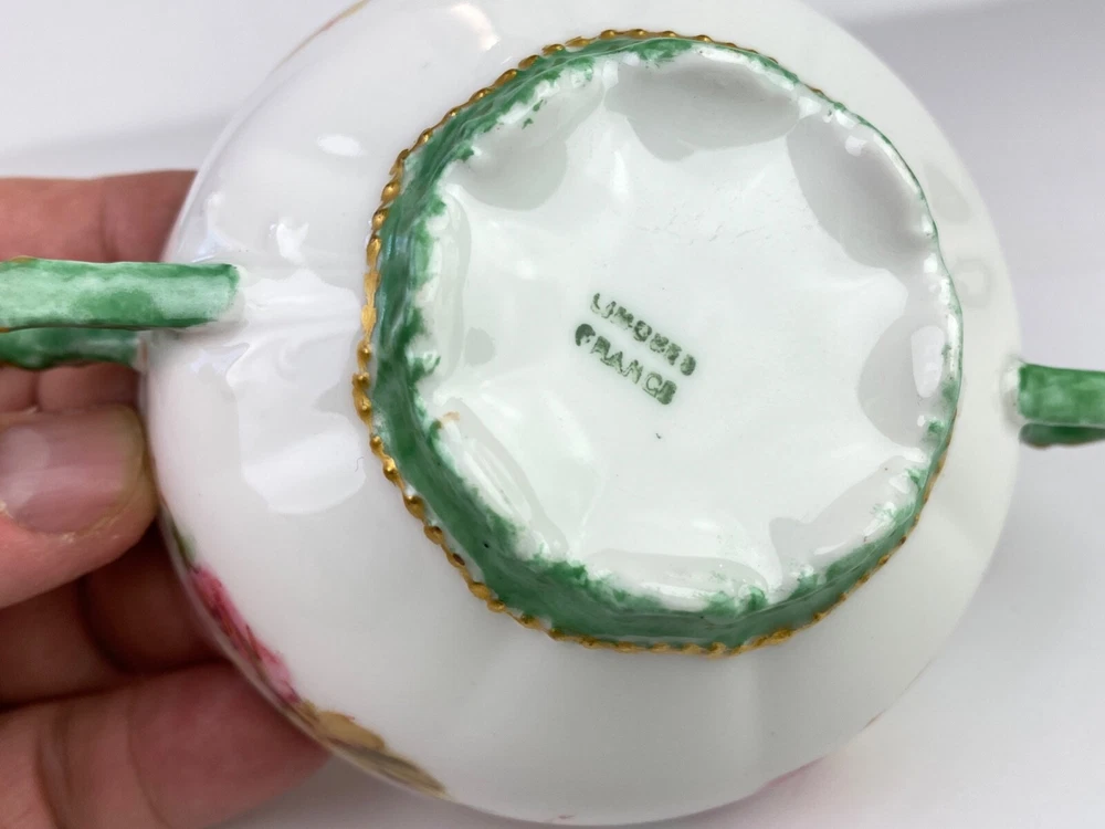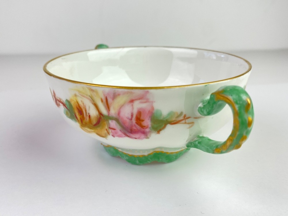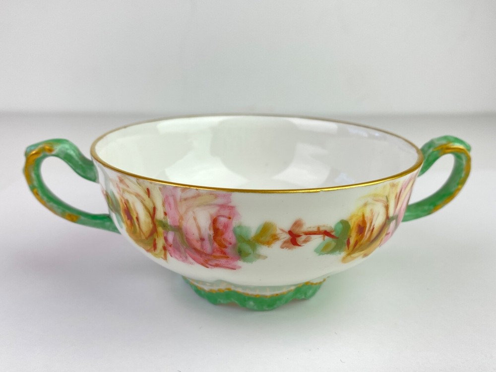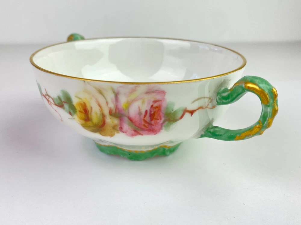 Here's a beautiful antique bullion/tea cup, marked "Limoges Frances." It features yellow and pink roses with green handles and gold trim. Very good condition, no chips or cracks. Note: Items description and condition are in the eye of the beholder so PLEASE refer to pictures to help determine this item's attributes to your own satisfaction. I never attempt to modify, clean or repair the items I sell. All sold original as found. Feel free to ask questions or request additional photos if you wish. I will combine shipping; Just make the purchases but do not pay until I send you a combined invoice. All items are sold as found. I only ship within the continental United States, however I accept use of eBay's Global Shipping Program. Cheers!