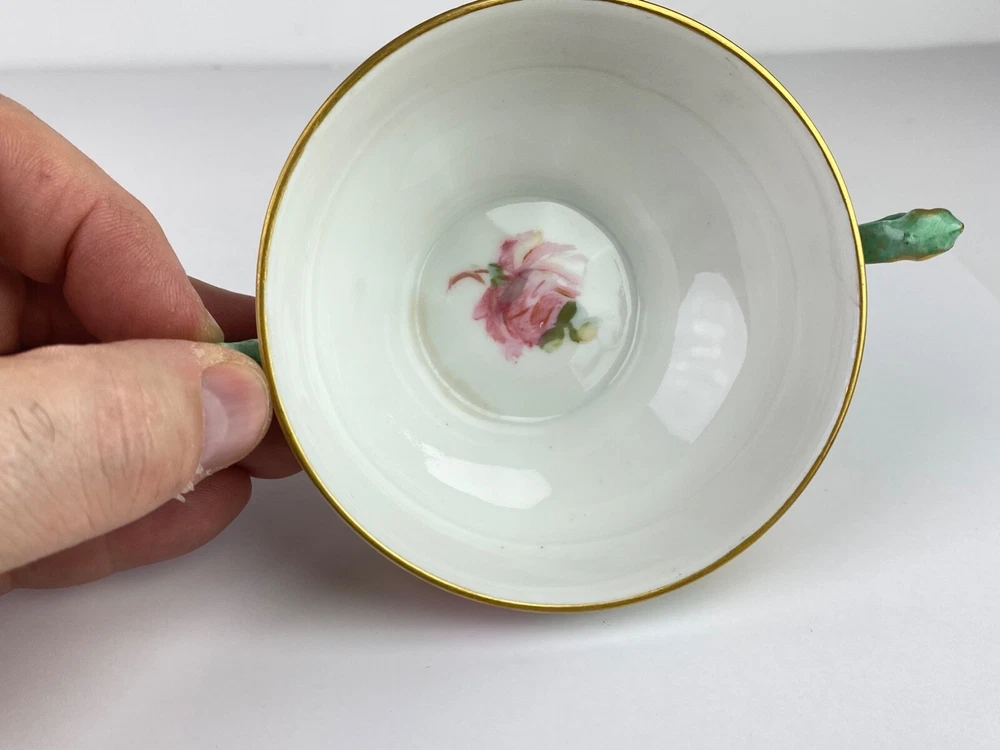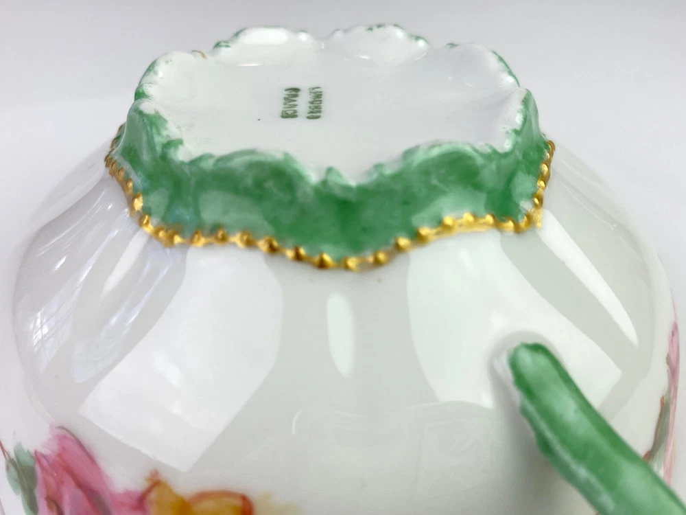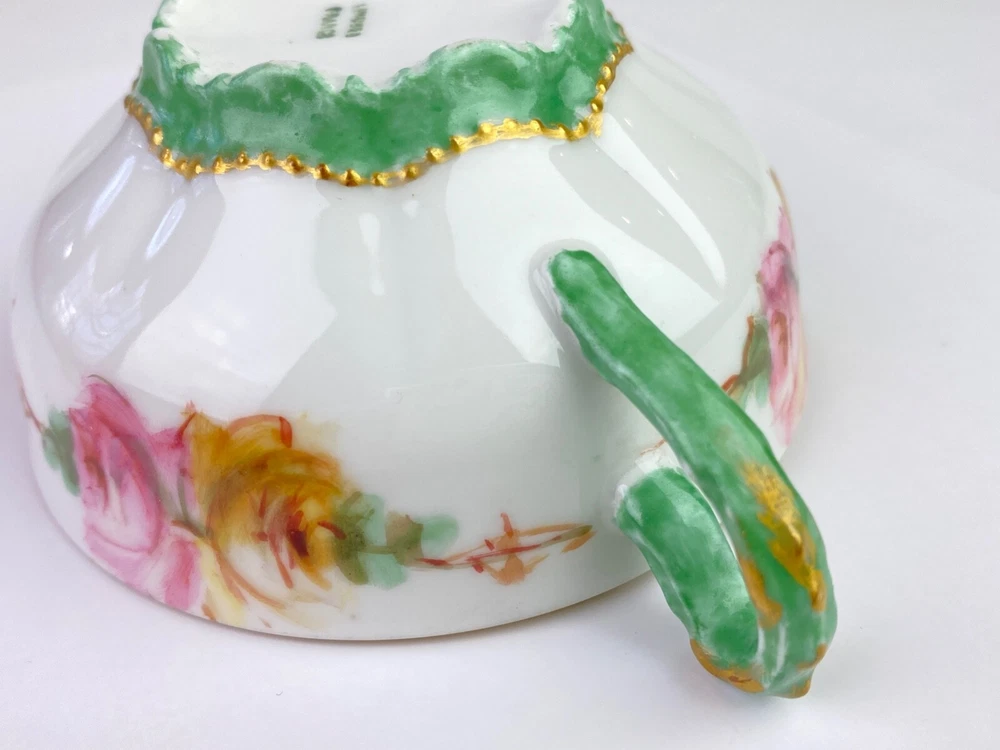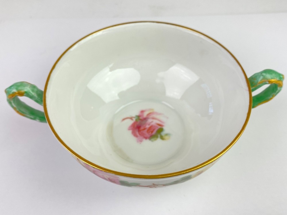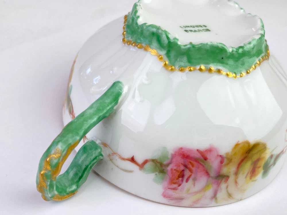 Here's a beautiful antique bullion/tea cup, marked "Limoges Frances." It features yellow and pink roses with green handles and gold trim. Very good condition, no chips or cracks. Note: Items description and condition are in the eye of the beholder so PLEASE refer to pictures to help determine this item's attributes to your own satisfaction. I never attempt to modify, clean or repair the items I sell. All sold original as found. Feel free to ask questions or request additional photos if you wish. I will combine shipping; Just make the purchases but do not pay until I send you a combined invoice. All items are sold as found. I only ship within the continental United States, however I accept use of eBay's Global Shipping Program. Cheers!