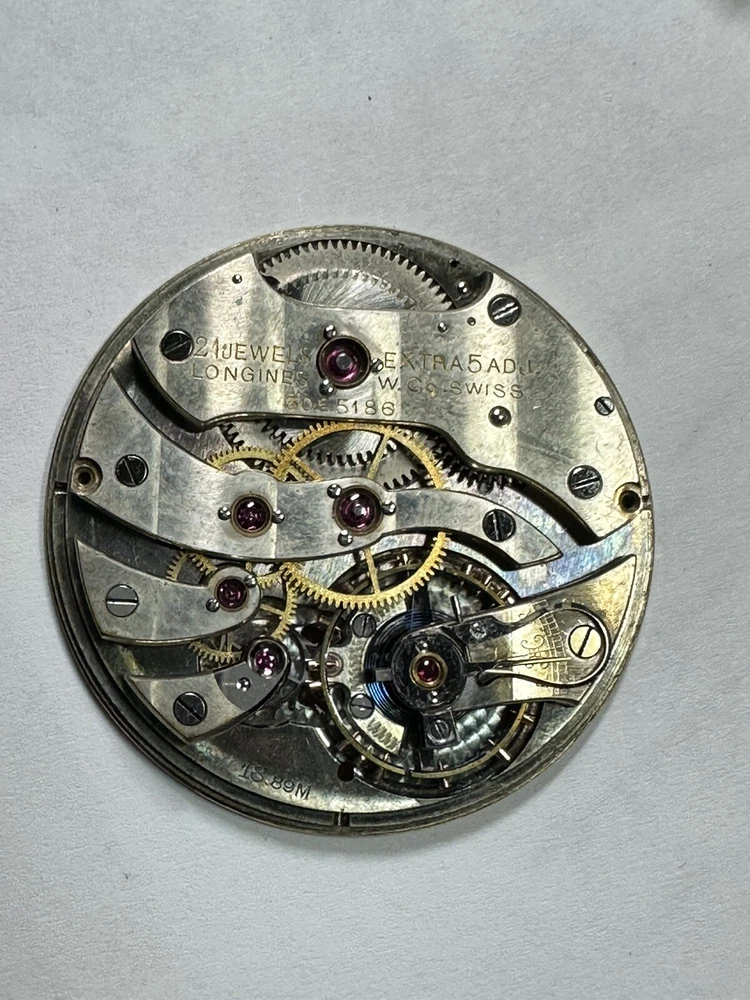 This item being offered is a Longines pocket watch movement. It is a 17-jewel movement approx. 38.8 mm diameter. It is running and the balance seems good, but the 4th wheel pivot is gone. It is a thin very good grade movement grade 18.89M. Selling in AS-IS condition as pictured and described above. Buyer to pay $5.00 shipping US, out of country $16.00 first class international mail.