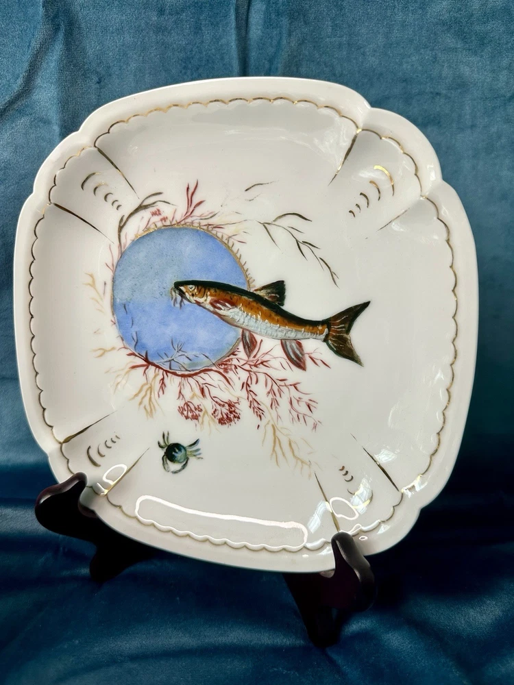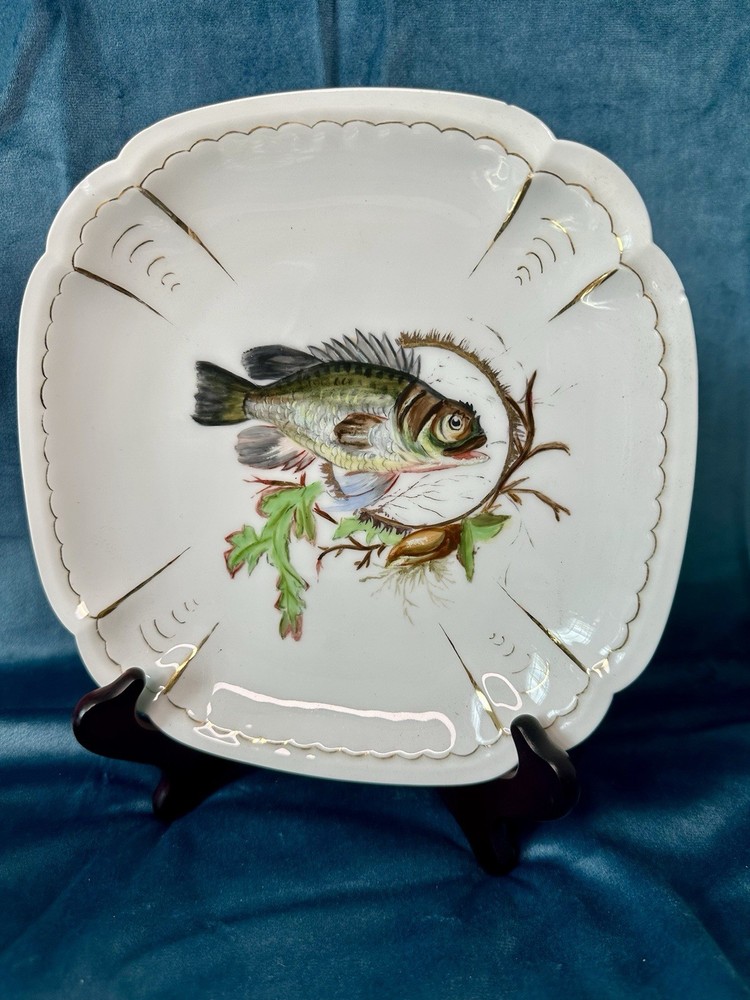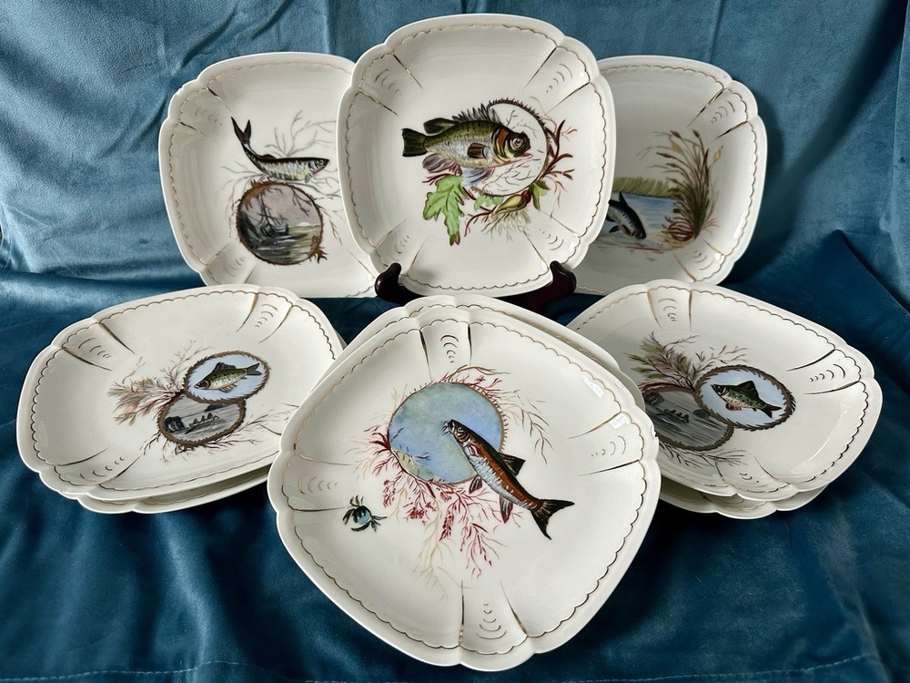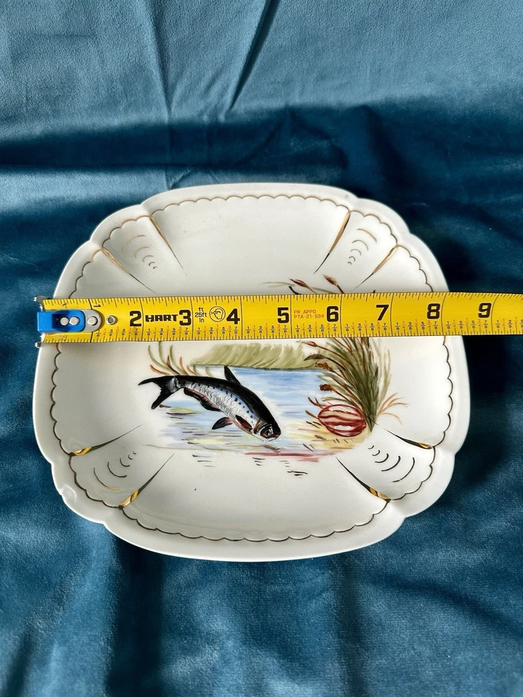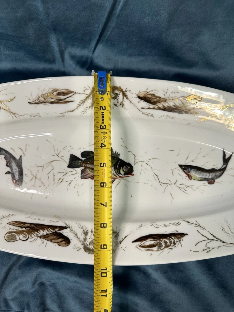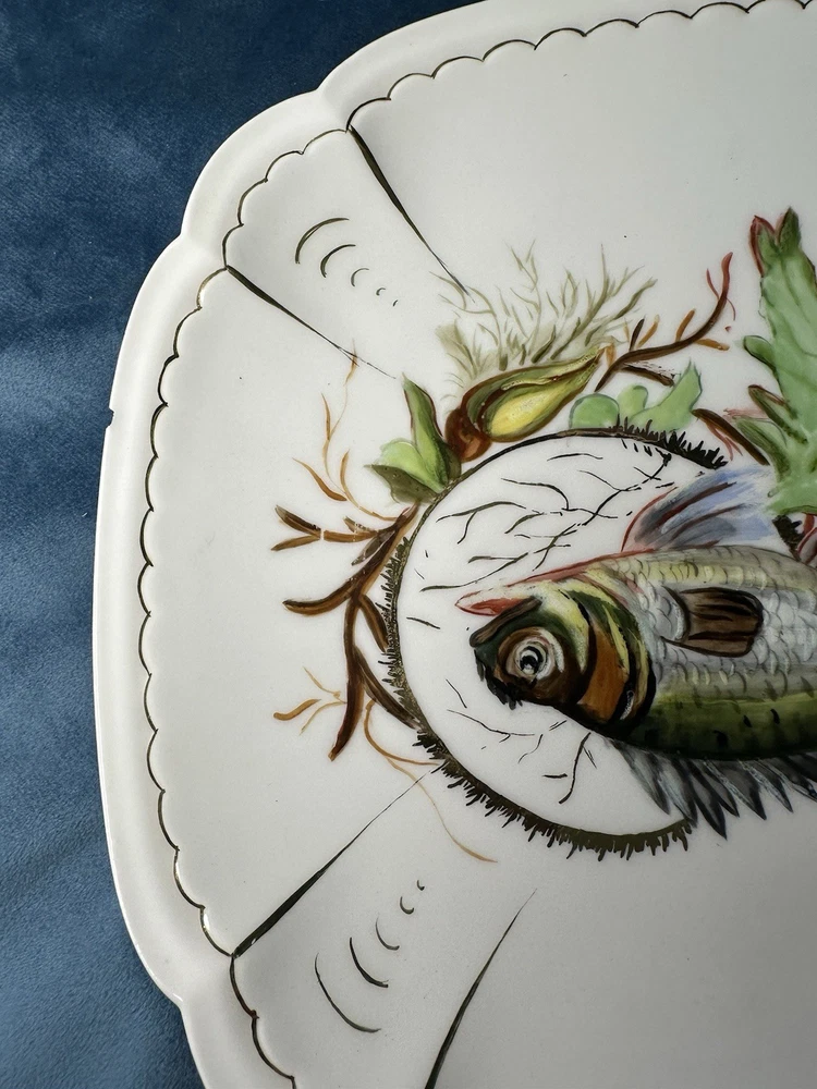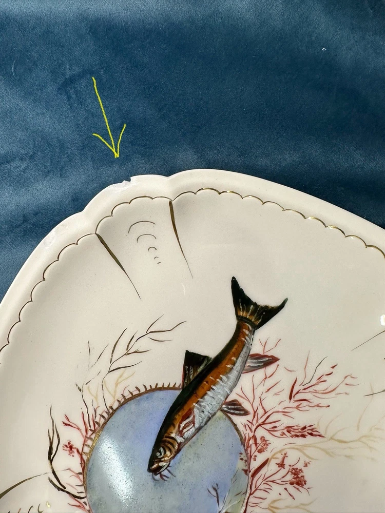 Beautiful and rare 10-piece antique French Limoges porcelain fish service set by M. Redon, circa 1880–1906. The set includes one extra large serving platter (23.75” x 9.75”) and nine matching plates, each featuring finely detailed fish scenes with hand-applied gold accents and painted highlights over transfer decoration. One plate bears the green M. REDON LIMOGES backstamp, typical for high-quality export porcelain from the late 19th century. ⸻ ✨ Set Includes: • 1 Large serving platter – 23.75” x 9.75” • 9 Matching fish-decorated plates – approx. 8.5” ⸻ 📌 Condition: • Excellent antique condition overall • No cracks or repairs • Some plates have small rim chips – see photos • Gold trim shows light wear consistent with age ⸻ This Limoges set is a rare collector’s find — perfect for vintage seafood presentations, display, or elegant antique decor. Priced accordingly due to minor edge wear. 📦 Ships professionally packed and insured. 📍 Local pickup available in Melbourne, Florida.