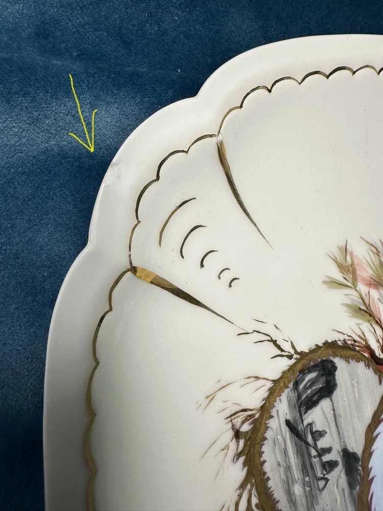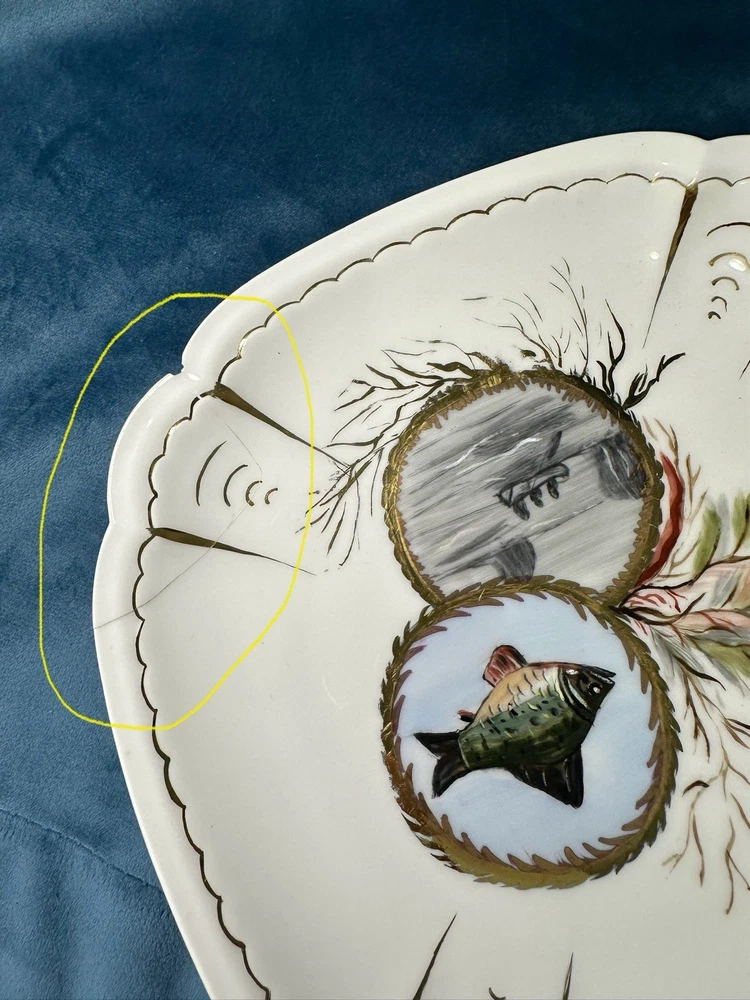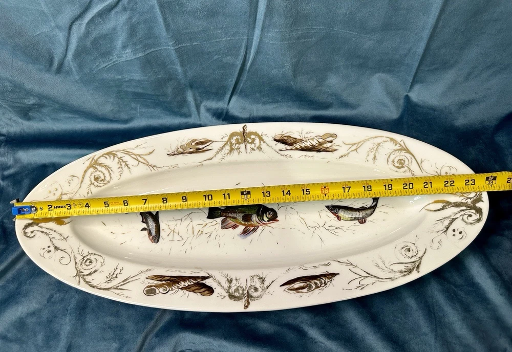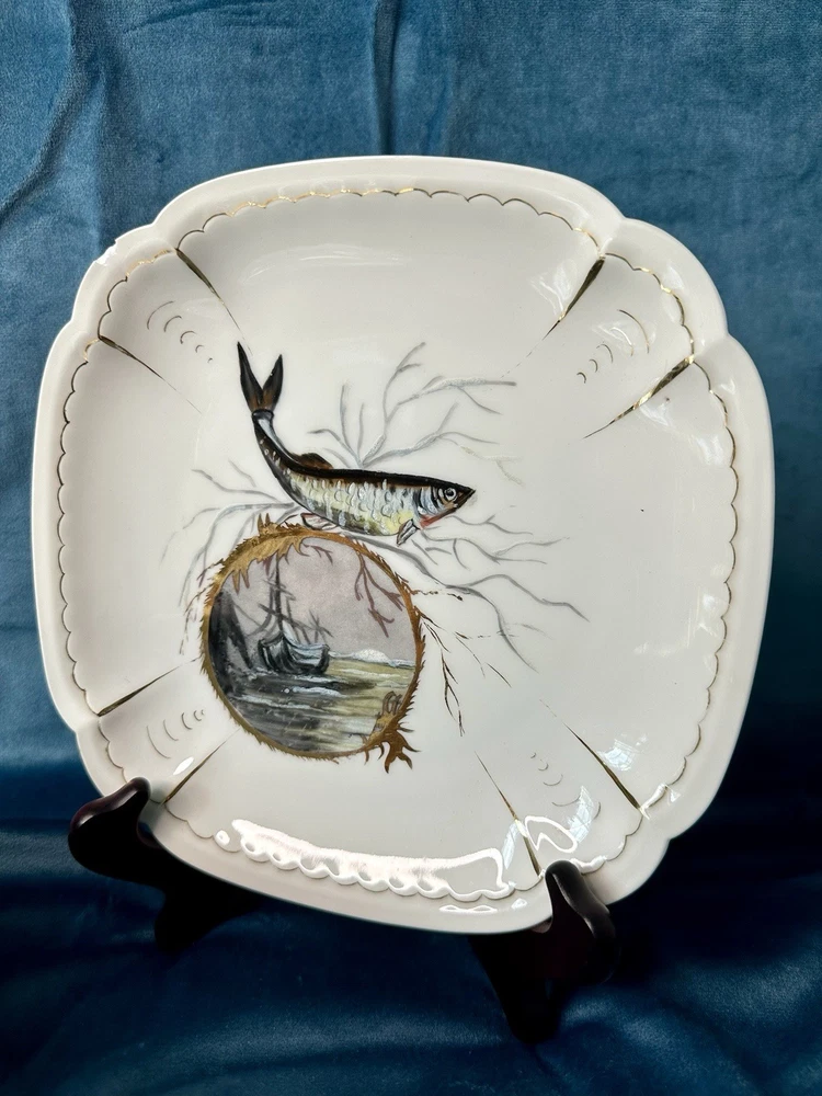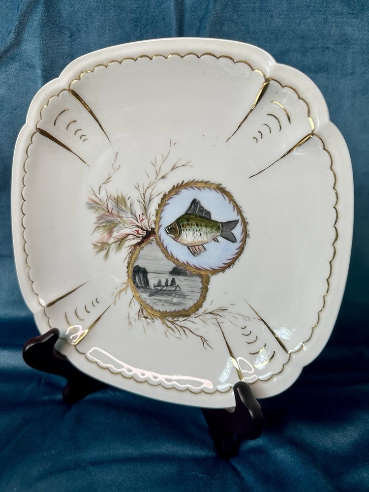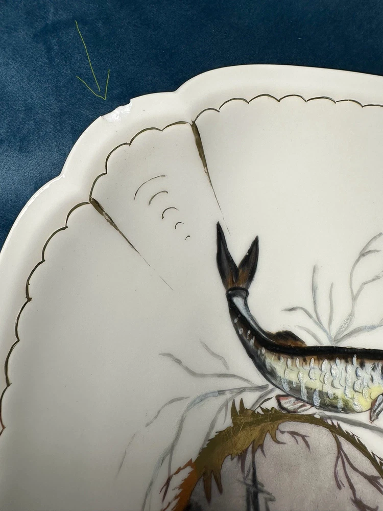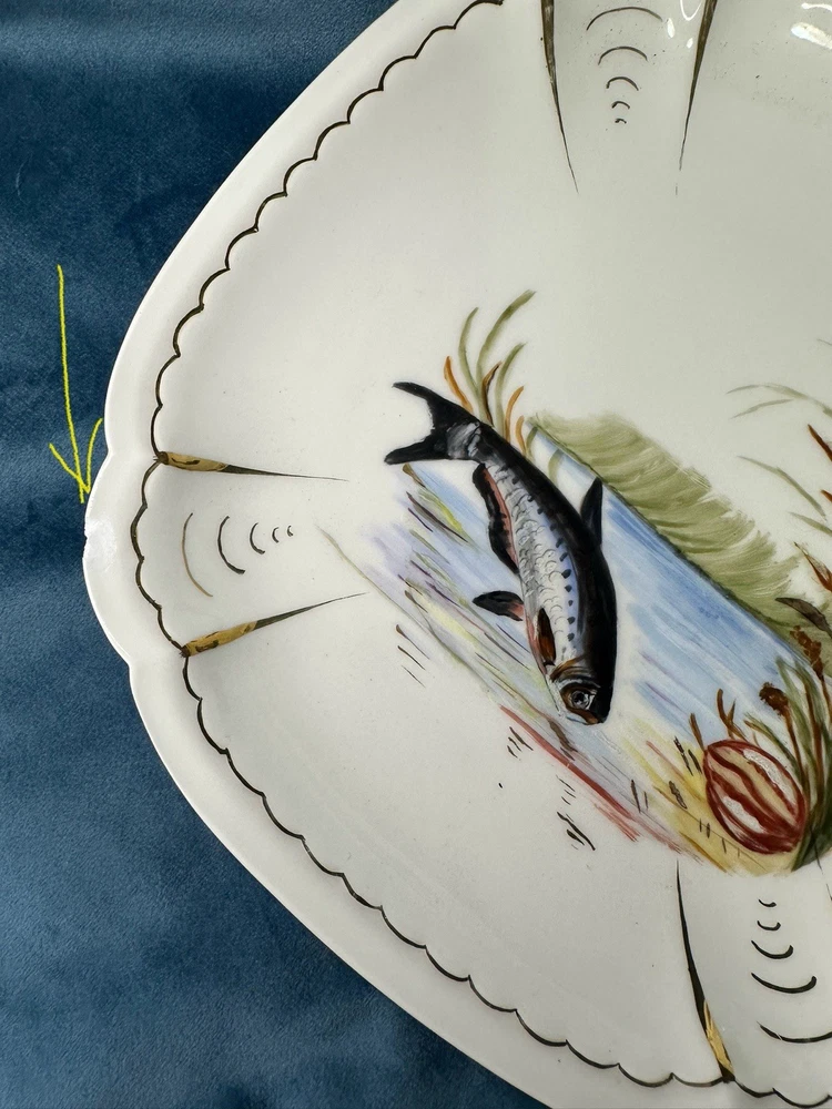 Beautiful and rare 10-piece antique French Limoges porcelain fish service set by M. Redon, circa 1880–1906. The set includes one extra large serving platter (23.75” x 9.75”) and nine matching plates, each featuring finely detailed fish scenes with hand-applied gold accents and painted highlights over transfer decoration. One plate bears the green M. REDON LIMOGES backstamp, typical for high-quality export porcelain from the late 19th century. ⸻ ✨ Set Includes: • 1 Large serving platter – 23.75” x 9.75” • 9 Matching fish-decorated plates – approx. 8.5” ⸻ 📌 Condition: • Excellent antique condition overall • No cracks or repairs • Some plates have small rim chips – see photos • Gold trim shows light wear consistent with age ⸻ This Limoges set is a rare collector’s find — perfect for vintage seafood presentations, display, or elegant antique decor. Priced accordingly due to minor edge wear. 📦 Ships professionally packed and insured. 📍 Local pickup available in Melbourne, Florida.