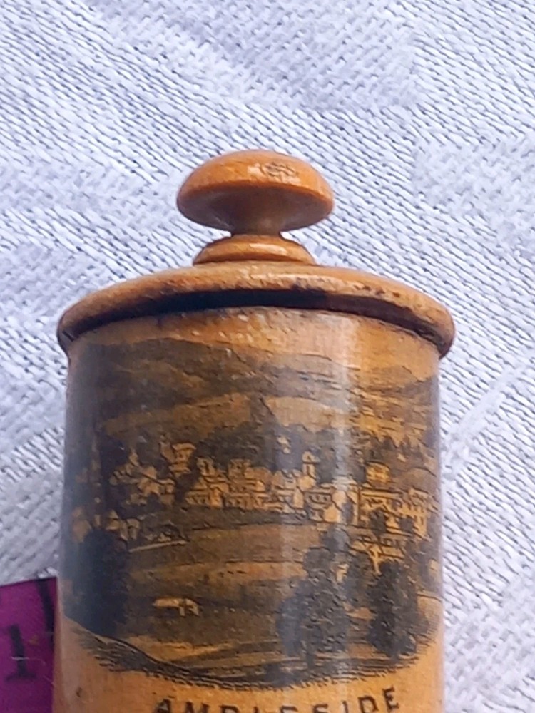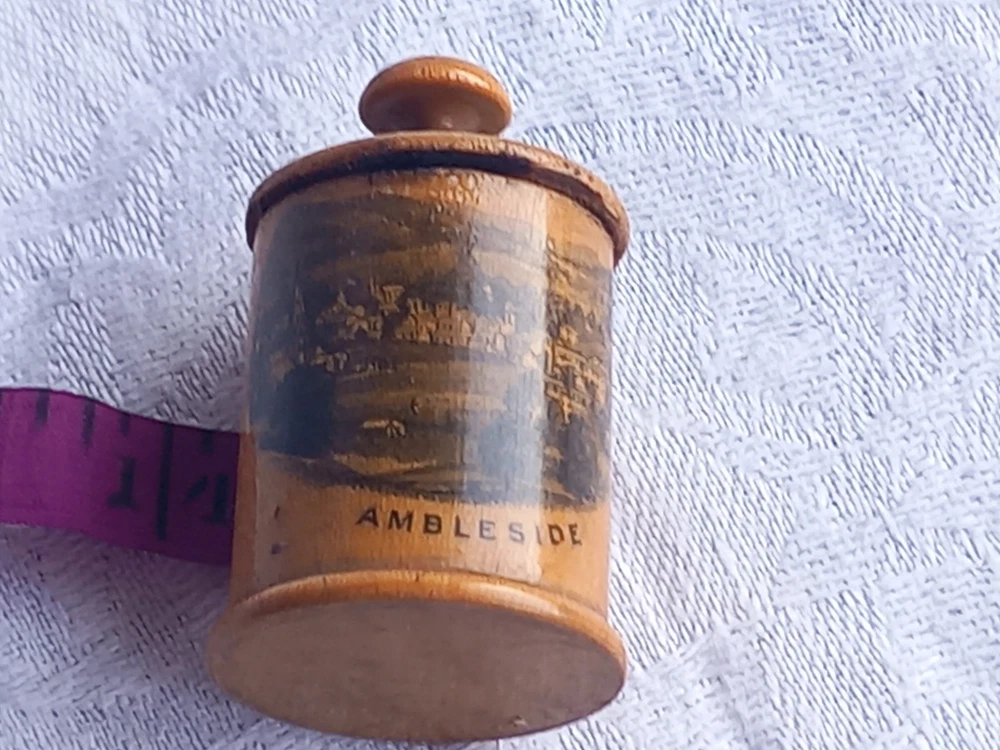 Antique Mauchline ware wooden tape measure with view of Ambleside . It still has original tape but the end is missing,and it winds up The wood is in good condition,it is 4cms tall