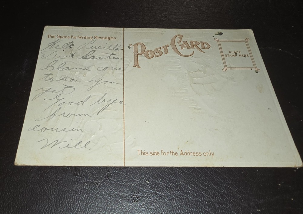 Antique New Years postcard with elves putting bags of money on sleds. The card has lots of added gold trim on it and there are no rips or holes. I will be listing several antique postcards. This came from an estate sale in Iowa. It's a good piece to add to a collection. Please ask questions before bidding or buying. I do combine items to save on shipping costs. Prompt payment is appreciated. Thank you for looking, and we look forward to seeing you back.