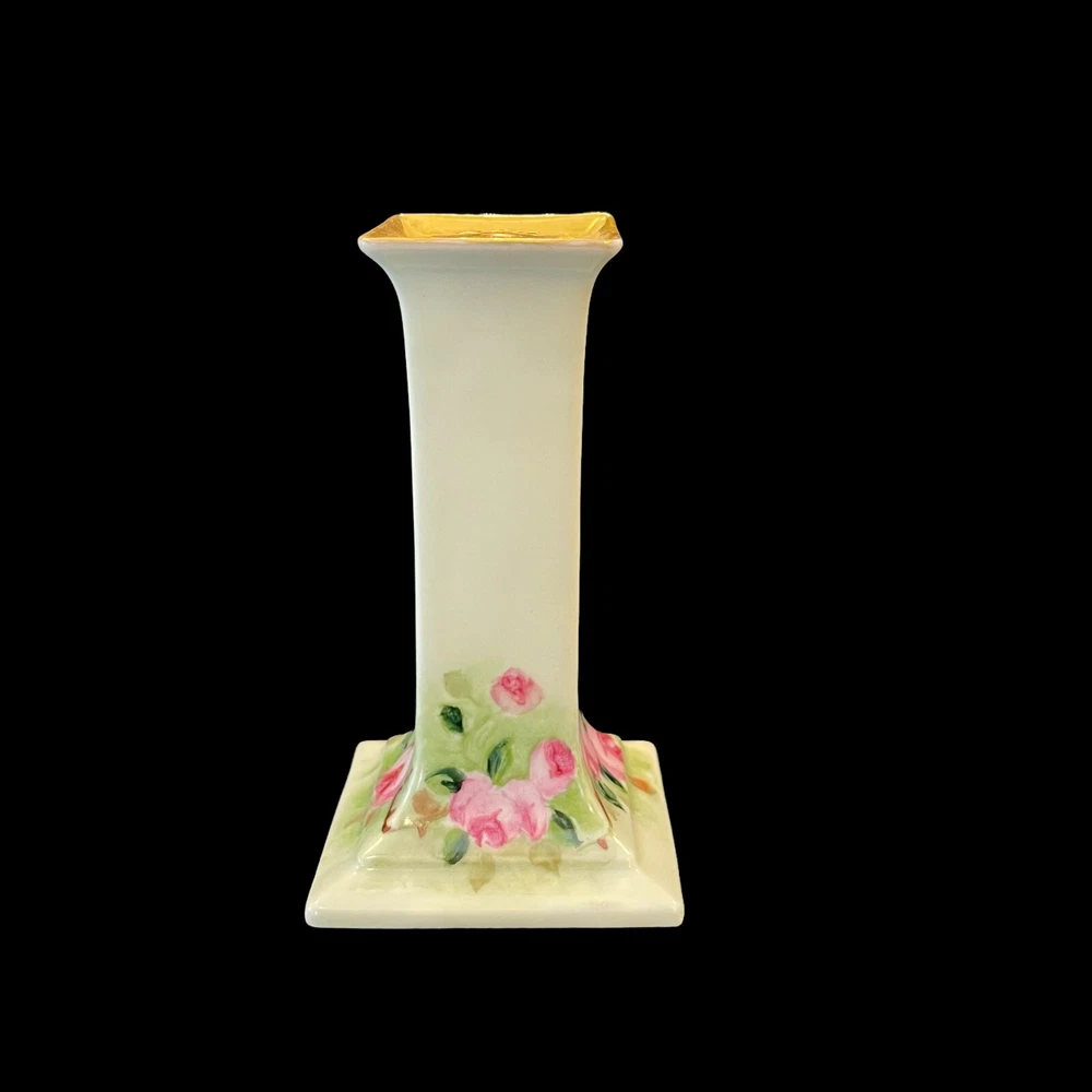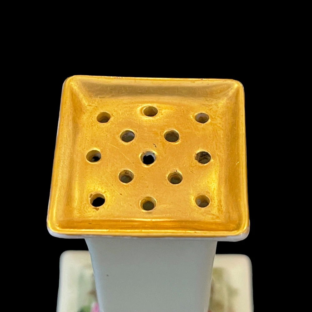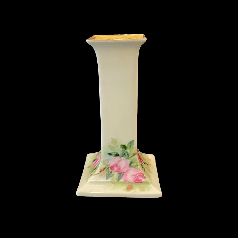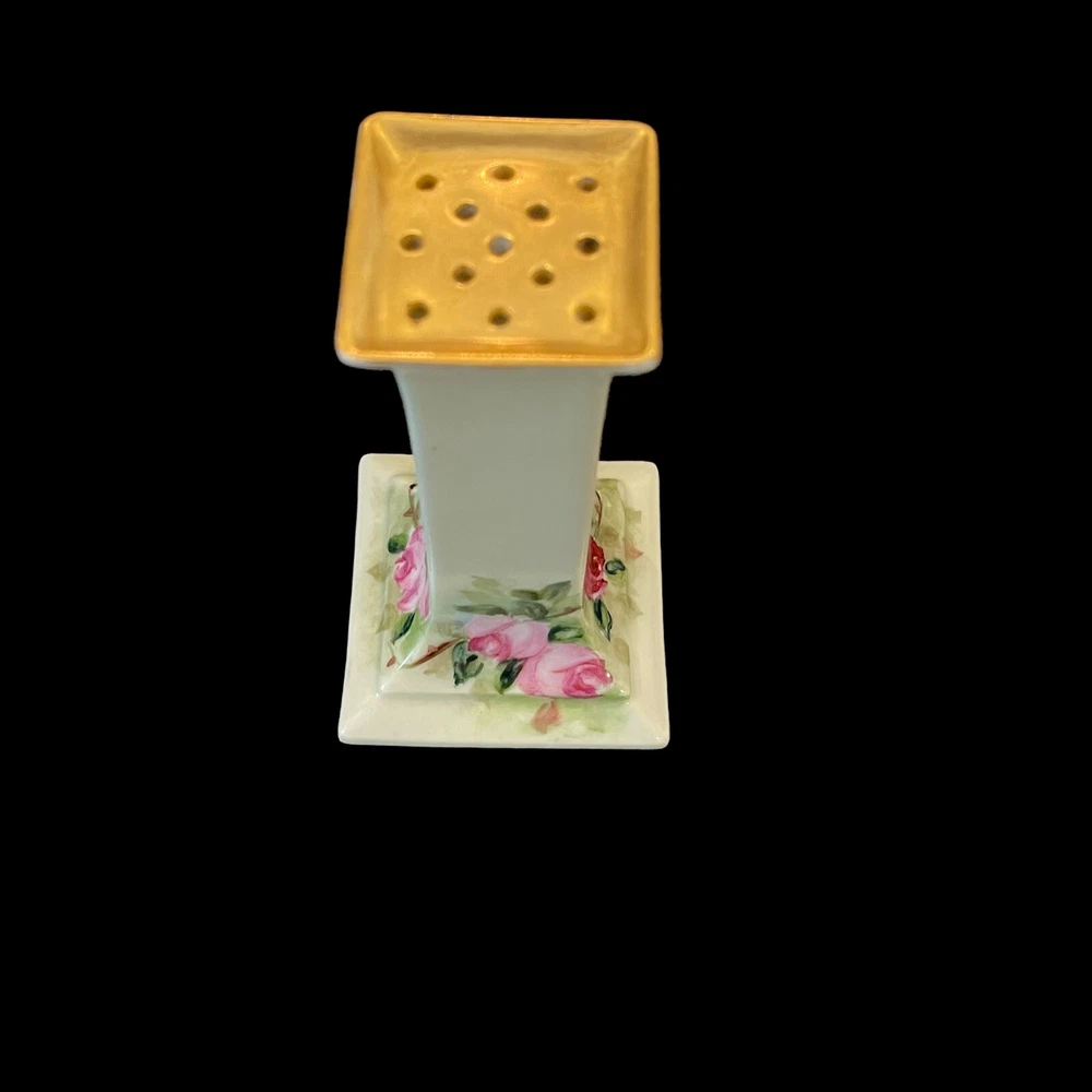Antique O&EG Royal Austria Floral Hand Painted Porcelain Vanity Hat Pin Holder 2 3/8' x 2 3/8" and 4 1/4" tall. 13 hat pin holes. Hand painted pink roses and gold gilt tap. Oscar and Edgar Gutherz (O&EG) Austria stamp on bottom.
