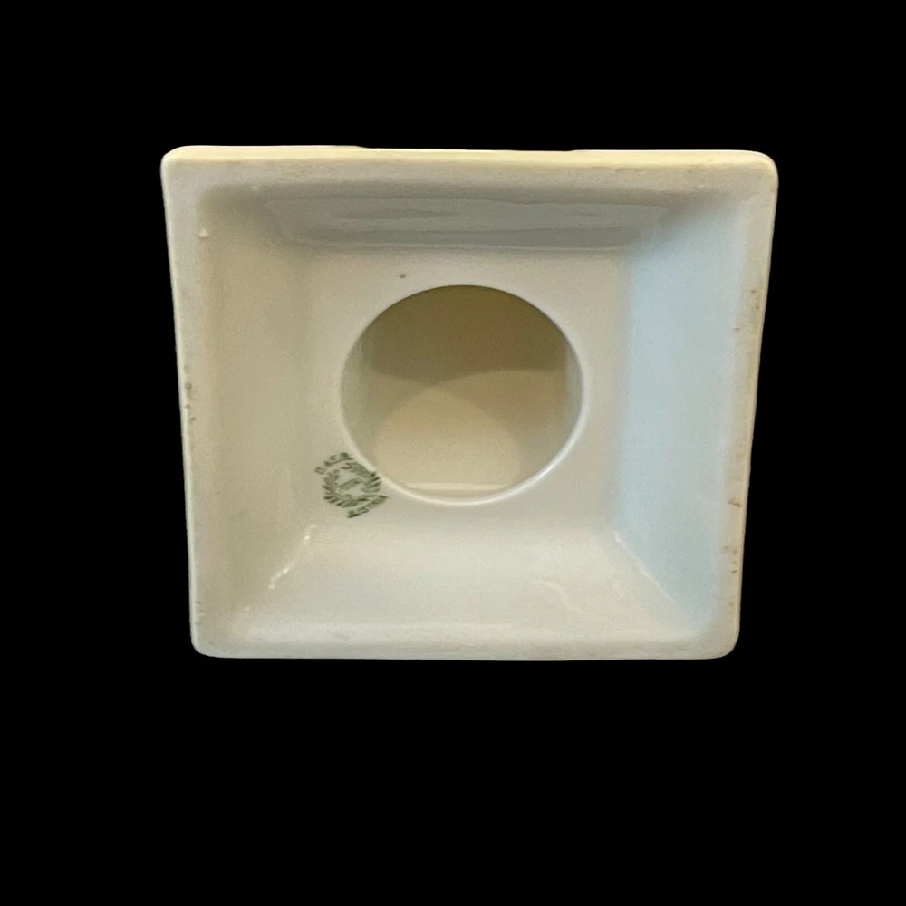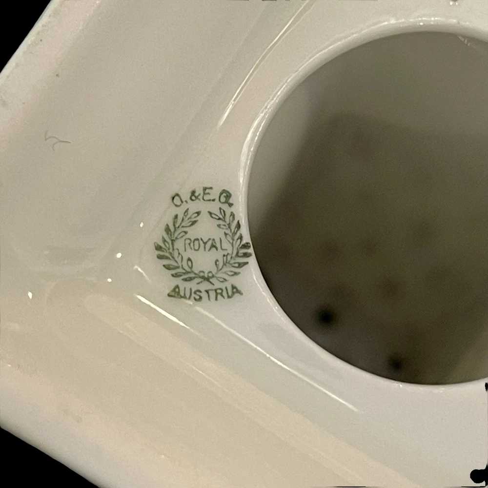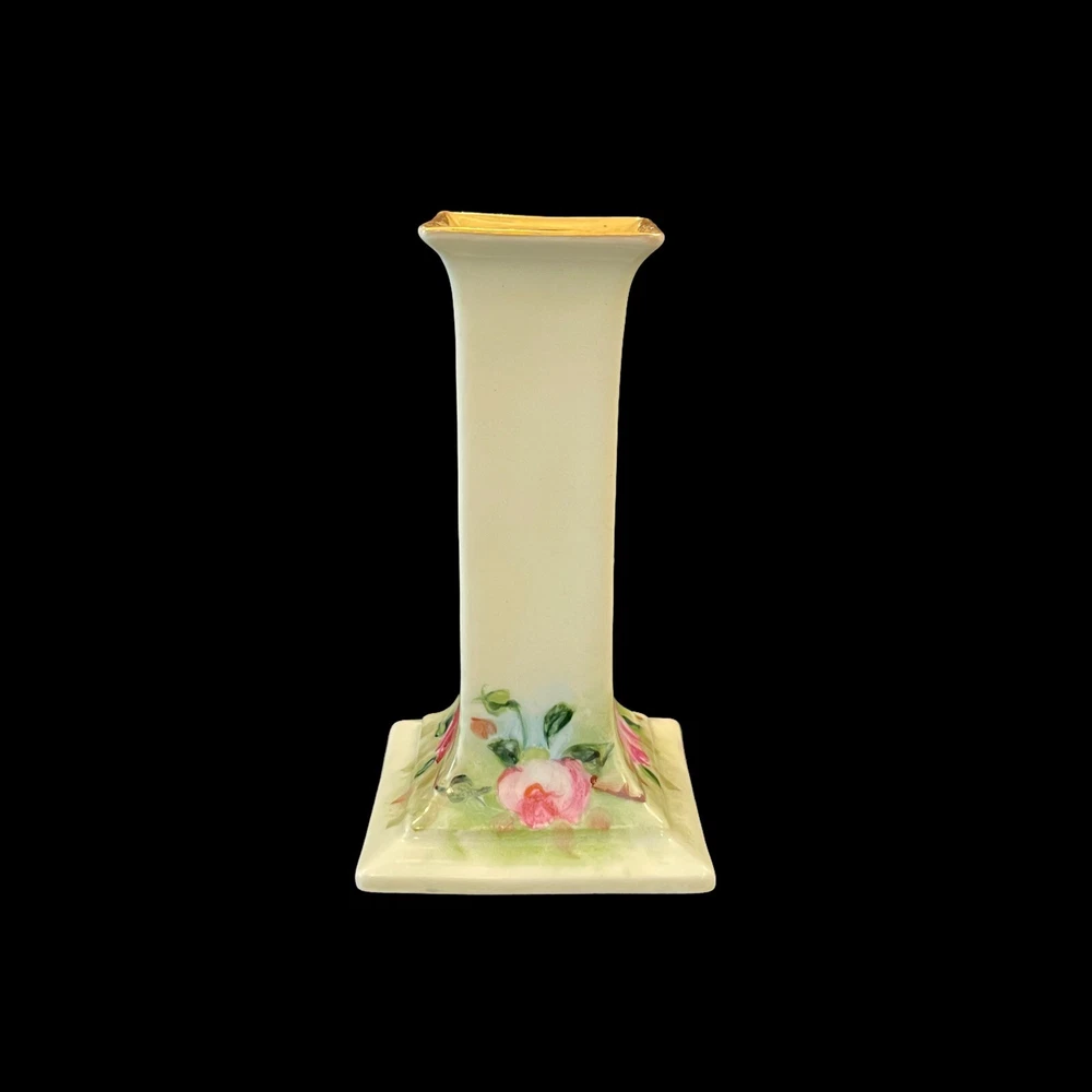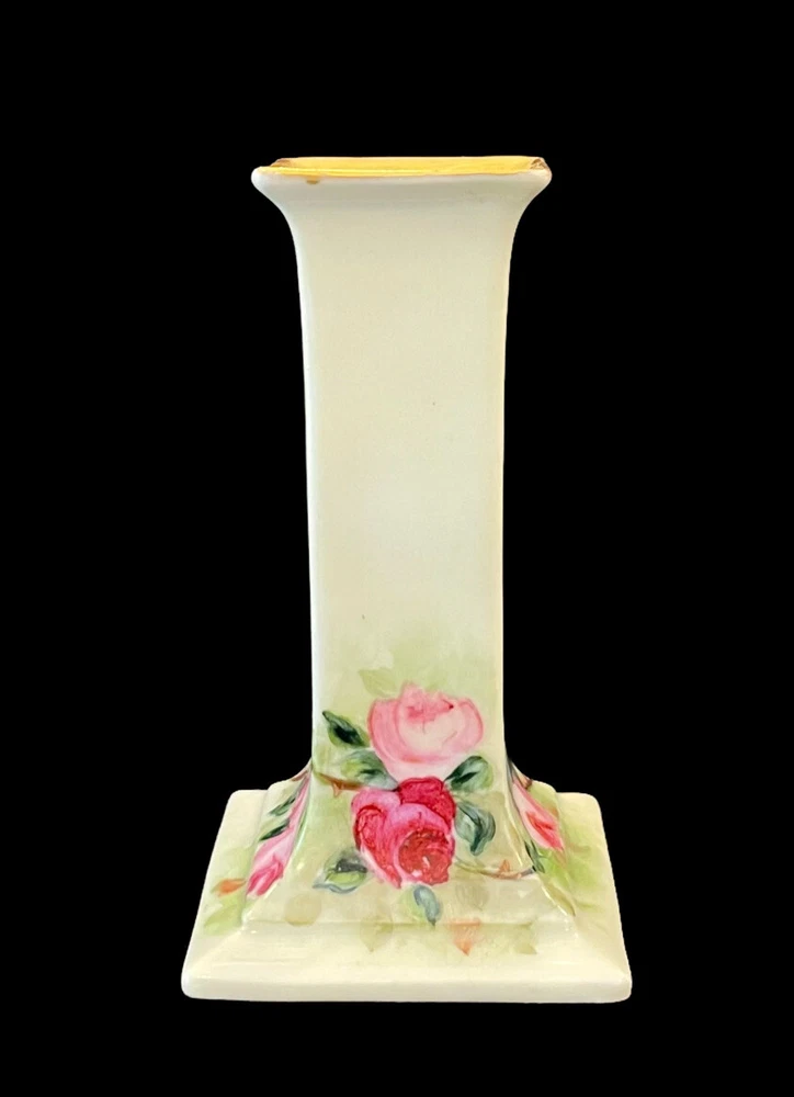 Antique O&EG Royal Austria Floral Hand Painted Porcelain Vanity Hat Pin Holder 2 3/8' x 2 3/8" and 4 1/4" tall. 13 hat pin holes. Hand painted pink roses and gold gilt tap. Oscar and Edgar Gutherz (O&EG) Austria stamp on bottom.