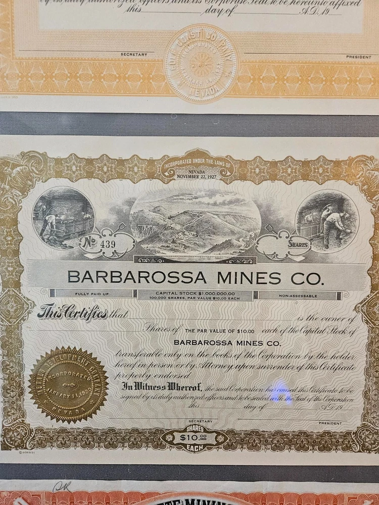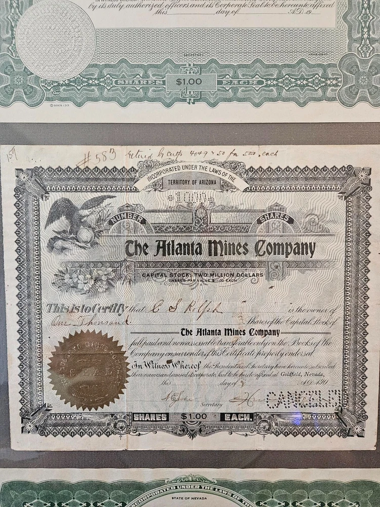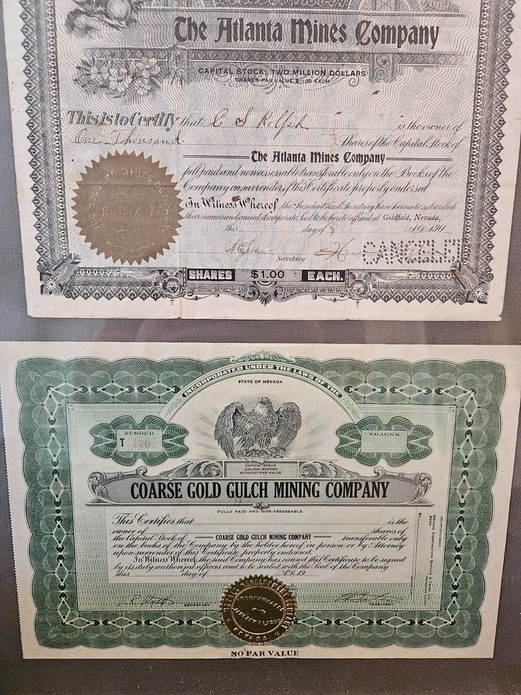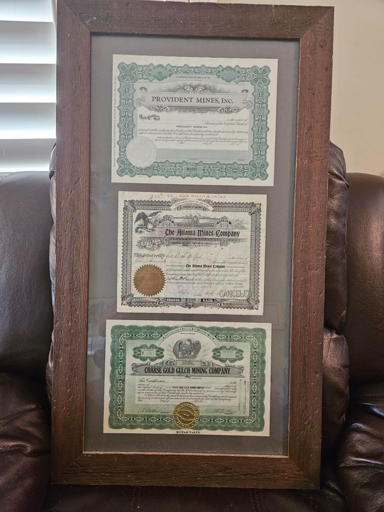 This antique collection features stock certificates from the oil and mining industry, with a total of (8) framed and mounted certificates. The certificates showcase various designs and colors, all from the United States. Each certificate has its own unique history and story to tell, making them a great addition to any collection or investment portfolio. Some of the certificates are circulated and have signatures, while others are blank. Some are dated. This collection is perfect for anyone interested in mining, stocks, and bonds, or for anyone who appreciates the historical significance of these documents. Particulars are: Unsigned certificates from Provident Mines, Forest Oil Company (12/12/1933), Barbarossa Mines Co (1/11/1930), Lone Pine Surprise Consolodated Mining Company, and Pearl Consolodated Mining Company. Signed Certificates: North Butte Mining Company, One hundred shares issued to Thomas Hayes Bartholomew, with four (4) corporate signatures, undated Coarse Gold Gulch Mining Company, two corporate signatures, dated January 11, 1930 Atlanta Mines Company, issued to C.S. Rolph, one thousand shares with two corporate signatures, Canceled documentation. Two of the framed items are 31" x 18" one is 27.5" x 17" $60 has been added to this listing as it has been professionally packaged, and shipping will be estimated after sale, shipping ONLY to the lower US states.