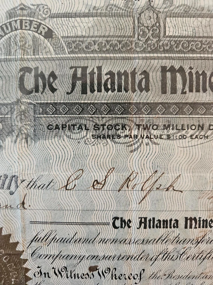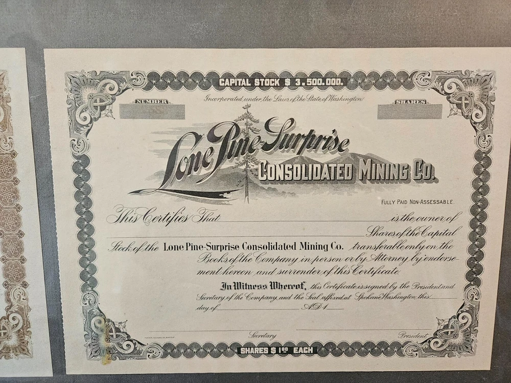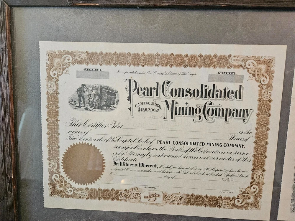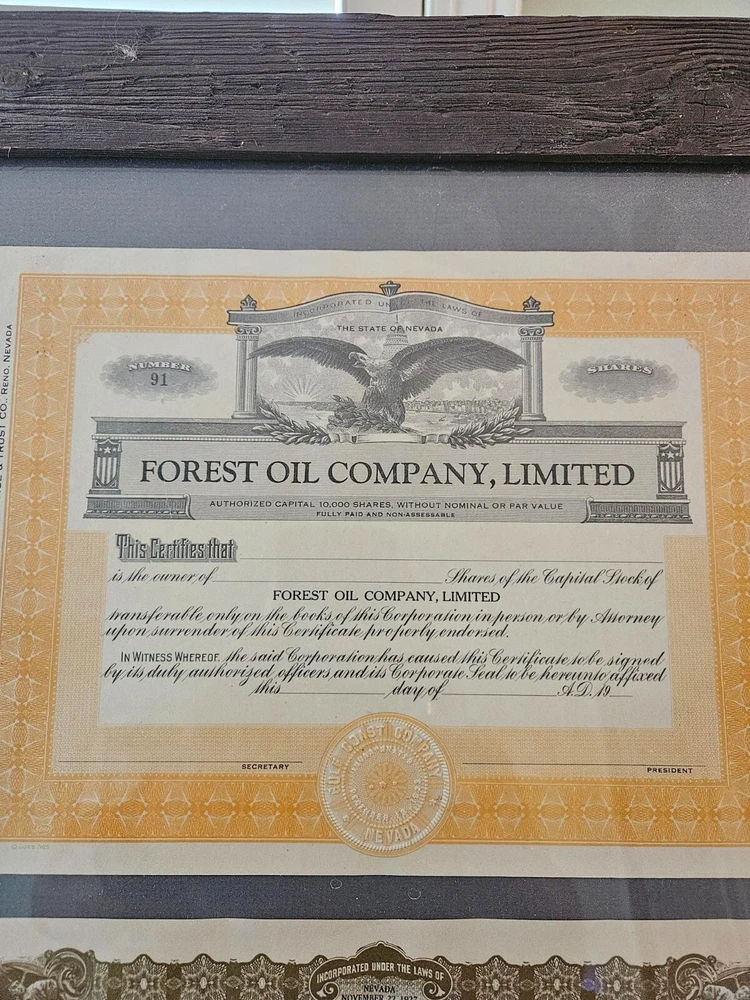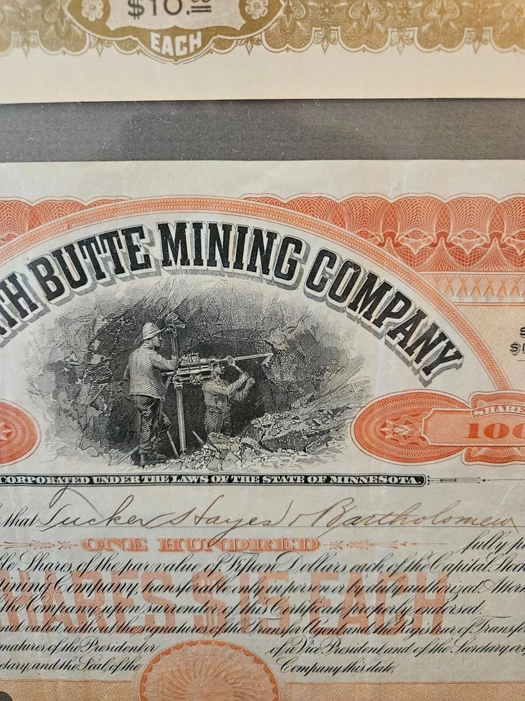 This antique collection features stock certificates from the oil and mining industry, with a total of (8) framed and mounted certificates. The certificates showcase various designs and colors, all from the United States. Each certificate has its own unique history and story to tell, making them a great addition to any collection or investment portfolio. Some of the certificates are circulated and have signatures, while others are blank. Some are dated. This collection is perfect for anyone interested in mining, stocks, and bonds, or for anyone who appreciates the historical significance of these documents. Particulars are: Unsigned certificates from Provident Mines, Forest Oil Company (12/12/1933), Barbarossa Mines Co (1/11/1930), Lone Pine Surprise Consolodated Mining Company, and Pearl Consolodated Mining Company. Signed Certificates: North Butte Mining Company, One hundred shares issued to Thomas Hayes Bartholomew, with four (4) corporate signatures, undated Coarse Gold Gulch Mining Company, two corporate signatures, dated January 11, 1930 Atlanta Mines Company, issued to C.S. Rolph, one thousand shares with two corporate signatures, Canceled documentation. Two of the framed items are 31" x 18" one is 27.5" x 17" $60 has been added to this listing as it has been professionally packaged, and shipping will be estimated after sale, shipping ONLY to the lower US states.