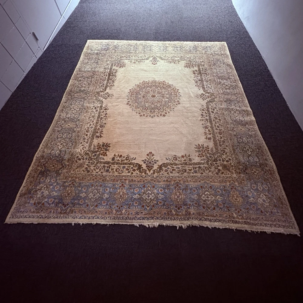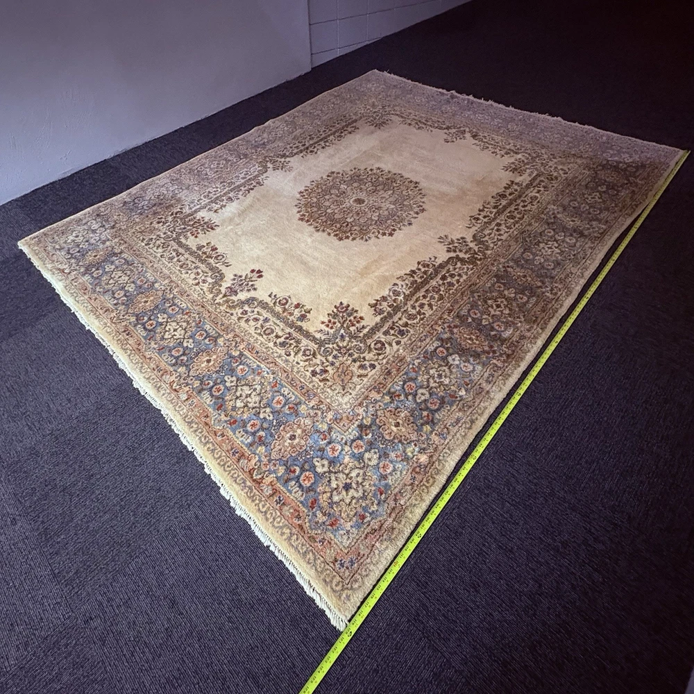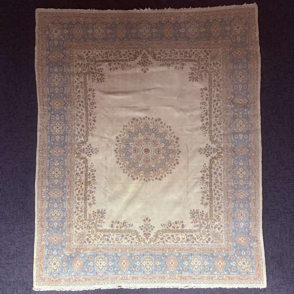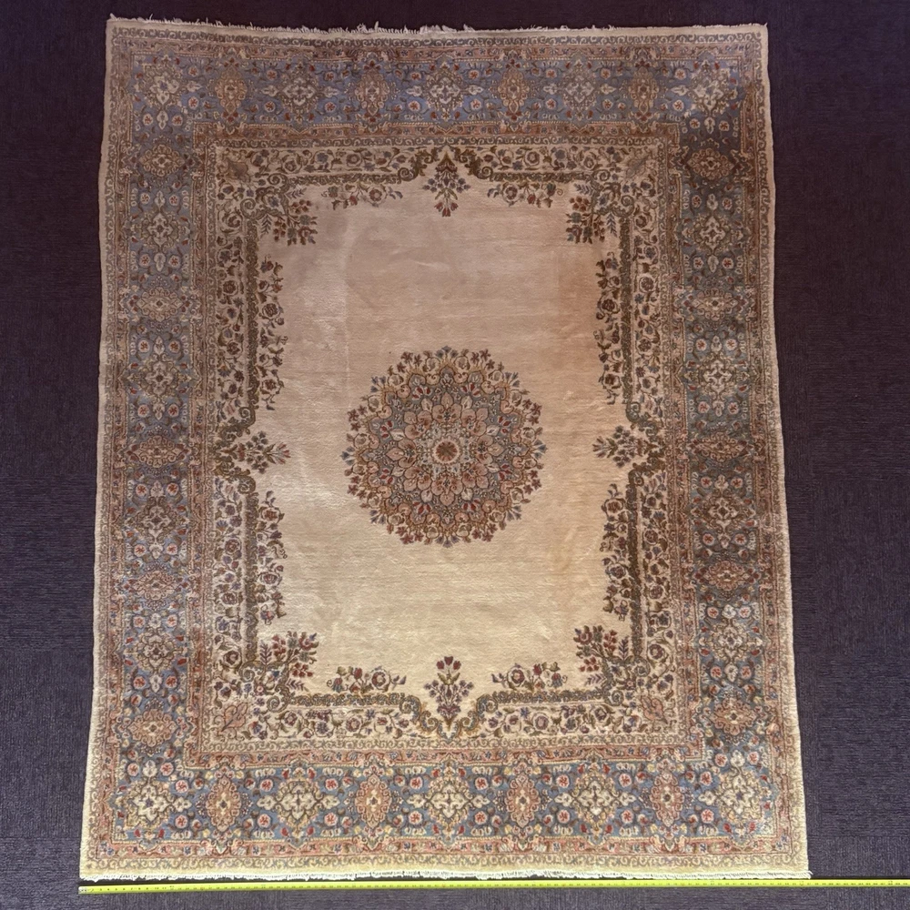This Antique Persian Kirman Rug features a traditional design in soft pastel colors, with a semi-open field and medallion pattern. Handmade in the 1960s, with a knot count of 289 KPSI this 8'x10' area rug is a fine example of Oriental and Persian weaving techniques. Made from wool and cotton, this vintage piece adds a touch of elegance and history to any room in your home. The intricate hand-knotted weave and traditional style make it a unique and timeless addition to your decor.