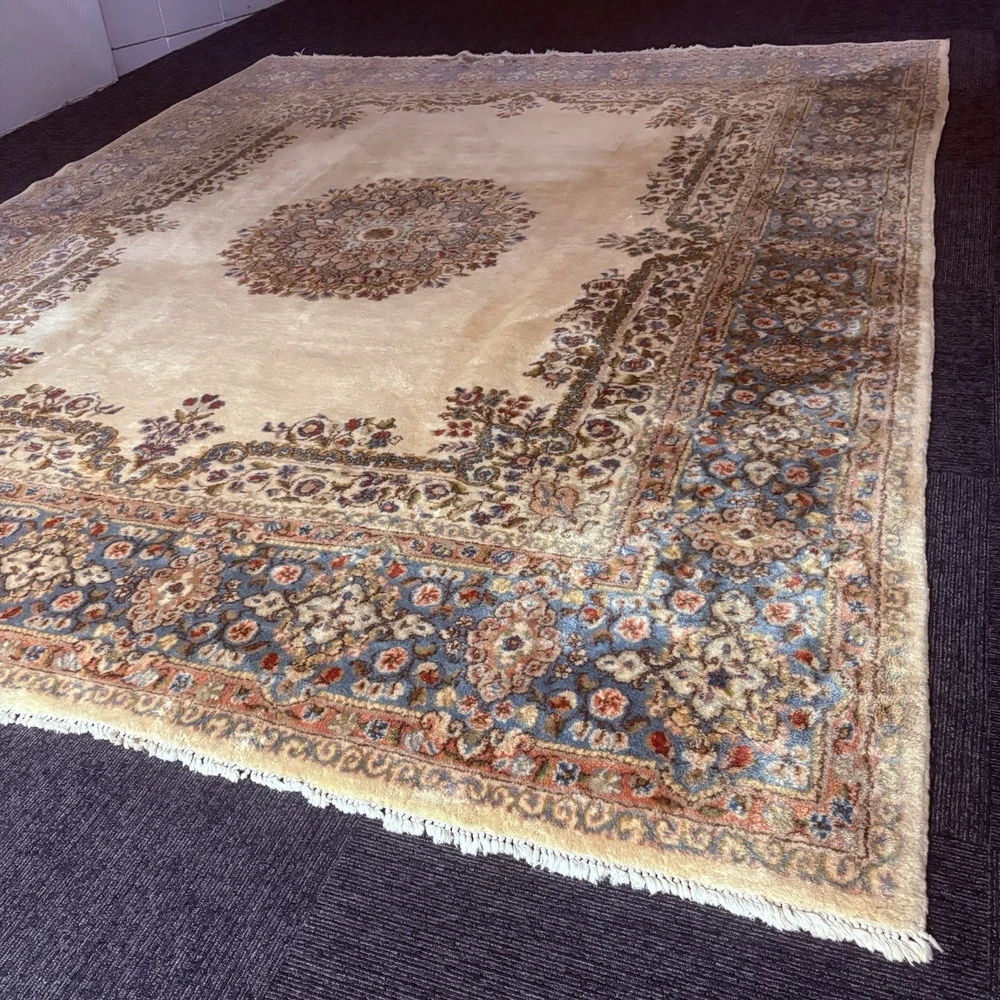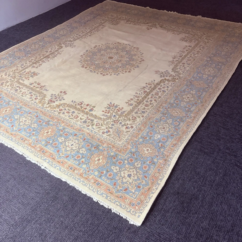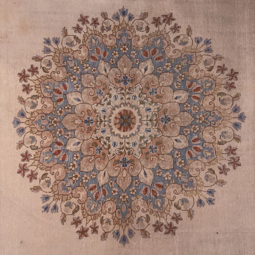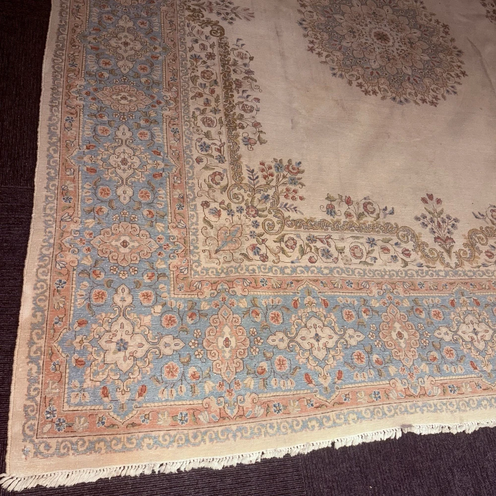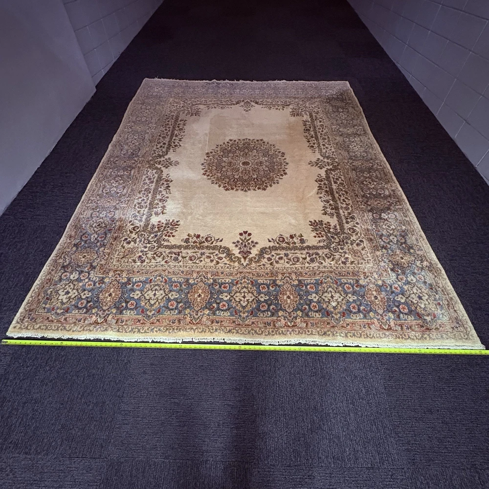 This Antique Persian Kirman Rug features a traditional design in soft pastel colors, with a semi-open field and medallion pattern. Handmade in the 1960s, with a knot count of 289 KPSI this 8'x10' area rug is a fine example of Oriental and Persian weaving techniques. Made from wool and cotton, this vintage piece adds a touch of elegance and history to any room in your home. The intricate hand-knotted weave and traditional style make it a unique and timeless addition to your decor.