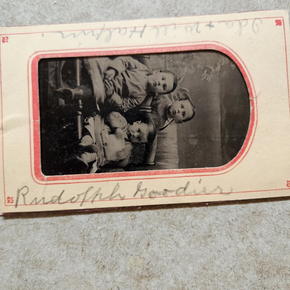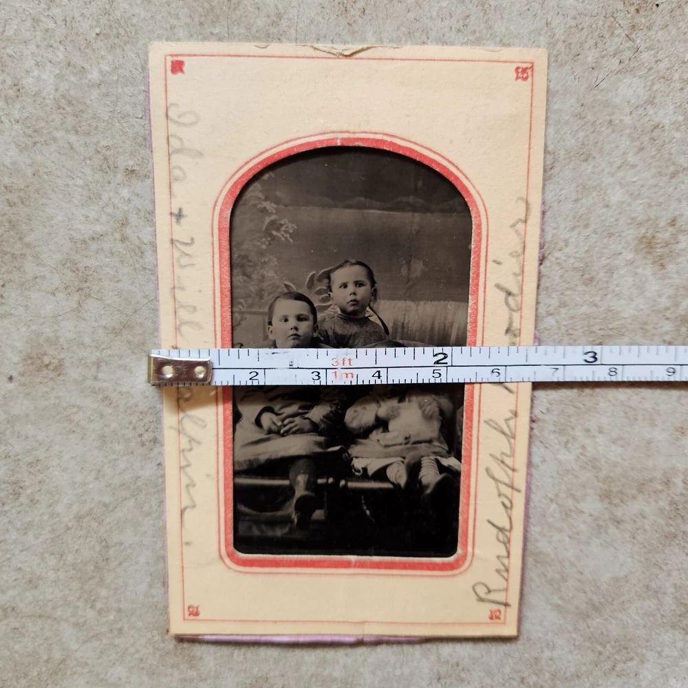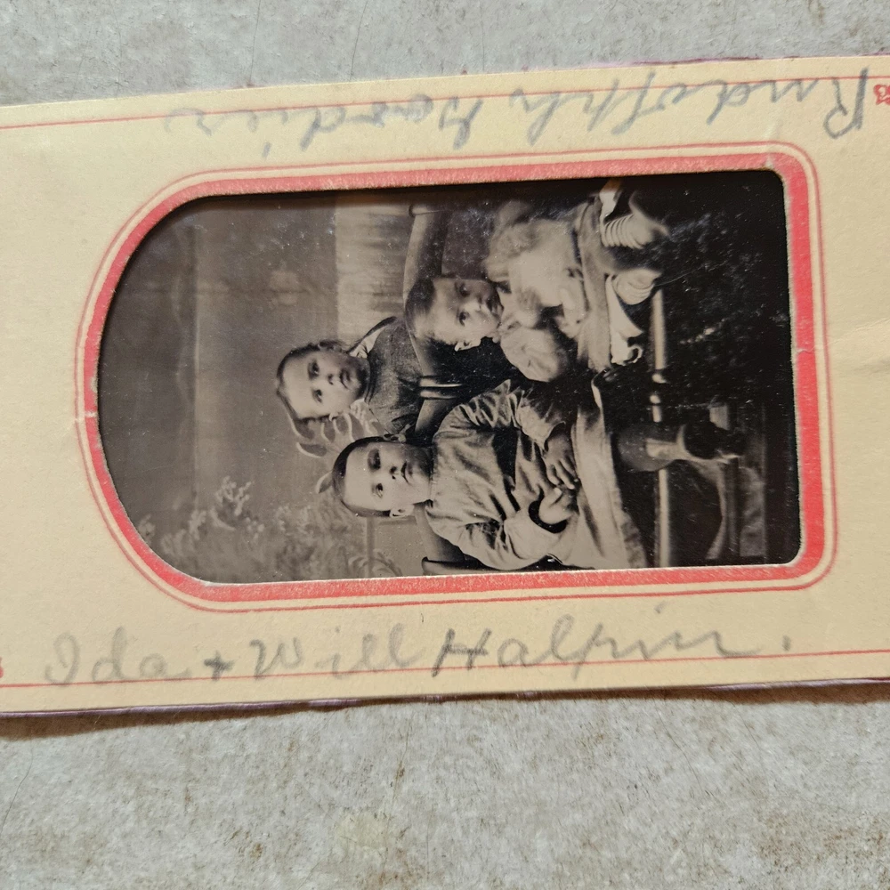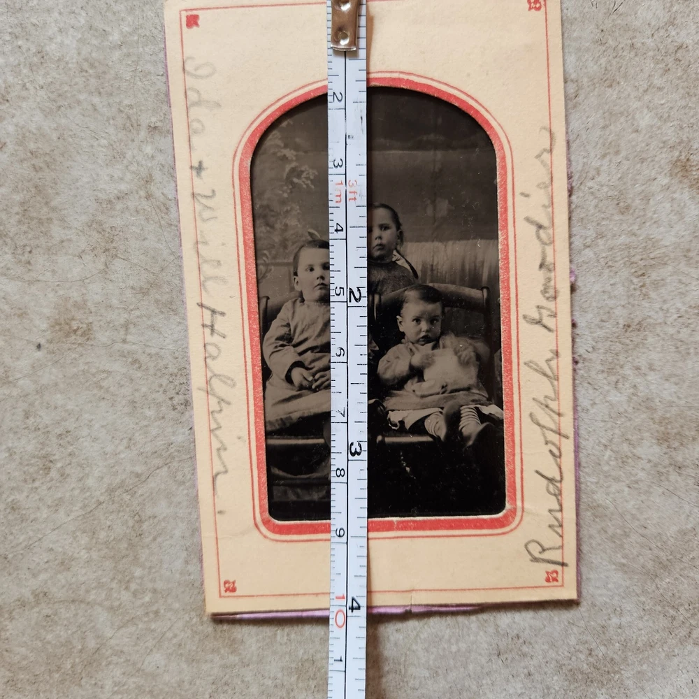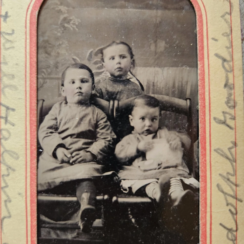 Any information on this type of print would be helpful. Old, Antique. 3 small children The photo is In a matte paper frame. Dimensions are in photos. This print is thick, but not glass. Not a flimsy print. I have more from this lot/album. Appears to be many family portraits from the 1800s and early 1900s. Please message me with any questions or interest in more family photographs from this lot.