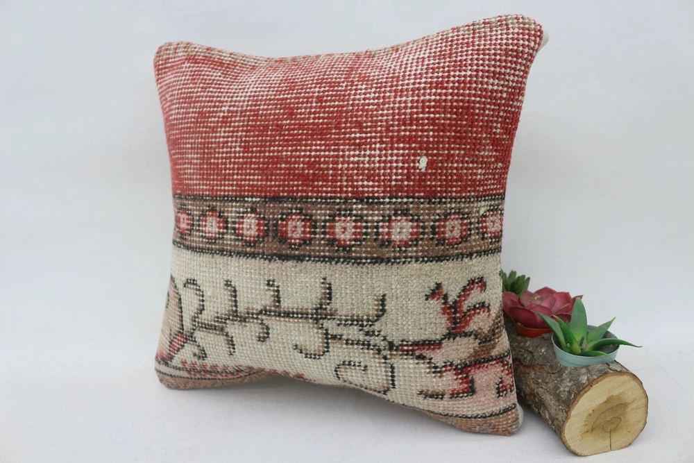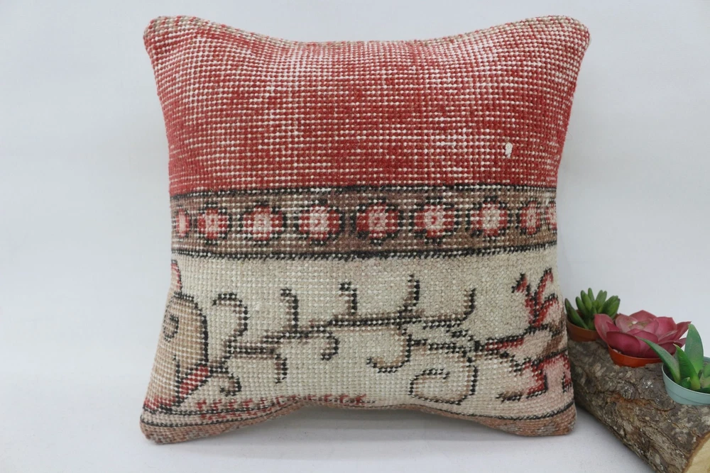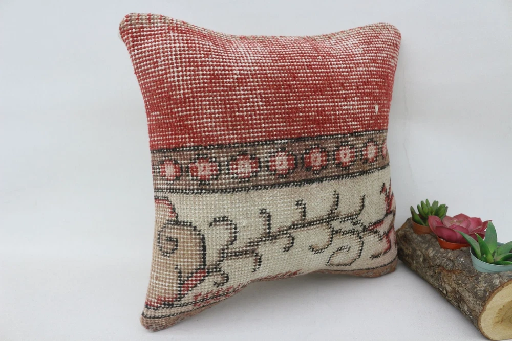 Antique Pillows, 14"x14" Red Cushion Cover, Handmade Kilim Cushion