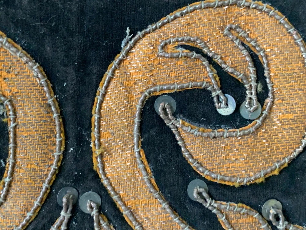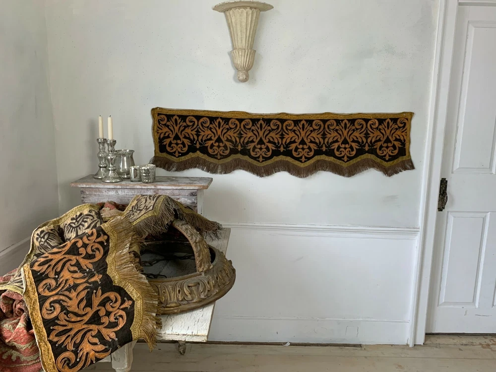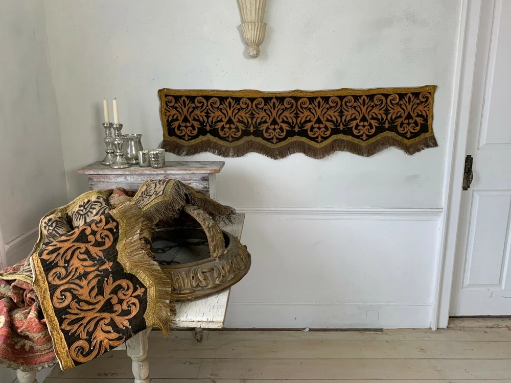 ~*~ Hello and Welcome to The Textile Trunk! Please follow us on Instagram @textiletrunk ~*~ We are so incredibly fortunate to have acquired a remarkable collection of beautiful 18th century Portuguese brocade and appliqué panels! (Please visit my store category called “1700s Brocade Appliqué” to see additional pieces in our collection!) Exquisite and rare, these textiles date from approximately 1725-1750. These pieces were found lovingly stored in a convent but are not religious; in the 18th century (and prior), when expensive textiles became unfashionable the aristocracy would often donate pieces such as these to the church as a way of gaining favor with God. Thankfully, due to being so carefully stored, they remained in the state in which they were donated! Due to their bold, large-scale designs, we can deduce that most likely these incredible pieces would have hung in a large, grand (and no doubt opulent!) room. The back of these textiles often have inventory stamps from throughout the years of being stored and cataloged through time. This listing is for ONE valance; this textile is a remarkable, hand worked combination of Genoa velvet with hand stitched woven brocade designs. The brocade appliqué was backed in paper before being hand stitched in place. They are trimmed in a hemp cording that was first wrapped in a metallic thread that used linen and possibly some silk. It is a remarkable find, ideal for any collector or museum. This textile would also make beautiful wall hangings or decorative table runners, or these could be deconstructed for the fabric – they would incredible made into pieces such as decorative pillows. MEASUREMENTS: This textile measures approximately 13 inches long at the side and 14 inches long at the deepest point (including the 2.5 inch long metallic fringe) by 58 inches wide CONDITION: This piece has been kept in the original, as found condition, and has not ever been laundered. This textile is over 270 years old and is in remarkable condition for its age. There will be flaws on this textile commensurate with age. Some of the brocade and velvet are fragmenting, which is totally and utterly expected for the age of this piece. It’s in good condition for its age but is not without the signs of time and use. There may be some voiding in the velvet, some unraveling of the stitching for the applique, and/or some marks on the back where it once hung on a cold stone wall. Please note the importance of viewing the photographs carefully (and using the zoom feature) to view the condition of each piece in detail, as that is the best guide to be sure it’s right for your project or use. Please do feel free to email me with any questions about a specific piece; we are always here to help and are happy to answer questions! inv #: P58