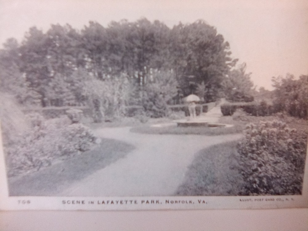 The product is an antique postcard featuring a scene in Lafayette Park, Norfolk. This original real photo postcard measures standard size (5.5 x 3.5 inches) and was taken in the era of Undivided Back (1901-1907). The postcard captures the charm of Lafayette Park, showcasing the picturesque landscape, community life, and famous places of Norfolk, Virginia. With a theme of tourism, travel, and social history, this collectible piece is a unique glimpse into the past of a historic park in Norfolk.