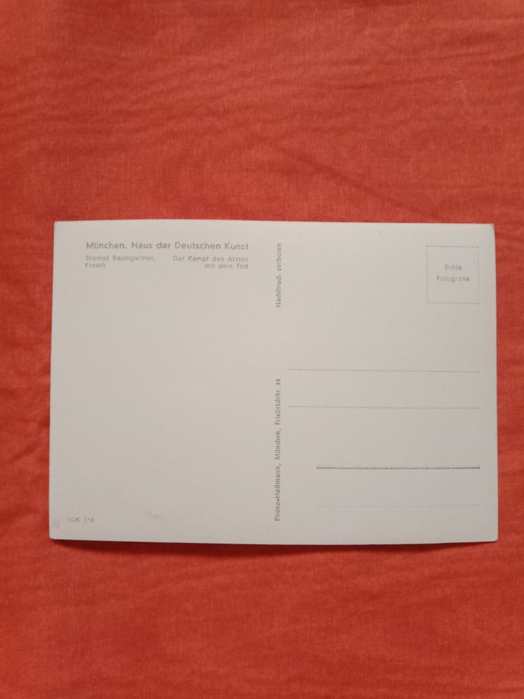 Seltene Kunstpostkarte -Der Kampf des Arztes mit dem Tod - Sepia Fotoabzug aus dem Fotoatelier Heinrich Hoffmann ,München 1935. Verkauft im Haus der deutschen Kunst , München . Künstler Thomas Baumgart, Kreuth.