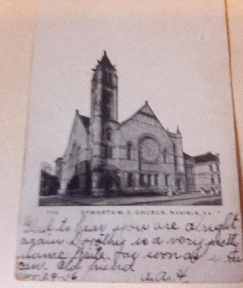 The product is an antique postcard featuring the Epworth M.E. Church in Norfolk, Virginia, posted in 1906. This original printed (lithograph) postcard depicts a church building in the United States during the undivided back era. The postcard, measuring a standard size of 5.5 x 3.5 inches, captures the architecture and social history of the community, making it a valuable collectible item for those interested in religious and historical landmarks.