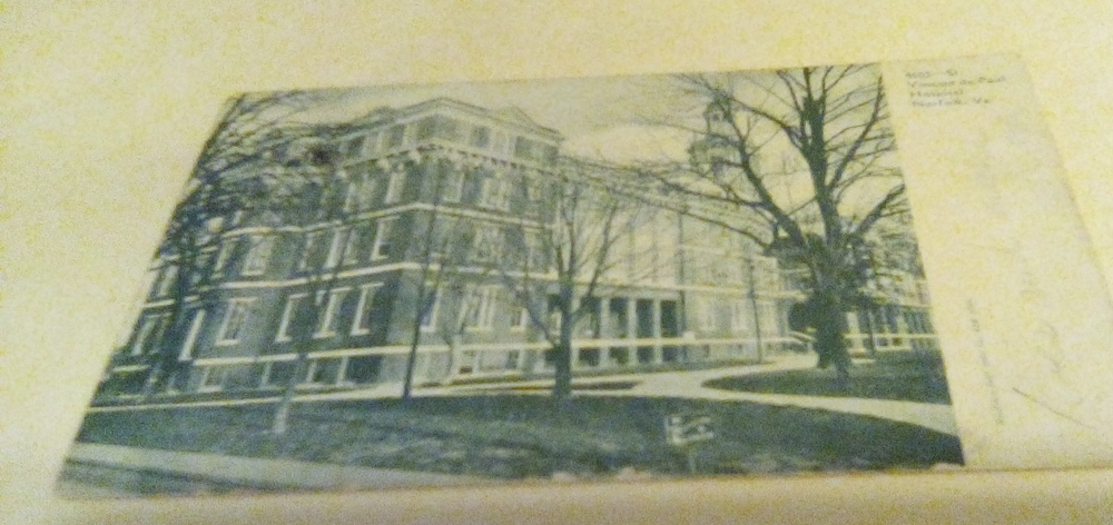 The product is an antique postcard featuring the Vincent De Paul Hospital in Norfolk, Virginia, posted in 1905. This original printed lithograph postcard captures a piece of North American history from the early 20th century. Measuring at a standard size of 5.5 x 3.5 inches, this collectible item provides a glimpse into the cities and towns of Virginia during the Undivided Back era. Made of paper, this postcard is a unique addition to any postcard or historical memorabilia collection.