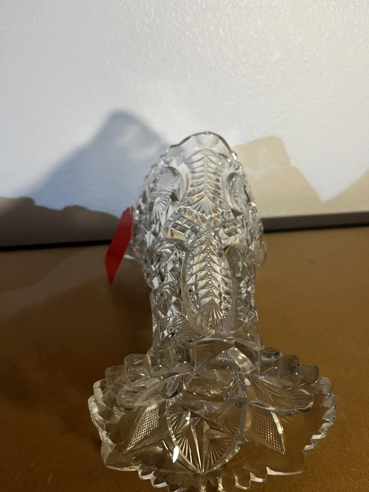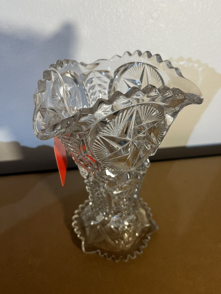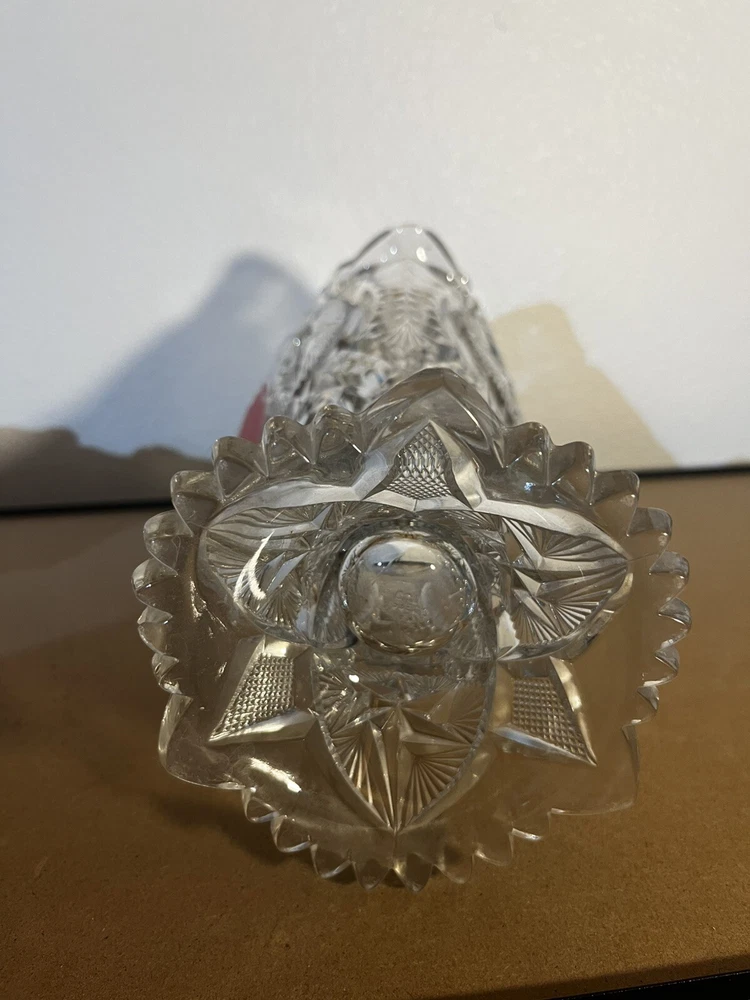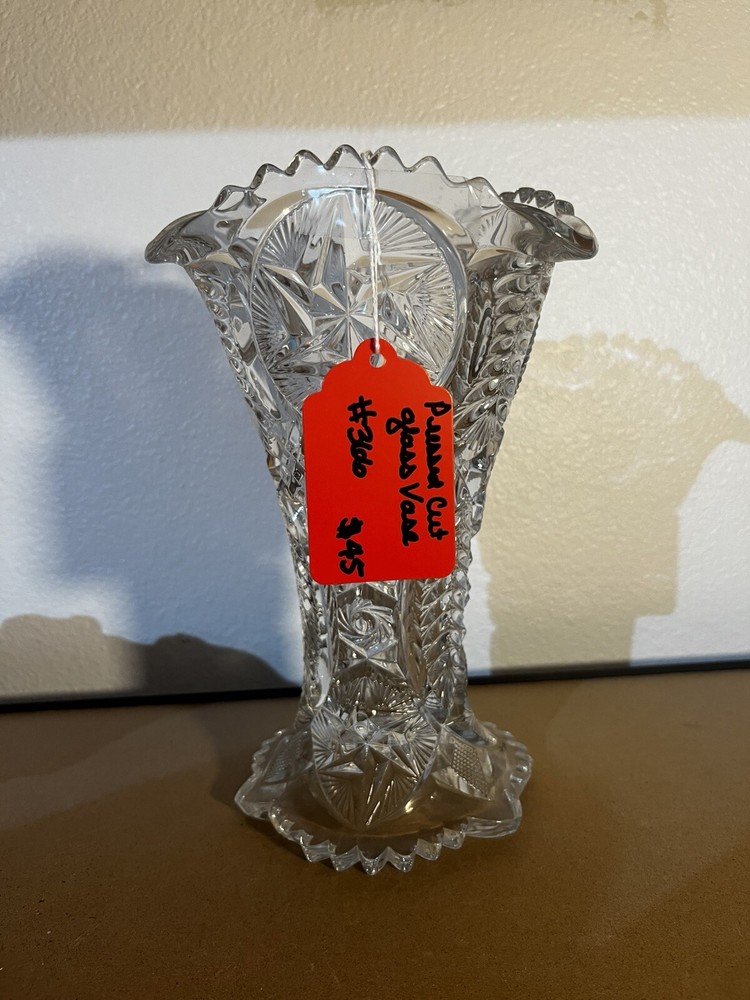 The Vintage Pressed Cut Glass Vase is a decorative collectible made of glass. It features a classic design with intricate pressed cut detailing. Perfect for displaying flowers or as a standalone decor piece, this vase adds a touch of vintage charm to any space.