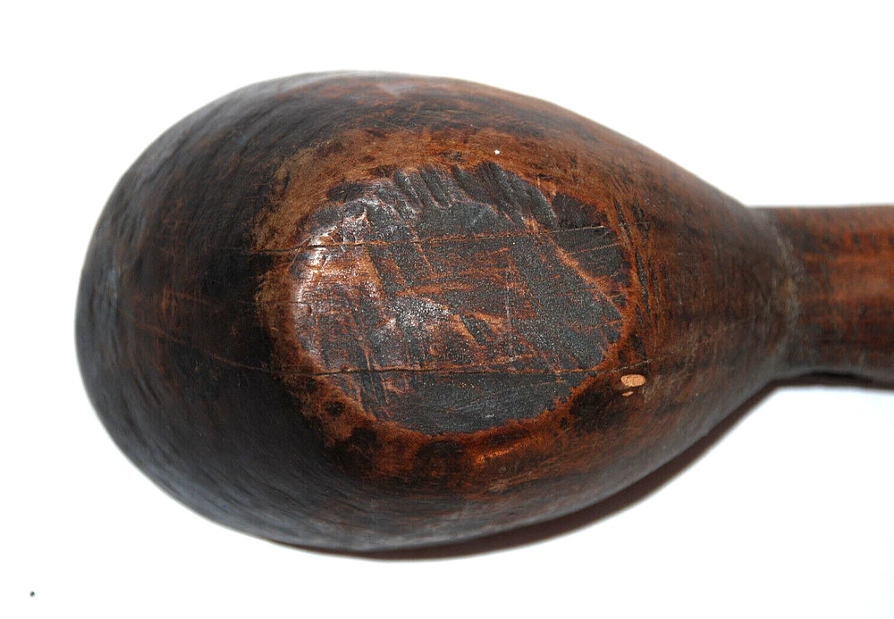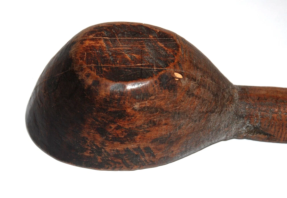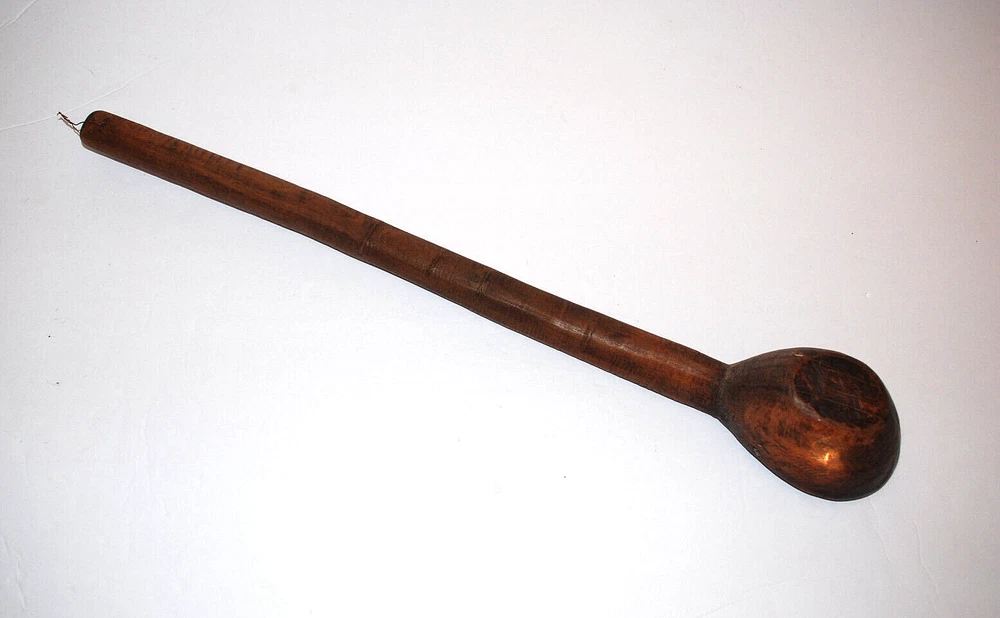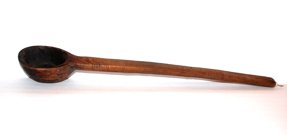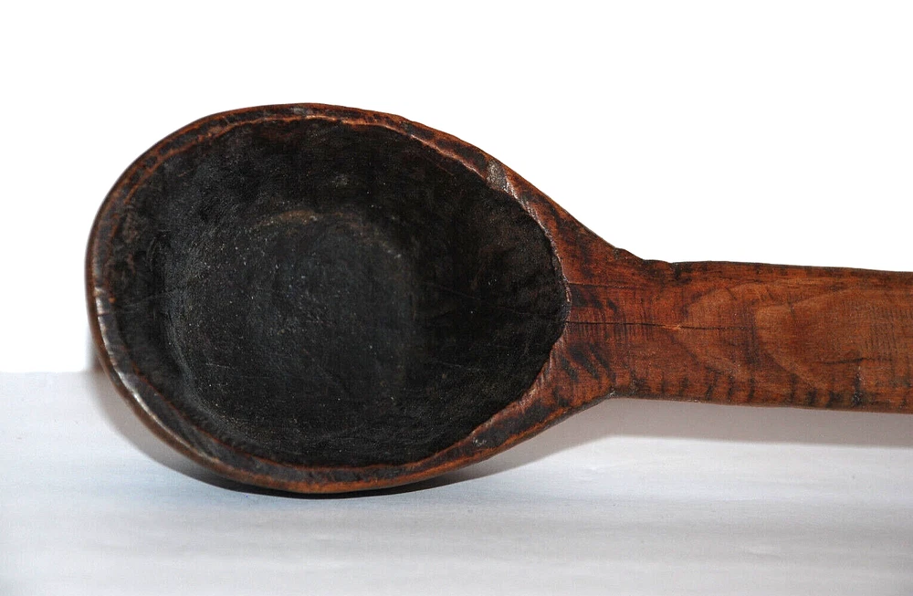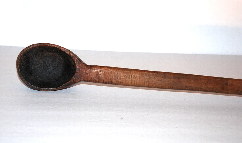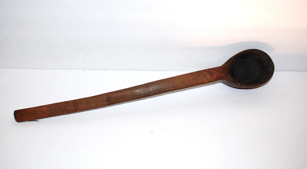 Antique Primitive Hand Carved Wooden Kitchen Spoon Farmhouse Rustic 19 3/4" Old. The spoon measures 19 3/4" long including handle. The bowl of the spoon measures 4" long by 3" wide by 2 1/8" tall. The spoon is in nice pre owned antique condition. A great looking hanging piece for your kitchen wall.