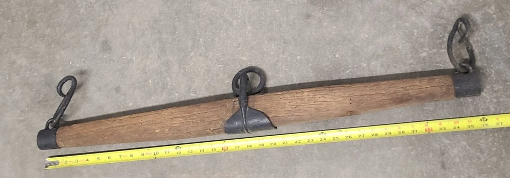 This is for a Antique Primitive Wood Cast Iron OX HORSE FARM Yoke Single Tree 36" Barn County. This is a well made yoke with iron end caps each with tear drop shape rings with hook's(see pictures) and a 3" ring in the center. The over all length is about 36" long and it's about 3" thick. This is very solid in great condition for it's age. Thanks for looking!