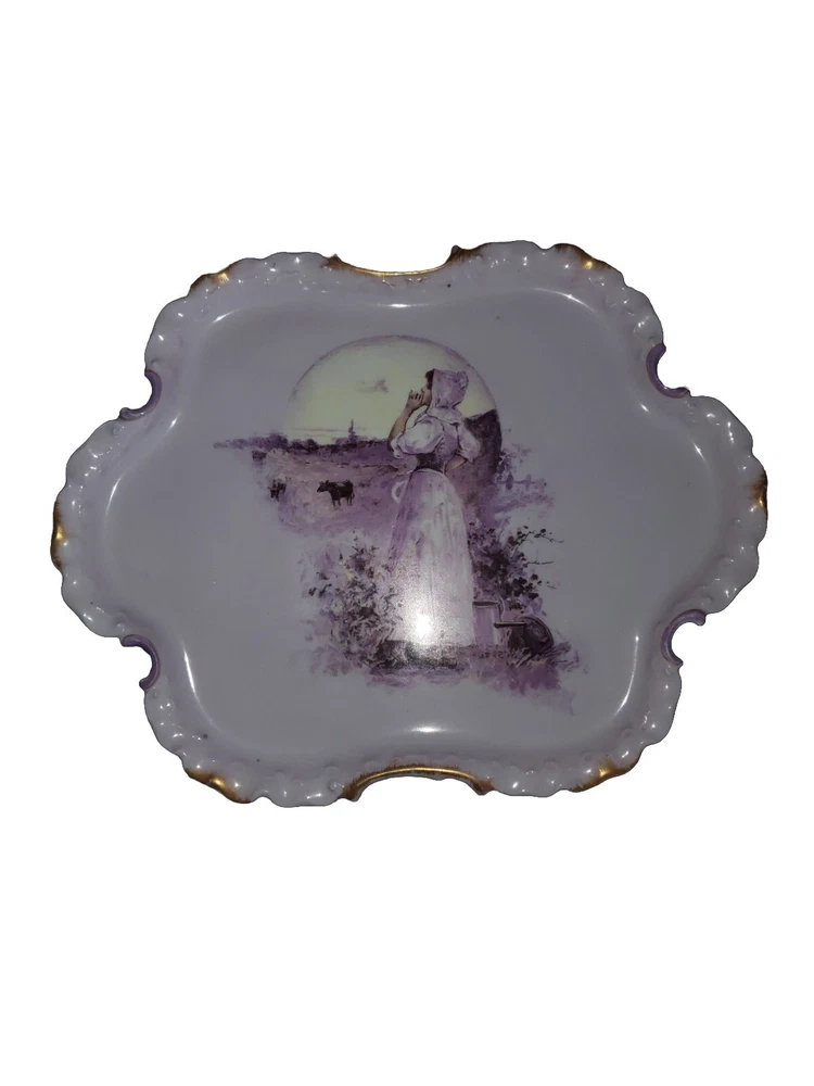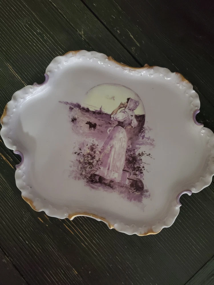 This antique bread plate features a beautiful design of a girl in a field, made by Rosenthal during the time period of 1850-1899 in Germany. The plate is made of ceramic material and has a stunning purple color. It would make a great addition to any collection of decorative cookware, dinnerware, or serveware. The plate is pre-owned, but has been well-maintained and is in great shape for its age.