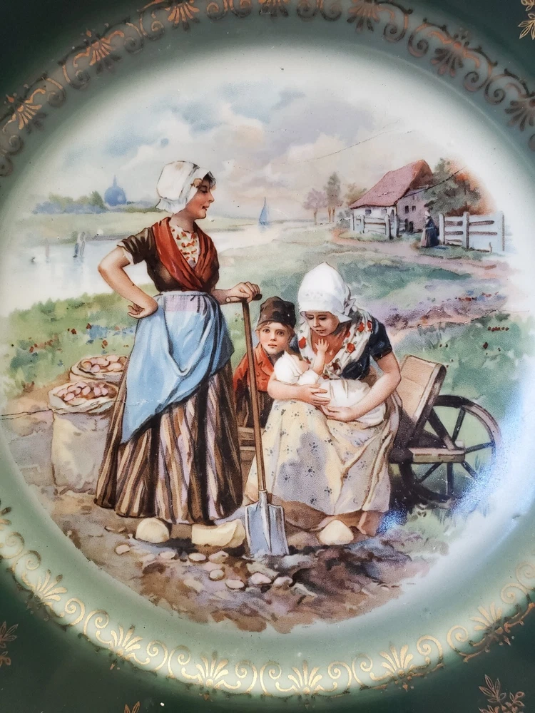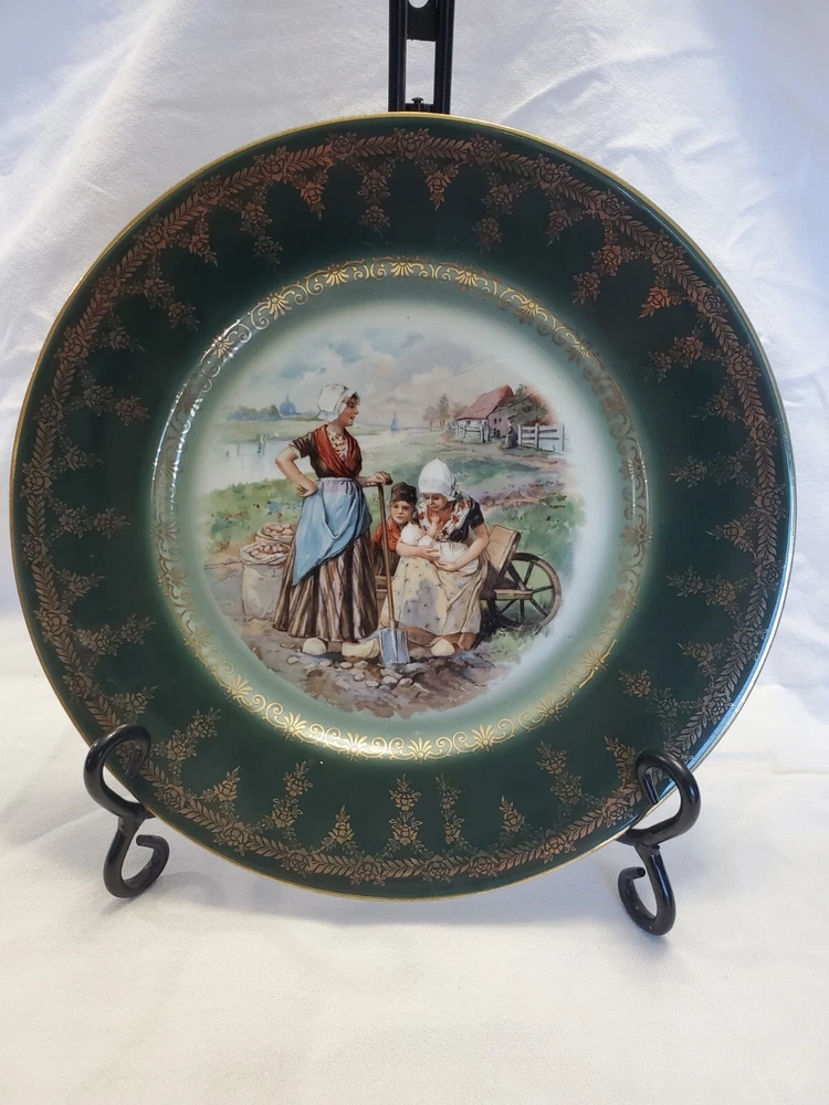Royal Vienna plate w/ beehive mark on back. Pastoral farming scene w/ women and children. Dark green edge w/ gold accents. 10" diameter.