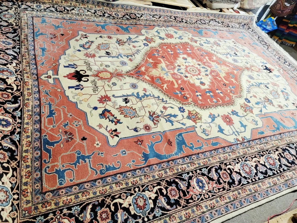The product is a unique Antique Serapi Style Sultanabad Rug, hand-knotted with wool and measuring 10x14 feet. This multicolor rug features a traditional medallion pattern, typical of Sarabi-Serapi designs. Handmade and originating from the Asian culture, this antique rug is a timeless piece that can add a touch of elegance to any room. Its hand-knotted weave and high-quality material make it a durable and stylish addition to any home décor.