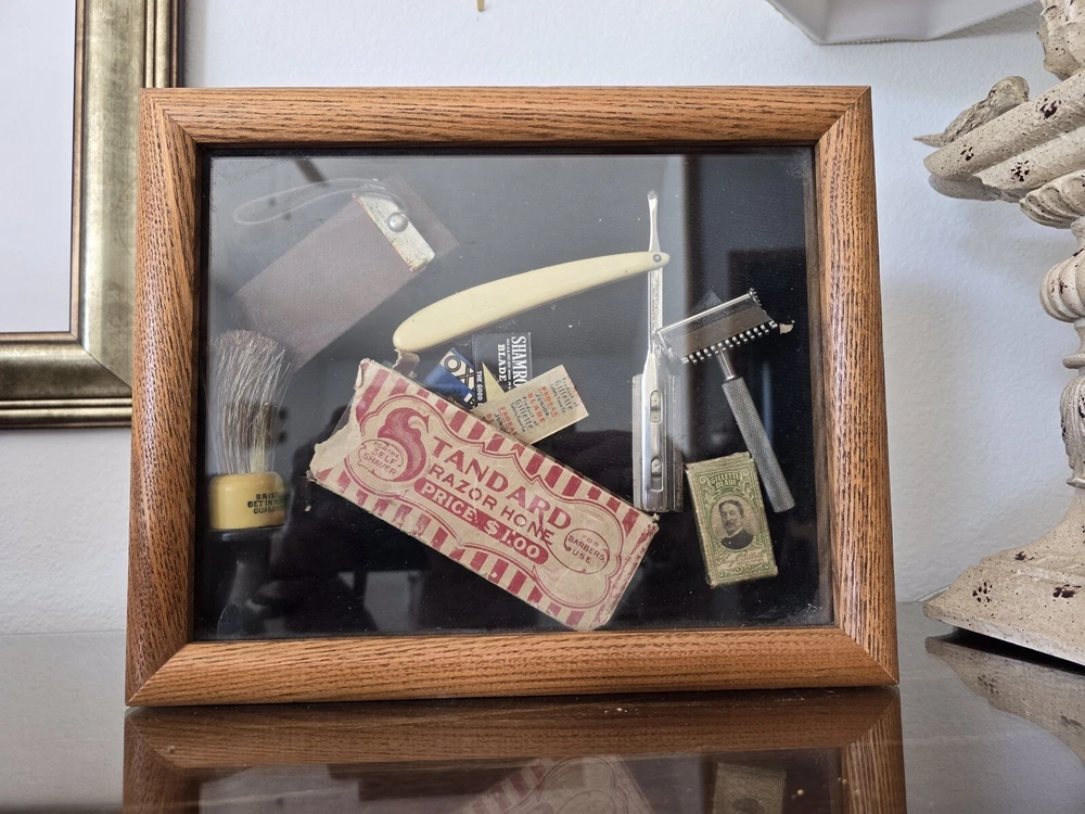 Antique shaving items includes US Army Gillette shaver with original blades, straight edge shaver with what looks like an ivory handle. Hone in original box, two boars hair shaving brushes, shaving mug, leather razor strop and other blades.