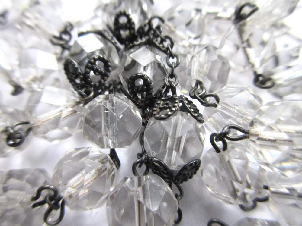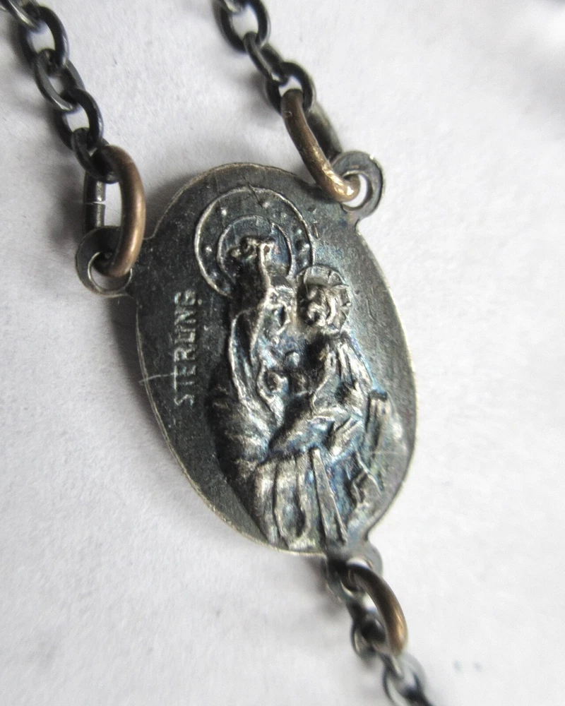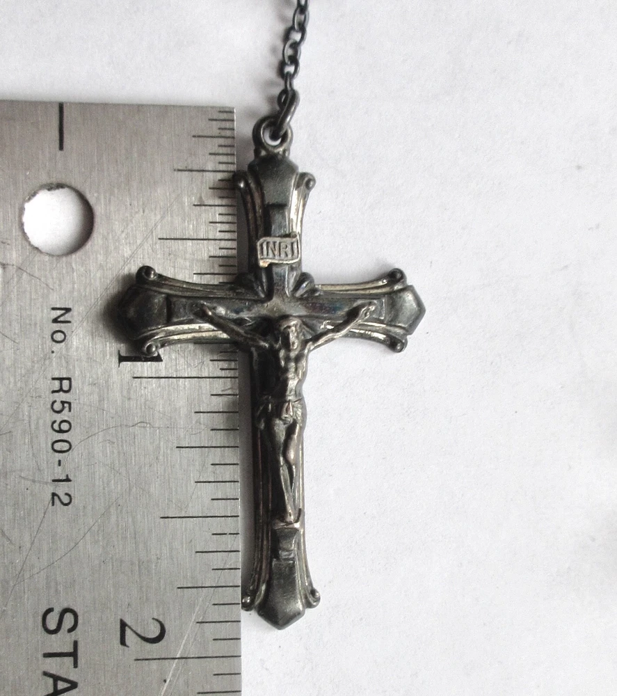 Sterling Silver CRYSTAL BEADS ROSARY Pre-1930 Unsigned Antique rosary with faceted clear transparent crystal beads. Beads vary slightly in size due to early bead manufacturing process. Some faceted edges may have nicks/bites. No major breaks or cracks. Crucifix and oval station both marked, "STERLING." Original patina left unpolished. CRUCIFIX: 1 7/8" Long x 1 1/8" Wide ROSARY LENGTH: 24" Long top to bottom (Long enough to wear around neck.) Sellers items are all in as-found, used vintage/antique conditions. Please contact seller w/any questions/concerns BEFORE bidding.