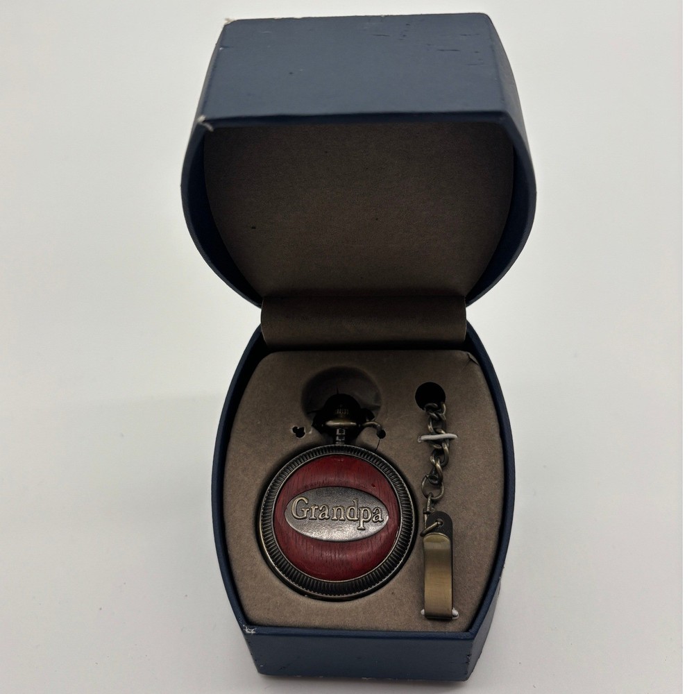 Antique style Grandpa pocket watch presented in a blue hinged display box. The watch face is gold-toned with black Arabic numerals and hands. The front cover of the pocket watch features a circular red wood inlay with the word 'Grandpa' engraved in a silver-toned font. A metal chain with a clip attachment is included. The back of the watch and the inside of the cover have an embossed honeycomb pattern. This pocket watch is a thoughtful gift for a grandfather. Department: Unisex Adults Movement: Quartz Case Material: Brass Case Color: Brown, Silver Dial Color: Yellow Gold Features: 12-Hour Dial, Includes Chain, Seconds Hand, Luminous Hands Style: Steampunk Type: Pocket Watch Display: Analog Indices: Arabic Numerals Water Resistance: Not Water Resistant Closure: Full Hunter Keywords: pocket watch, grandfather gift, engraved watch, vintage style, collectible, keepsake, anniversary gift, birthday gift, timepiece, chain watch, gift boxed, decorative, heirloom **Sold by a Proud Military Family** ~10% of every item I sell is donated to our charity - Veterans Community Project. Please visit my store for all the items I have listed to help this great cause. If you loved this item, please visit my store for more items like it! Please remember to share the love with a positive feedback! • I ship within 2 business days • All items come from a pet-friendly, smoke-free home