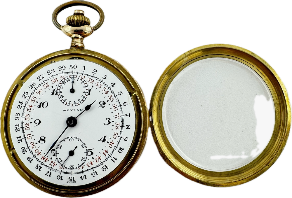 Antique Meylan Mechanical Chronograph Pocket Watch Gold Plated Swiss for Parts Product Description Item: Pocket Watch Brand: Meylan Movement: Mechanical Chronograph Case Material: Gold Plated Gender: Unisex Product Measurements Diameter: 51mm Product Condition Ok, overall condition for its age. Not running, the balance complete is good though. There are scratches on the case. There are scratches on the crystal. It is missing the chronograph wheel.