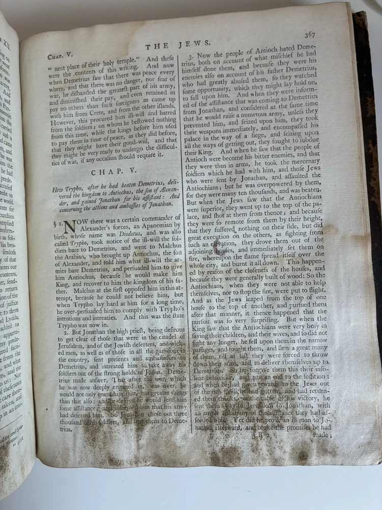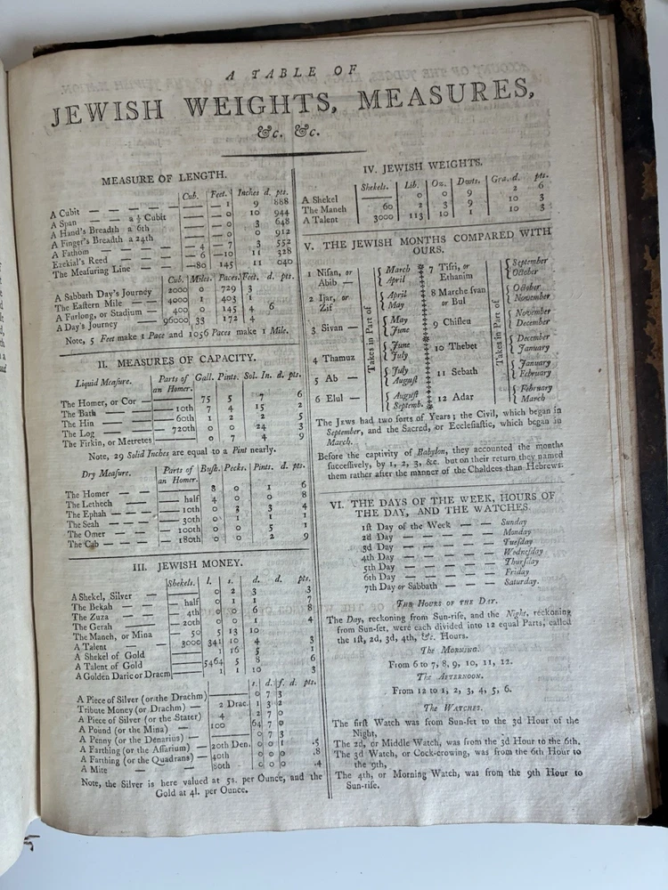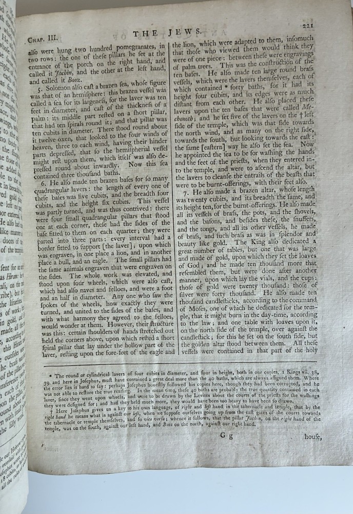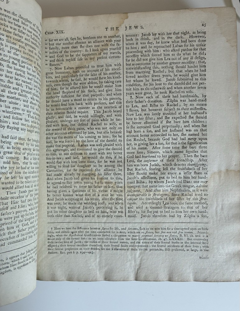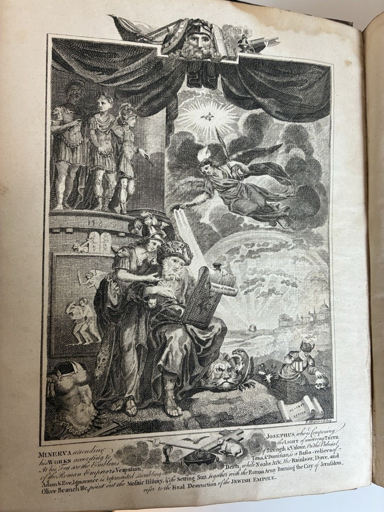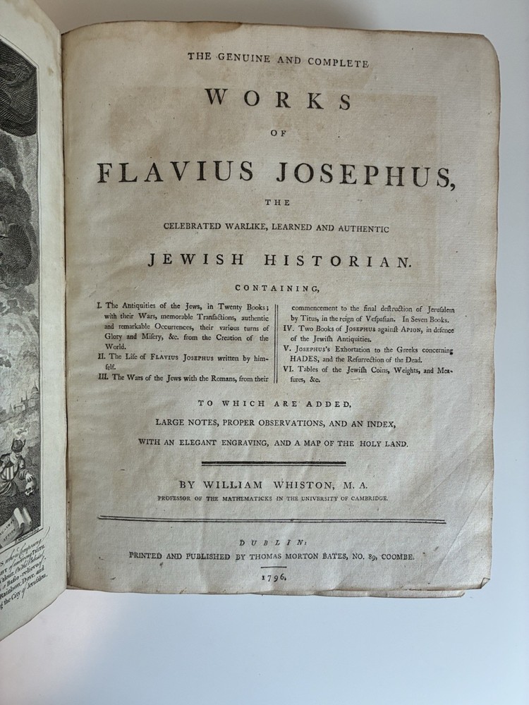 Binding is intact but very fragile. Discolouration on pages and some staining which occurred at some point. This book will be wrapped in acid free paper, which in turn will be bubble wrapped and shipped in a box to ensure it remains safe in shipping. Will reach out to buyer to confirm preferences for signature on delivery etc. The genuine works of Flavius Josephus, the Jewish historian. Translated from the original Greek, according to Havercamp's accurate edition. Containing twenty books of the Jewish antiquities, with the appendix, or life of Josephus, written by himself: seven books of the Jewish war: and two books against Apion. Illustrated with plans and descriptions of the tabernacle of Moses; and of the temples of Solomon, Zorobabel, Herod, and Ezekiel; with maps of Judea and Jerusalem. Includes an account of the Jewish coins, weights, and measures. By William Whiston.