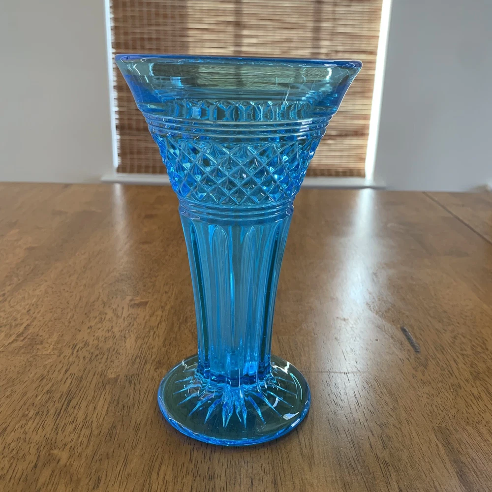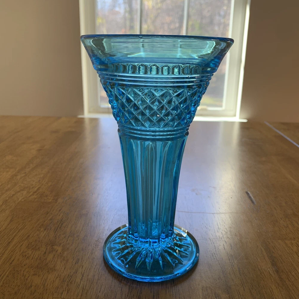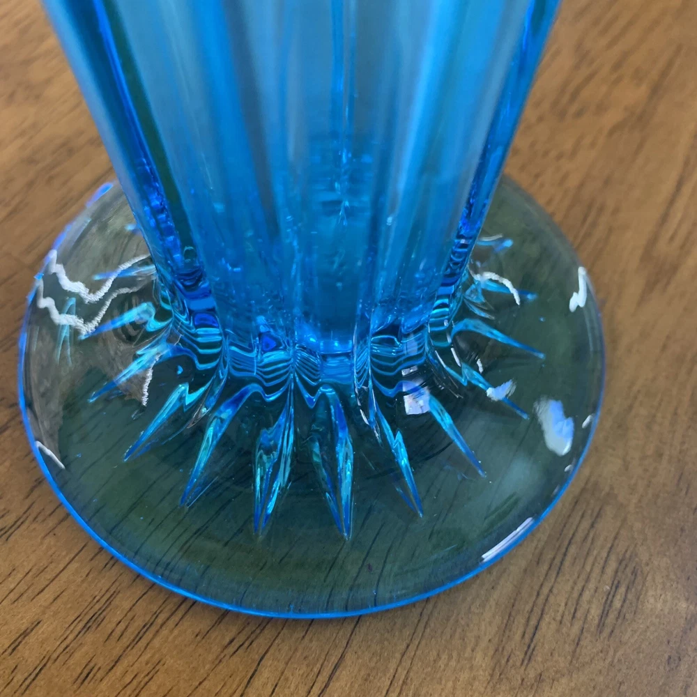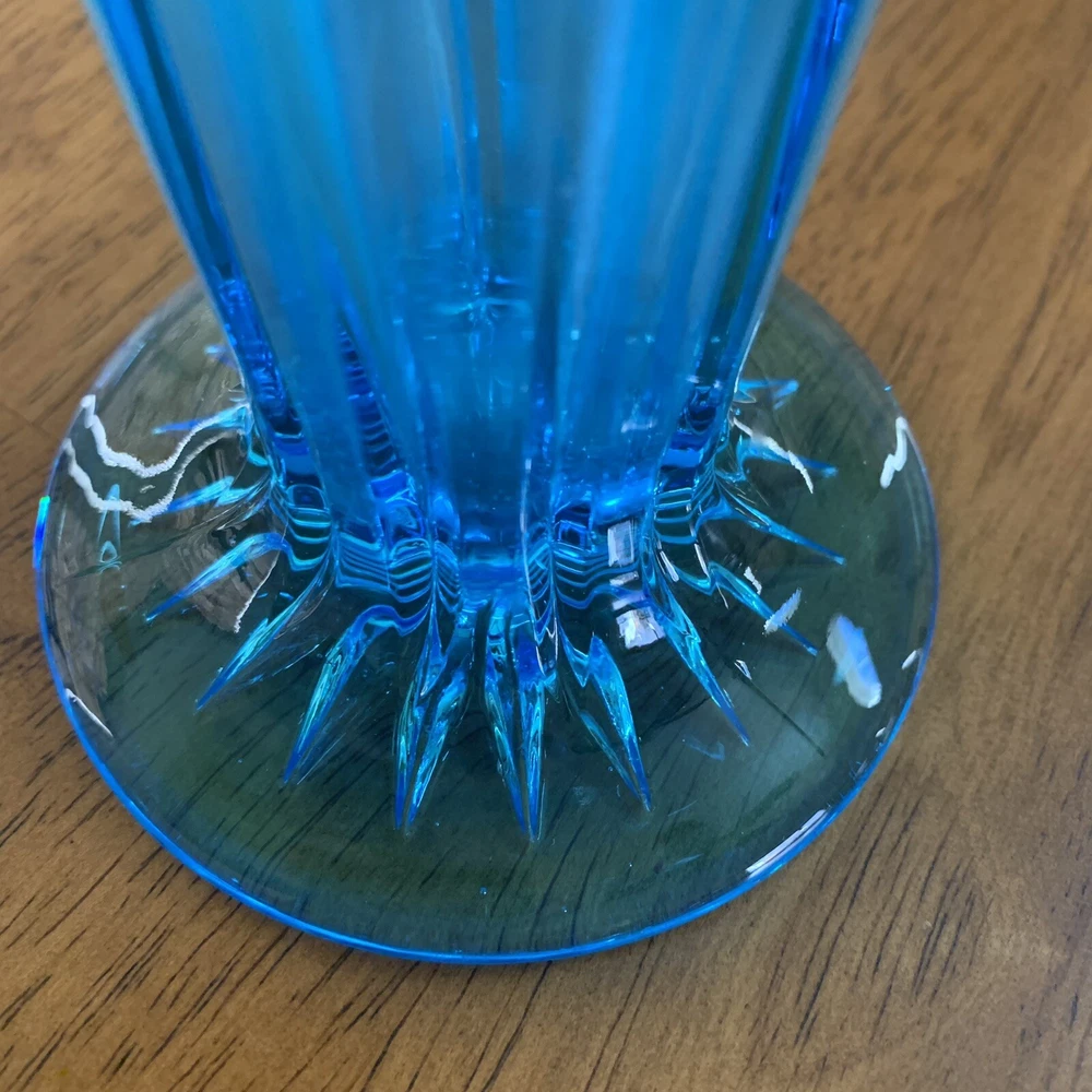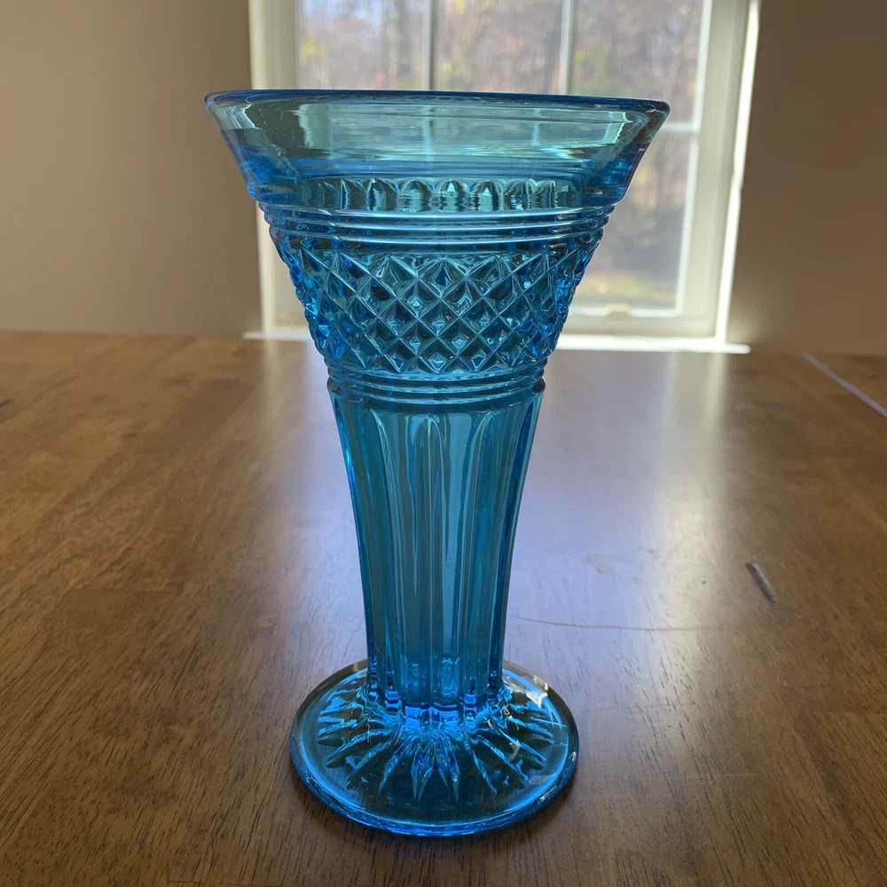 Gorgeous Tiffin-Francisan Baronial Blue Vase Rare Find 1920s. This is a really pretty blue color. Very small chip on upper outside rim as pointed out in picture number 7. Size of chip is approximately the diameter of tip of pointer. Small amount of wear on inside of upper rim most likely consistent with age. No other chips cracks. Please see photos.