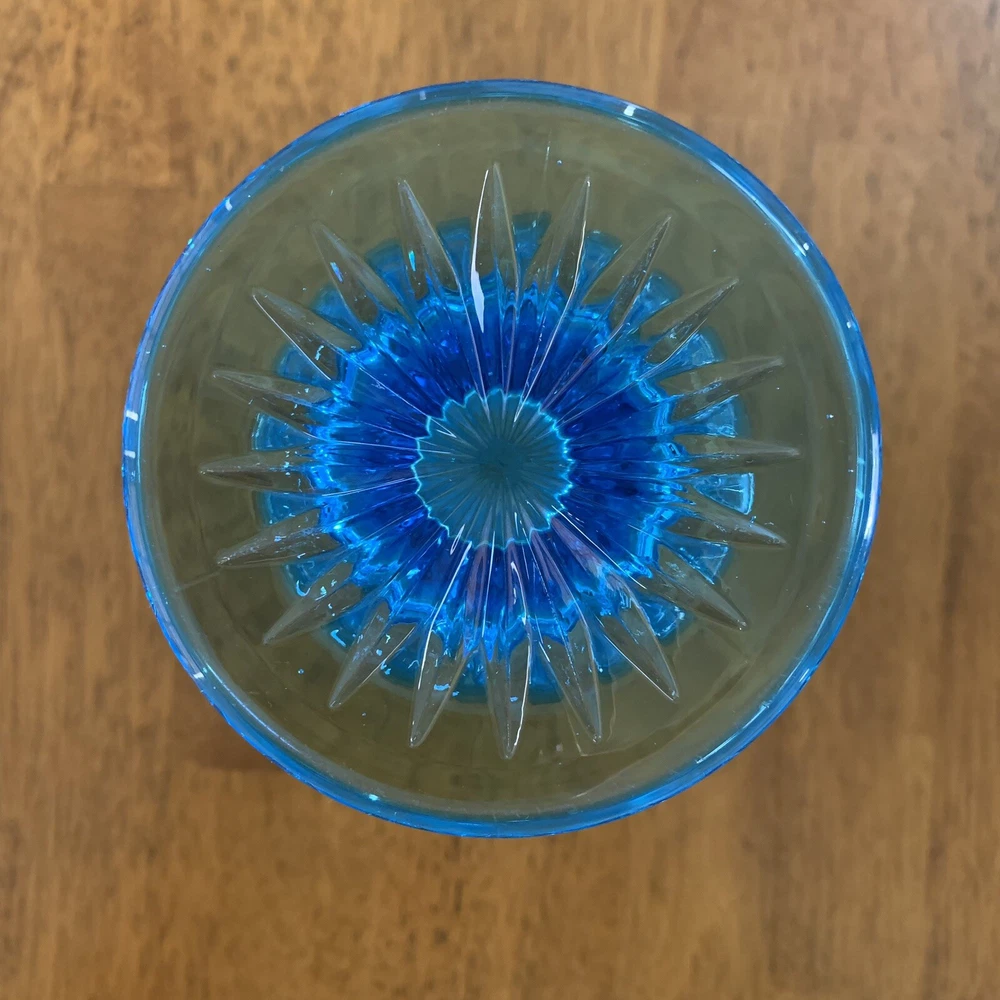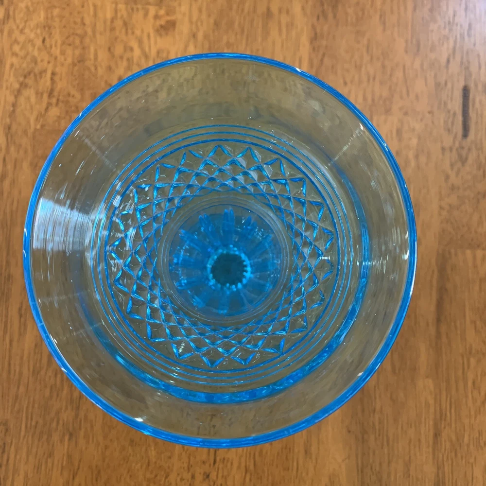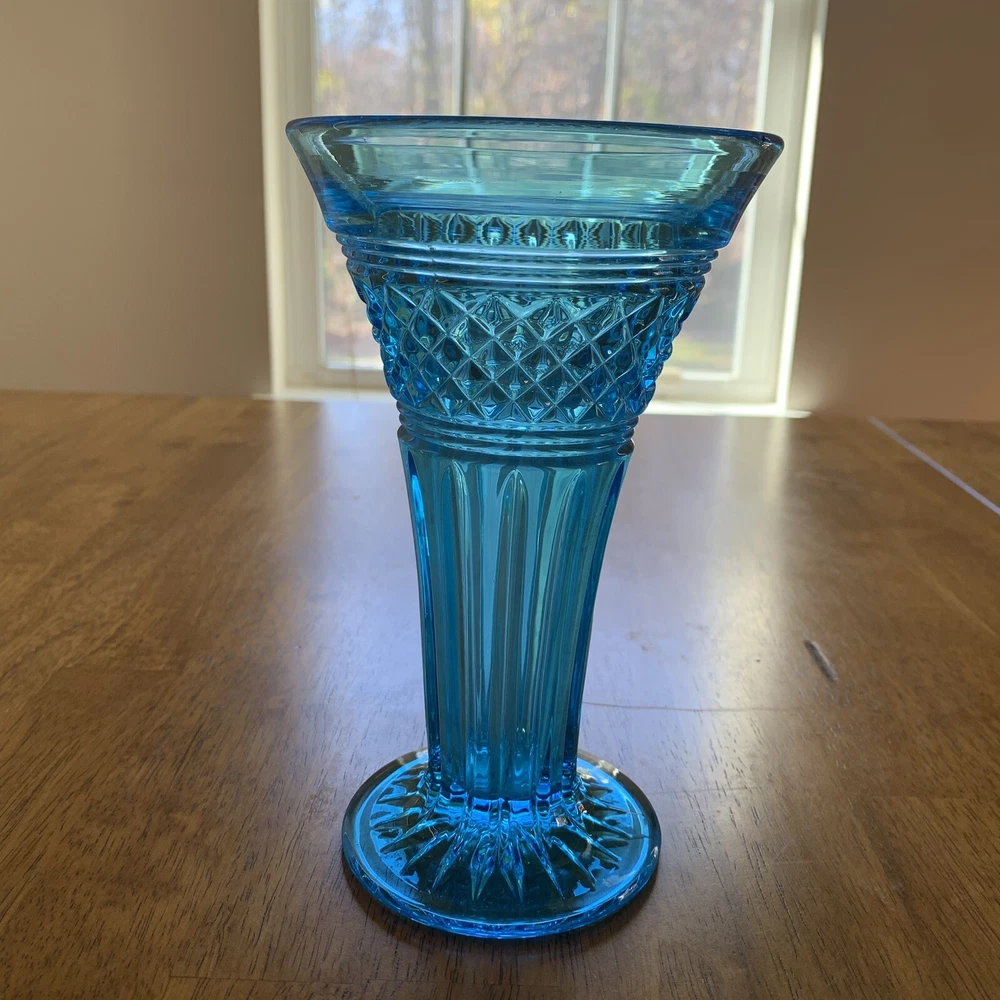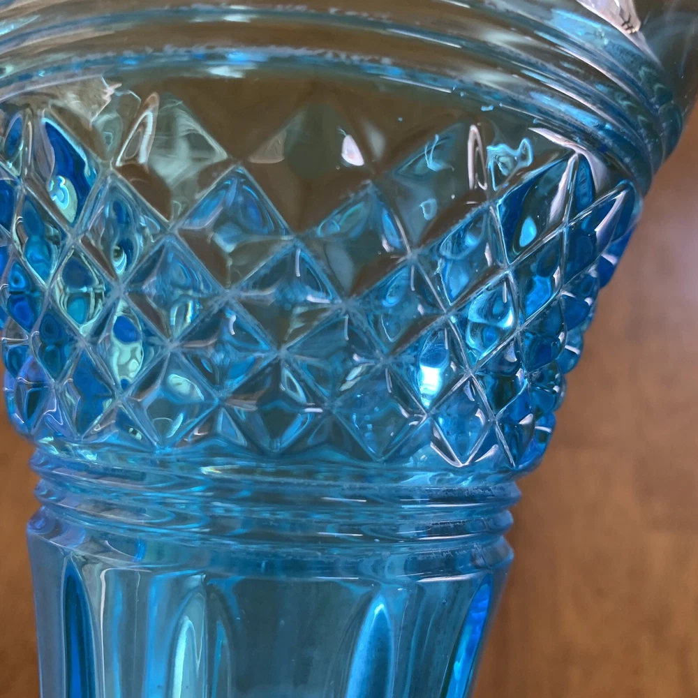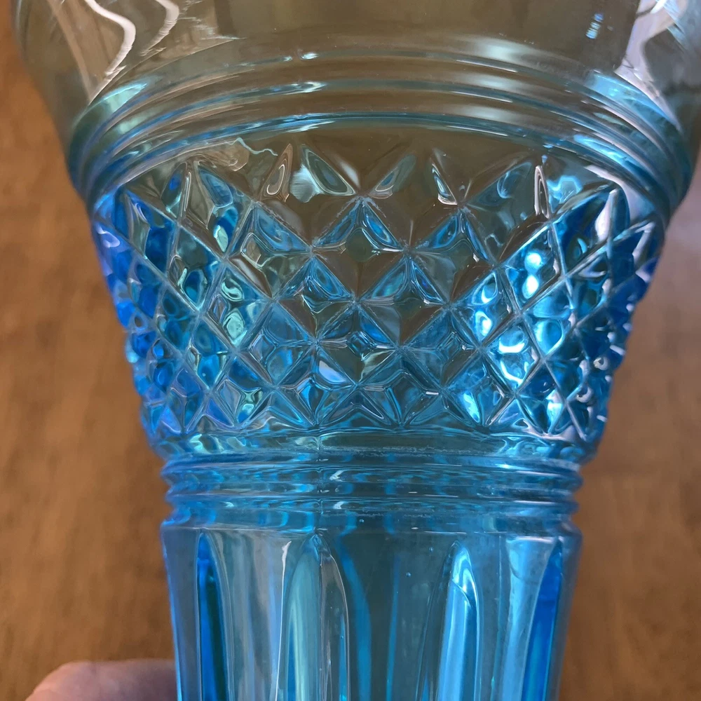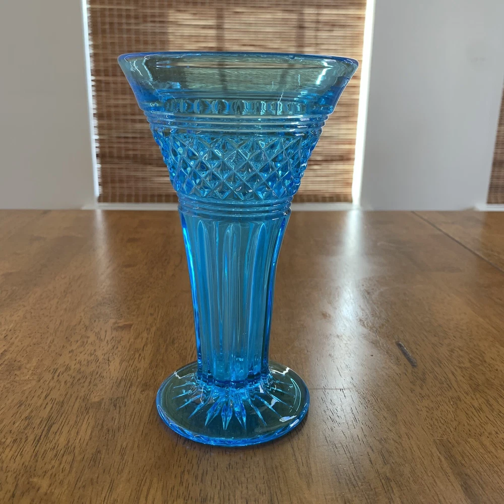 Gorgeous Tiffin-Francisan Baronial Blue Vase Rare Find 1920s. This is a really pretty blue color. Very small chip on upper outside rim as pointed out in picture number 7. Size of chip is approximately the diameter of tip of pointer. Small amount of wear on inside of upper rim most likely consistent with age. No other chips cracks. Please see photos.