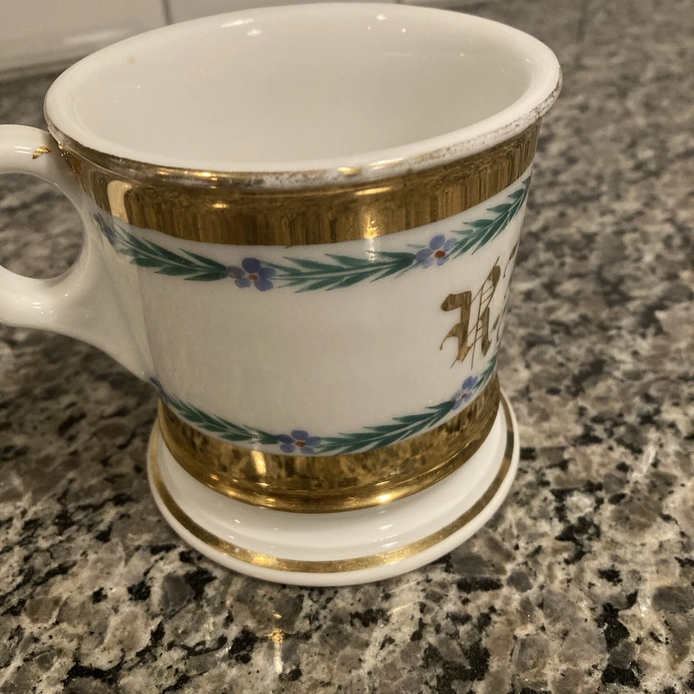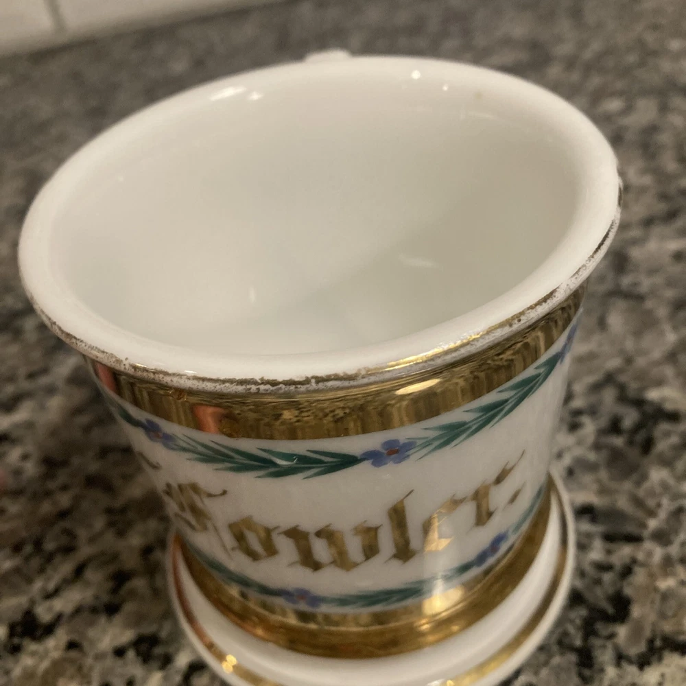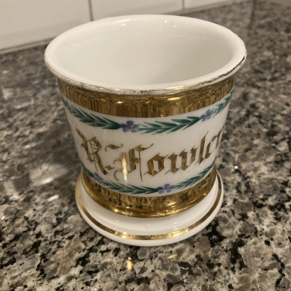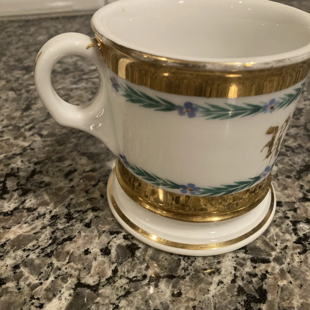 This antique shaving mug is a true gem for collectors. Made by Tressemanes & Vogt, it features a luxurious gold porcelain finish and was crafted in France. The mug is perfect for those who appreciate vintage shaving accessories and want to add a touch of elegance to their collection. It's ideal for use or as a display piece, and would make a great gift for any shaving enthusiast. The mug is categorized under Collectibles, Vanity, Perfume & Shaving, and Shaving, and is sure to be a prized possession for years to come. Add this exquisite piece to your collection today! 4” x 4”