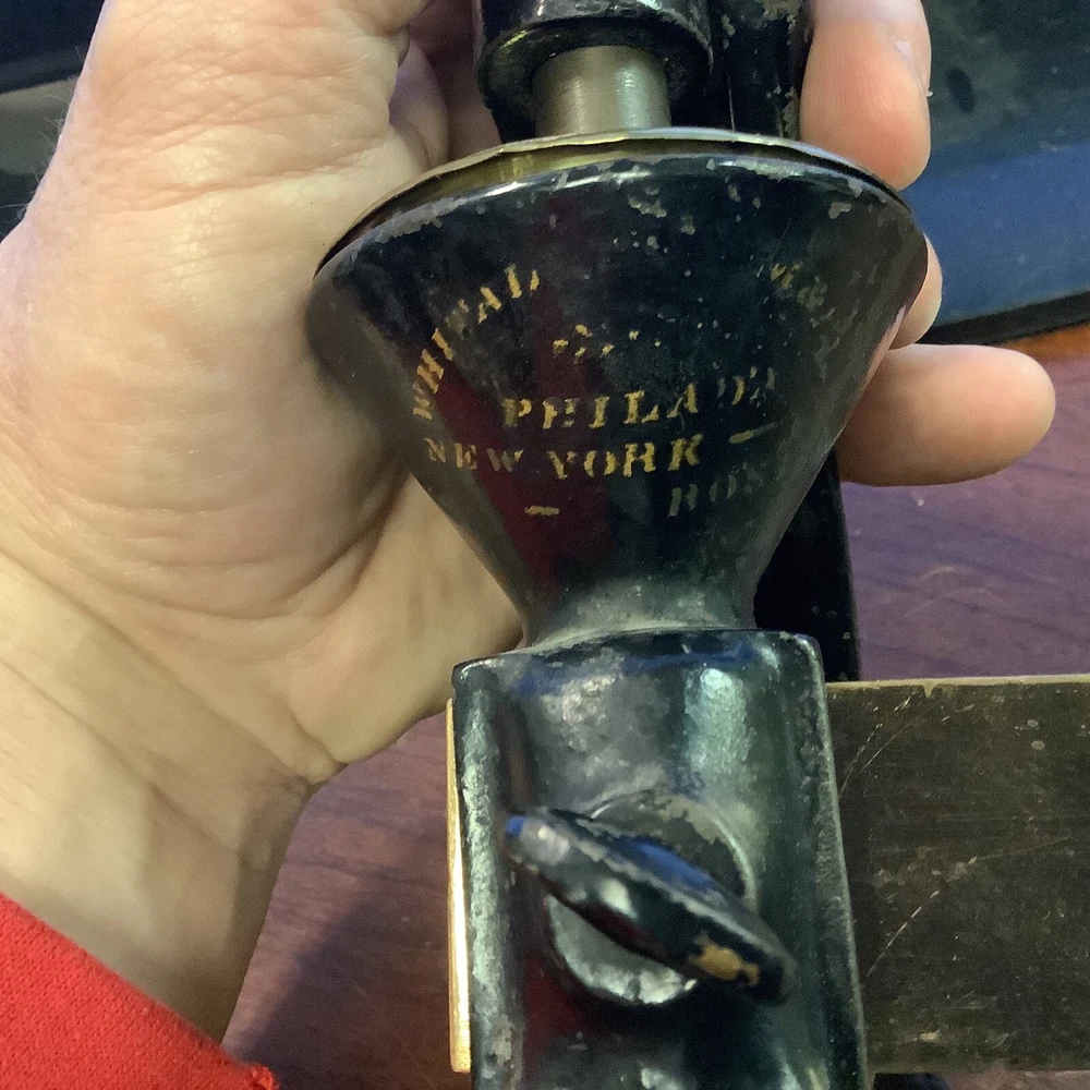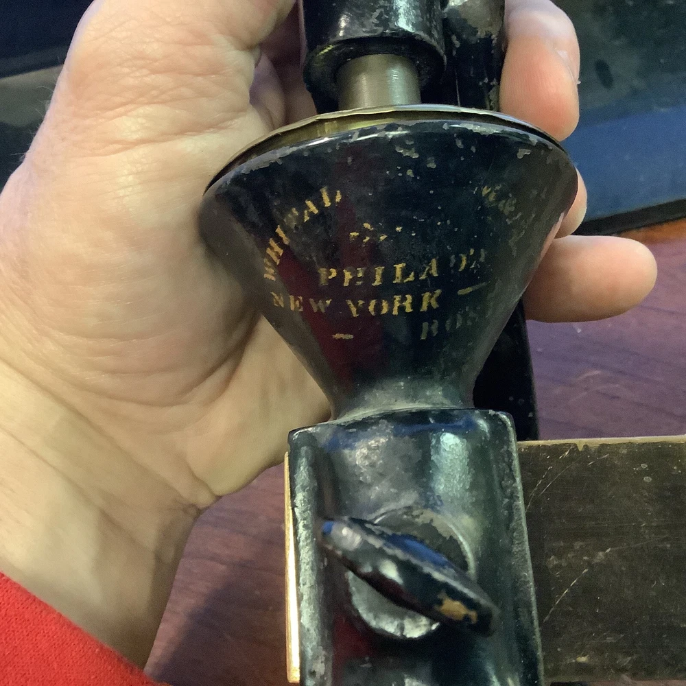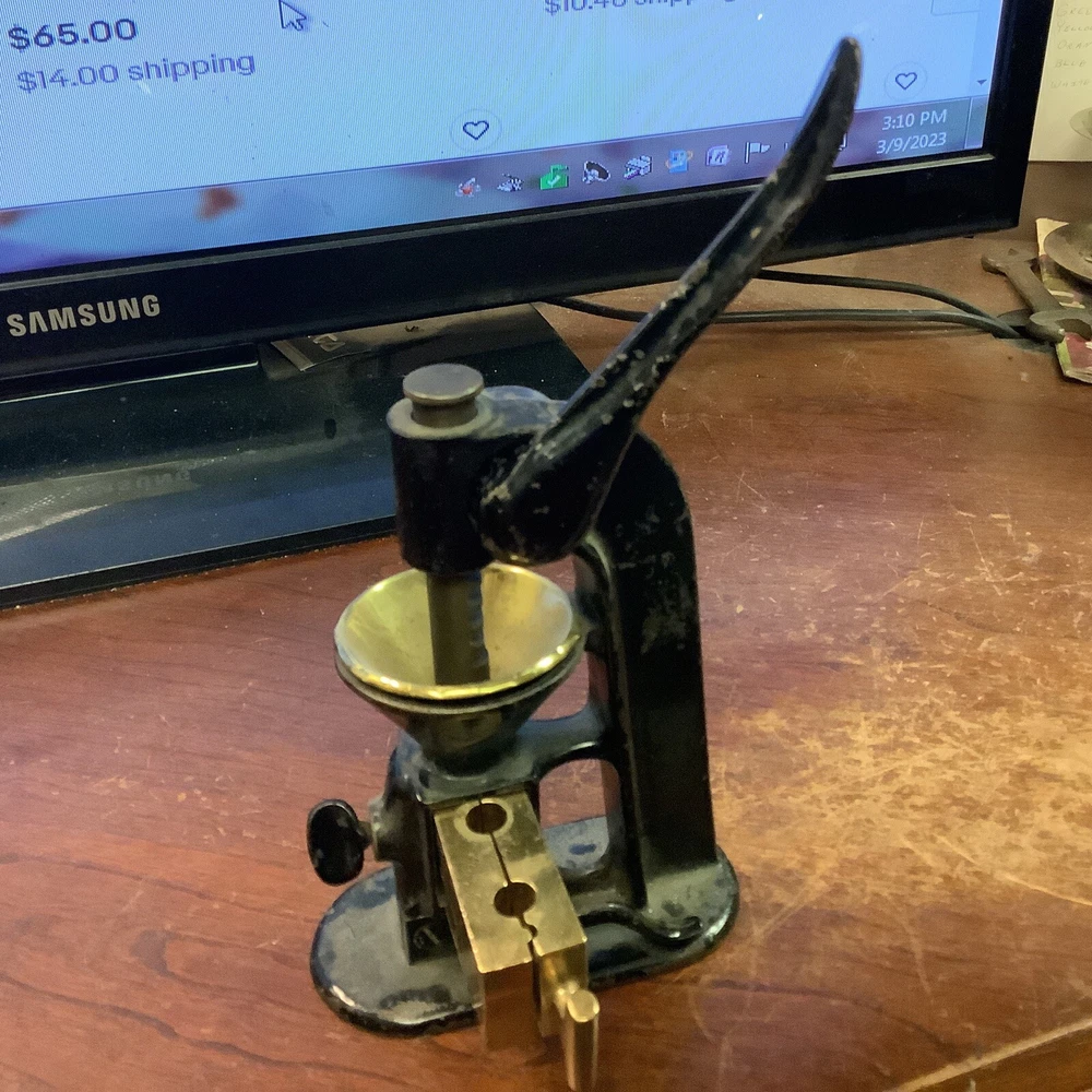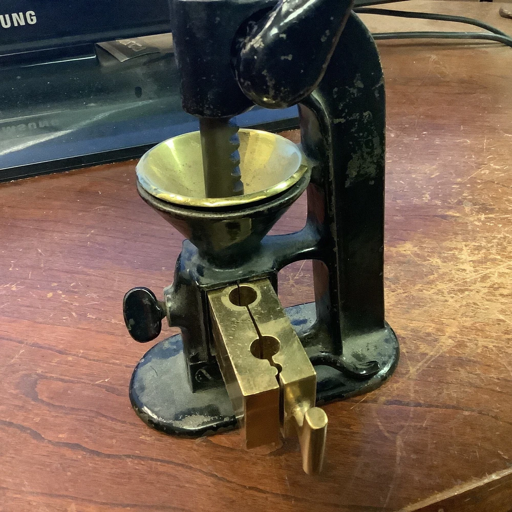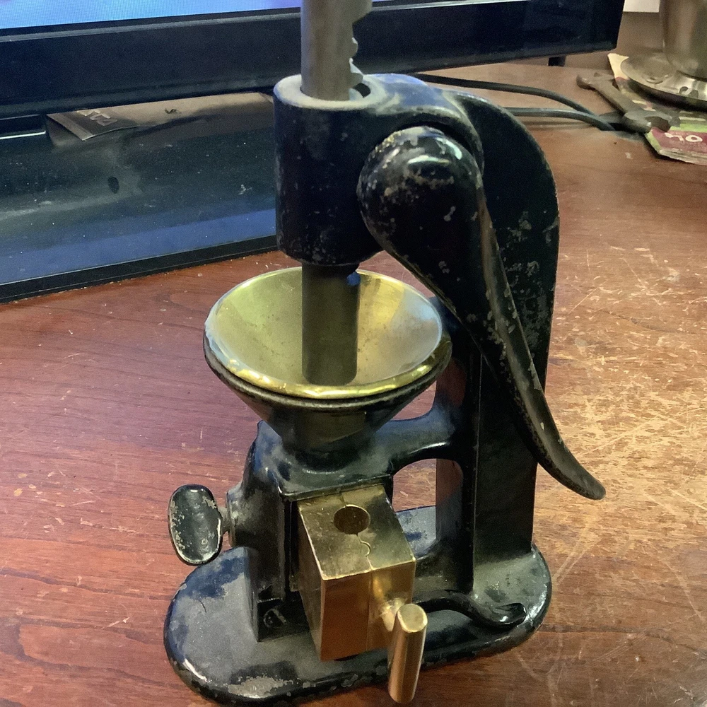Antique Type suppository Press Rare Piece Black Powder(not sure of its age). This is used an very old black powder press.very cool piece.i do not know a lot about this as i can not read the name on the front.it was my grandfathers.very very old.if you can identify this please let me know as i would appreciate it.thank you. (HW)cabinet